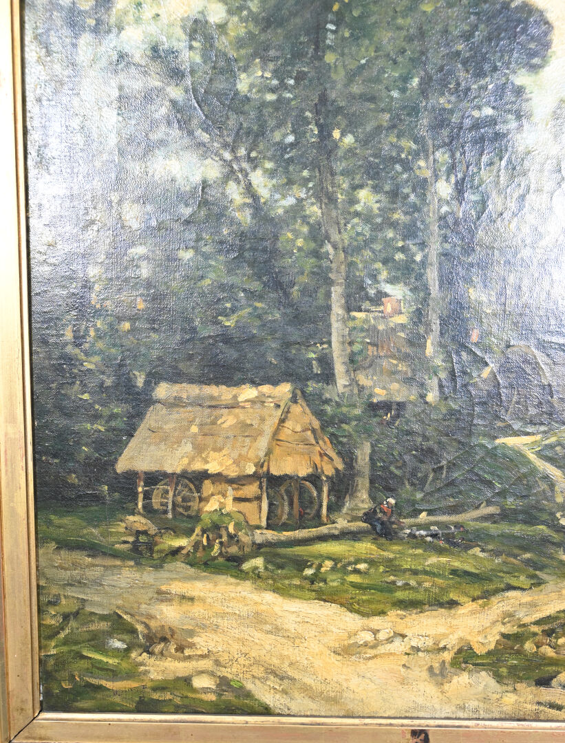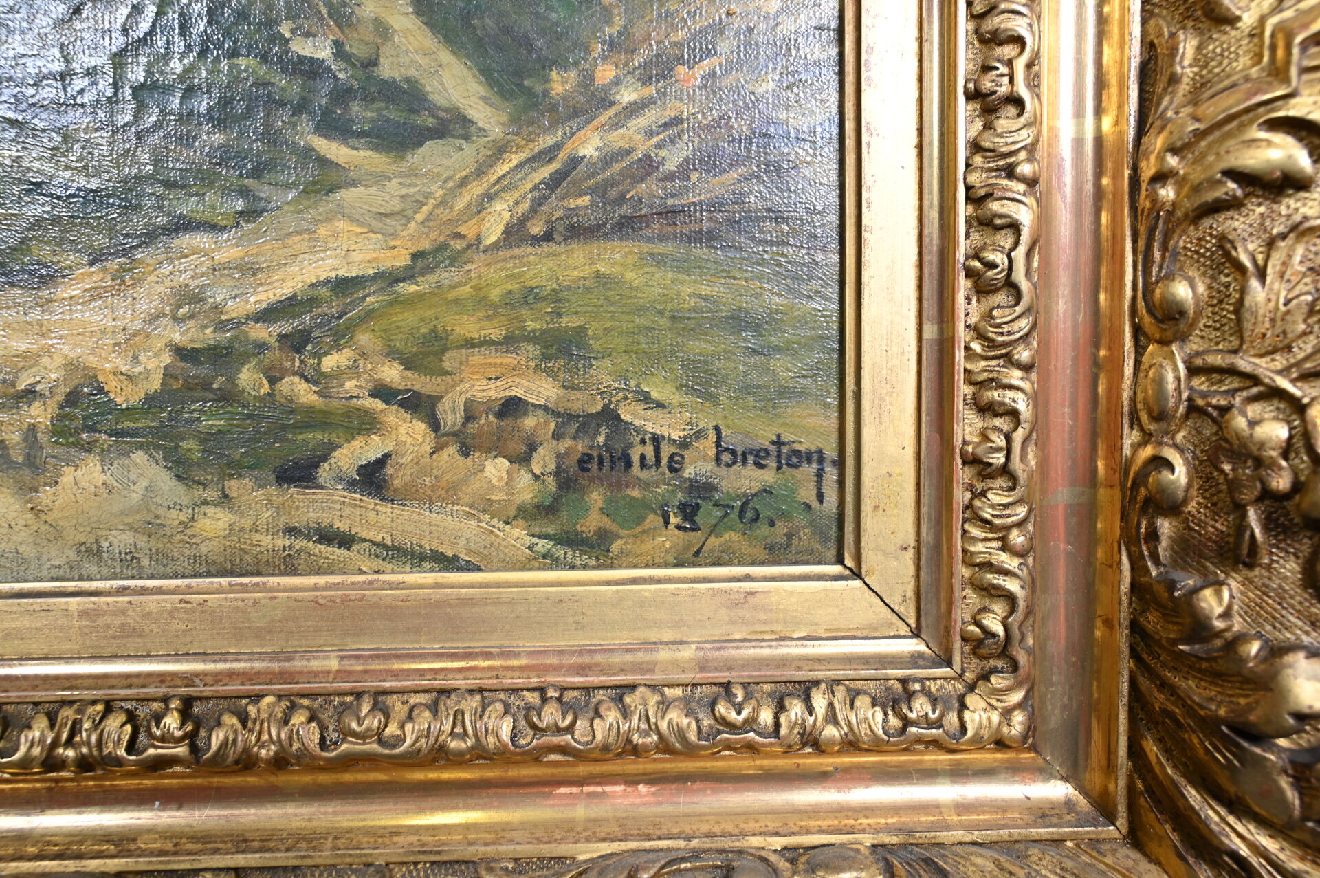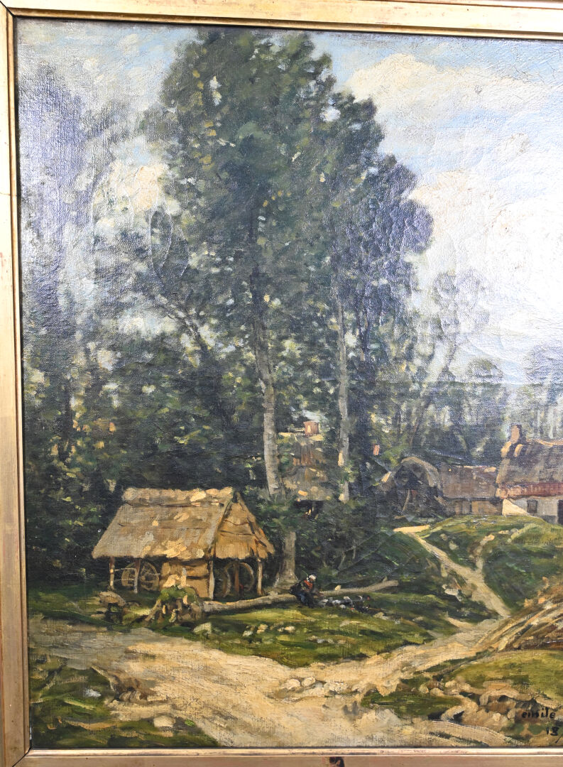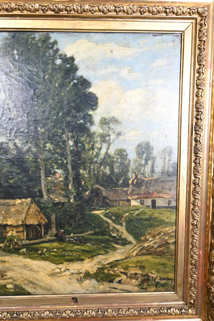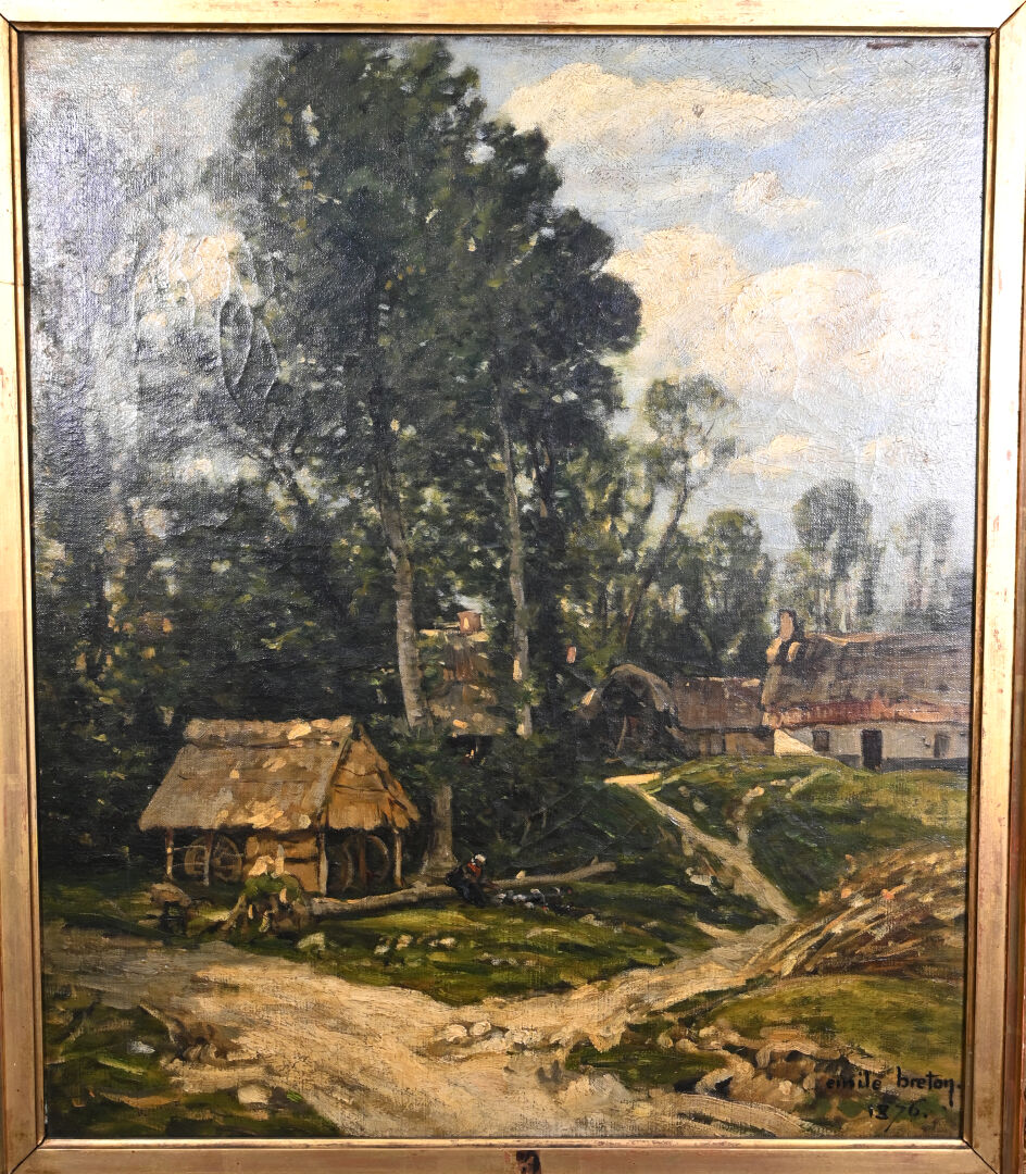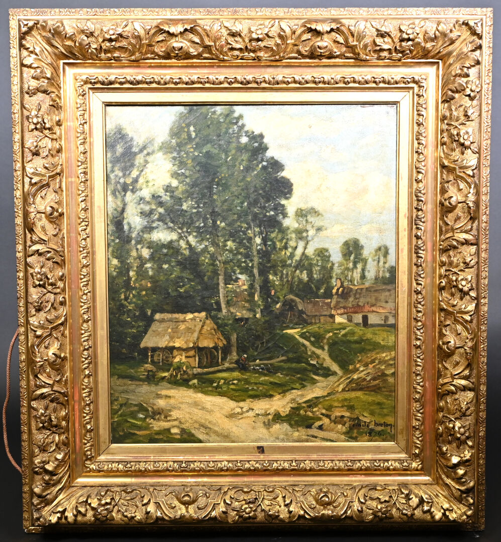 Emile Adélard BRETON (1831-1902). Le hameau Huile sur toile signée et daté 1878 en bas à droite (quelques petits repeints, ancienne étiquette de salon). 50,5 x 43 cm.