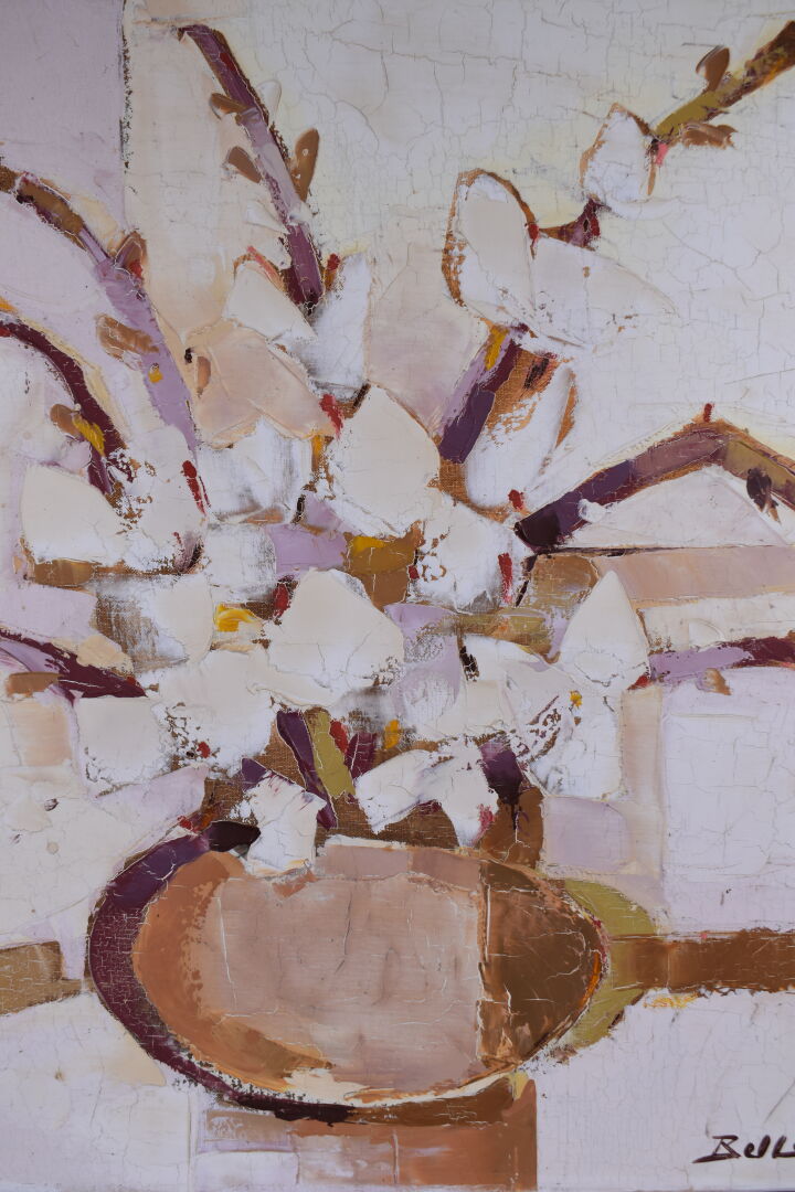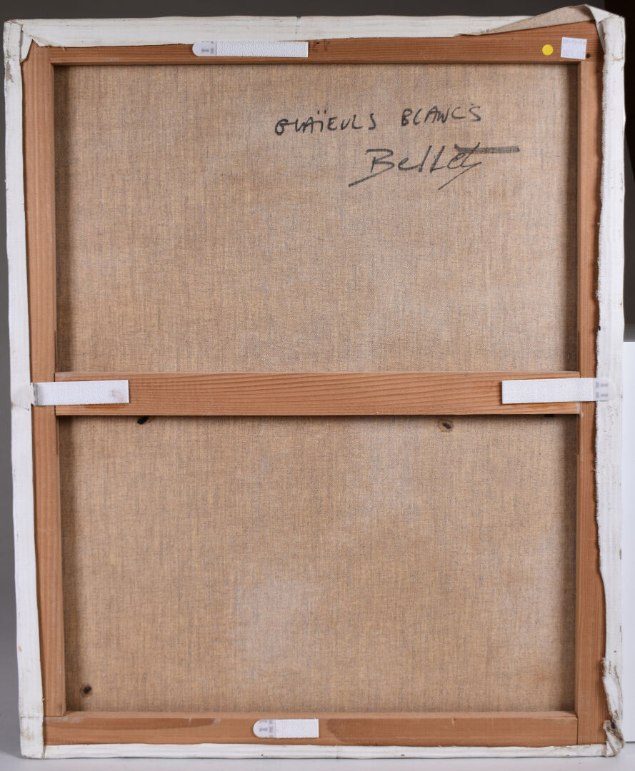 Emile BELLET (Né en 1941). « Glaïeuls blancs ». Huile sur toile signée en bas à droite, contre signée et titrée au dos (enfoncement). 62 x 50 cm.