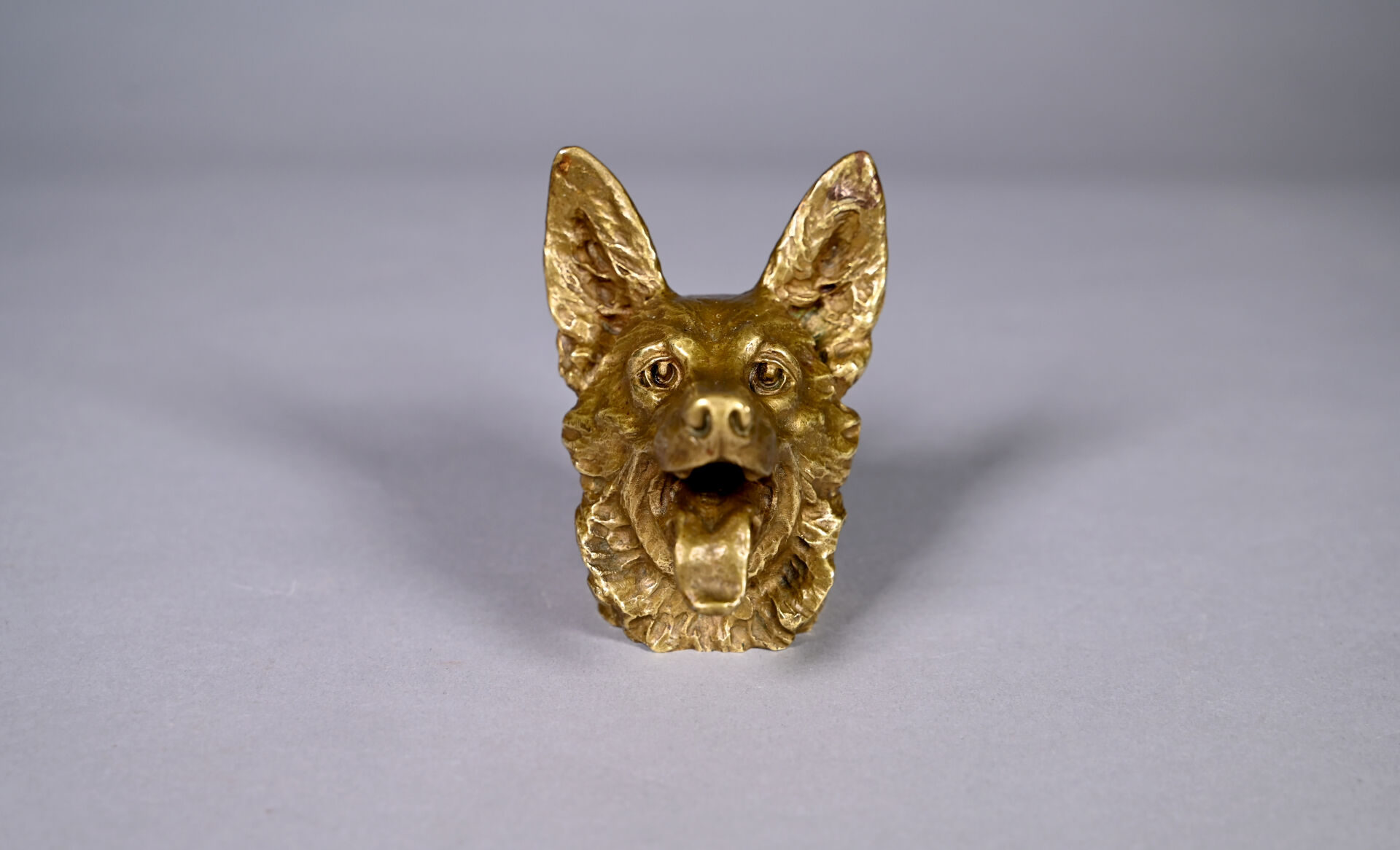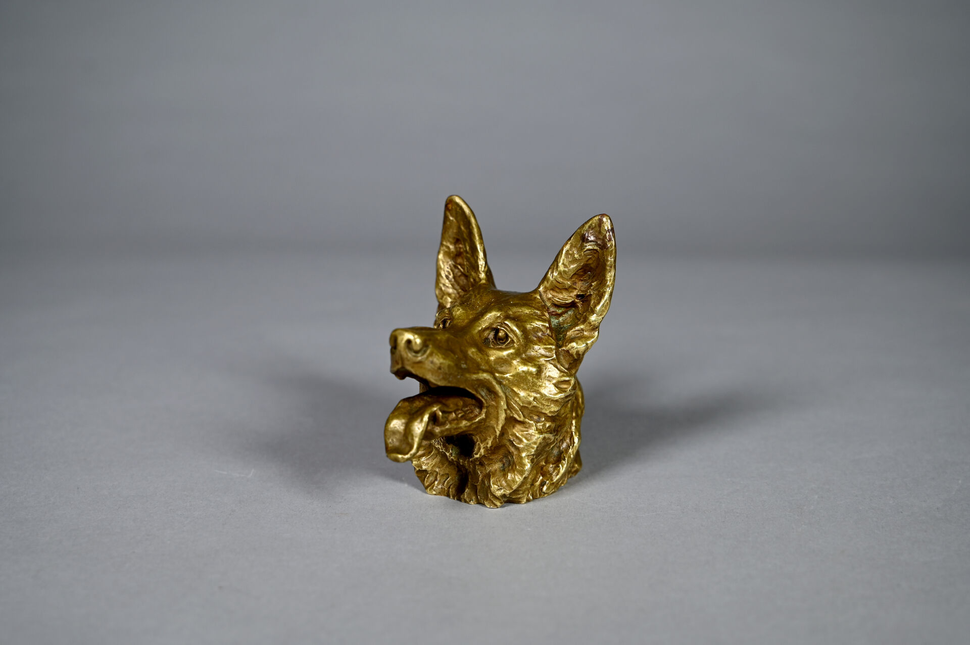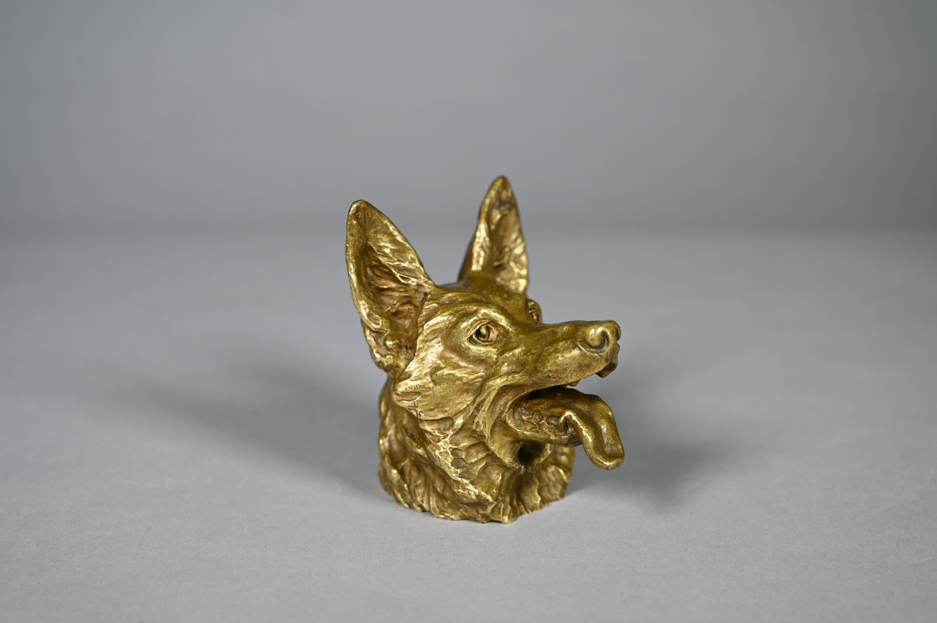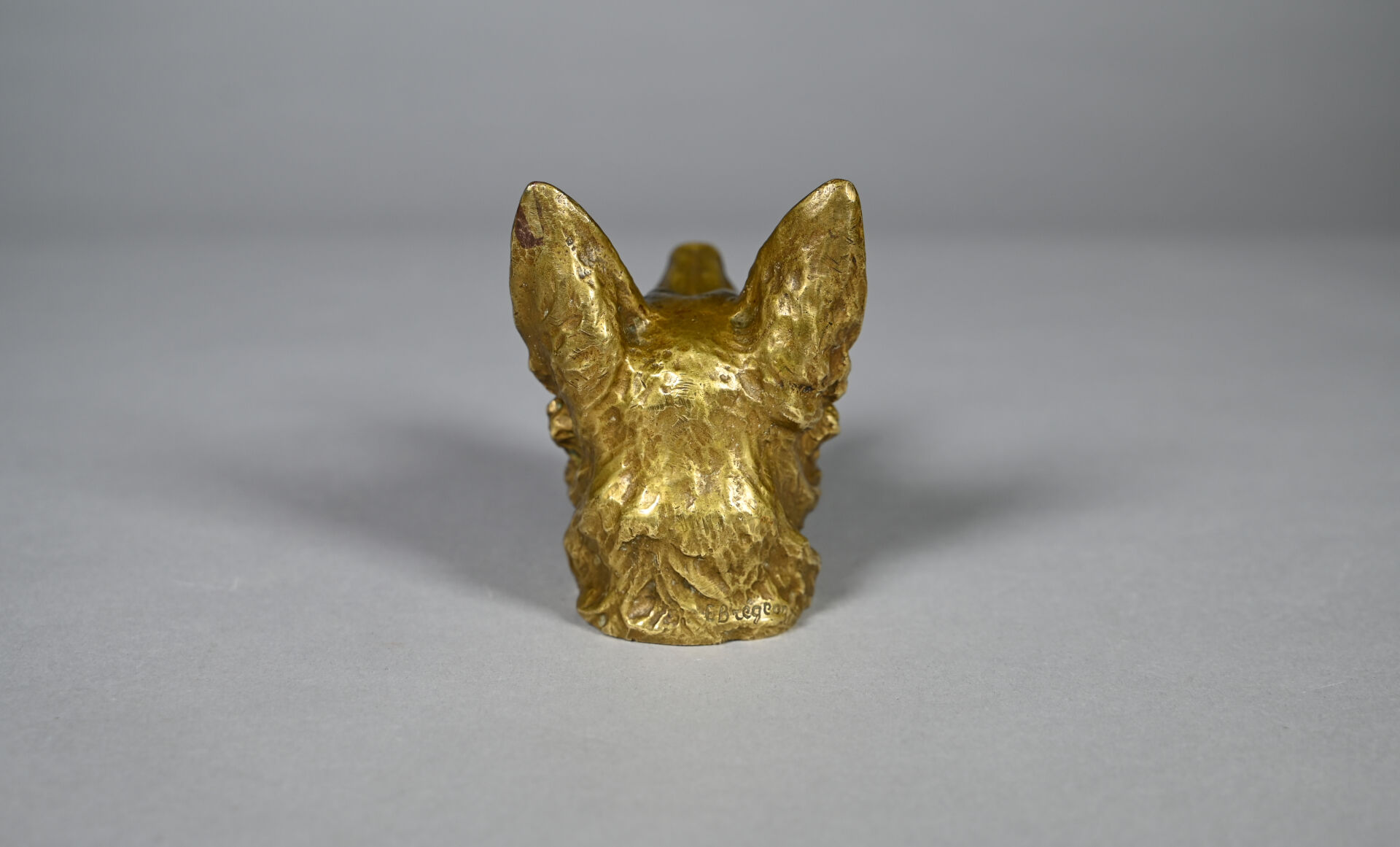 Emile BREGEON (XXe siècle). Mascotte en bronze figurant une tête de chien. Signée en bas au dos. Haut. : 11,5 cm.