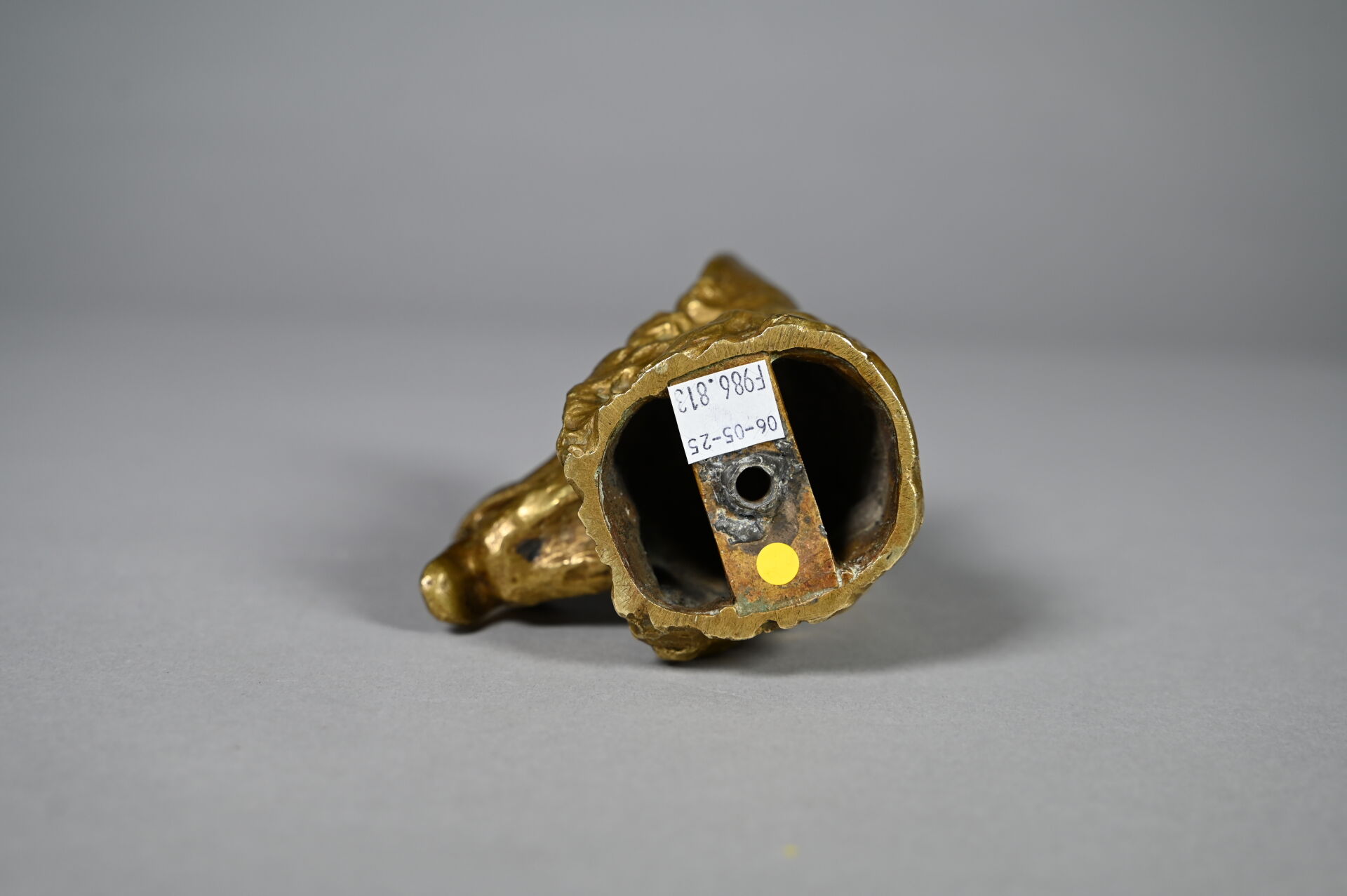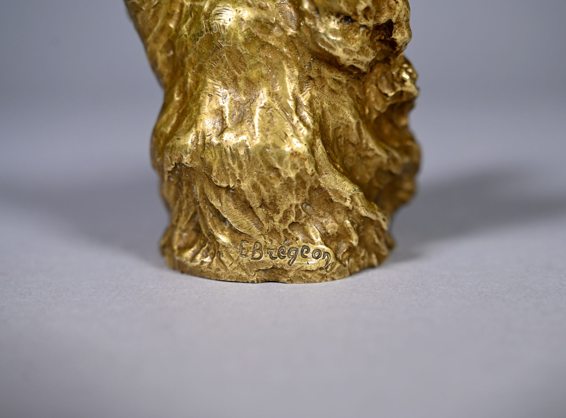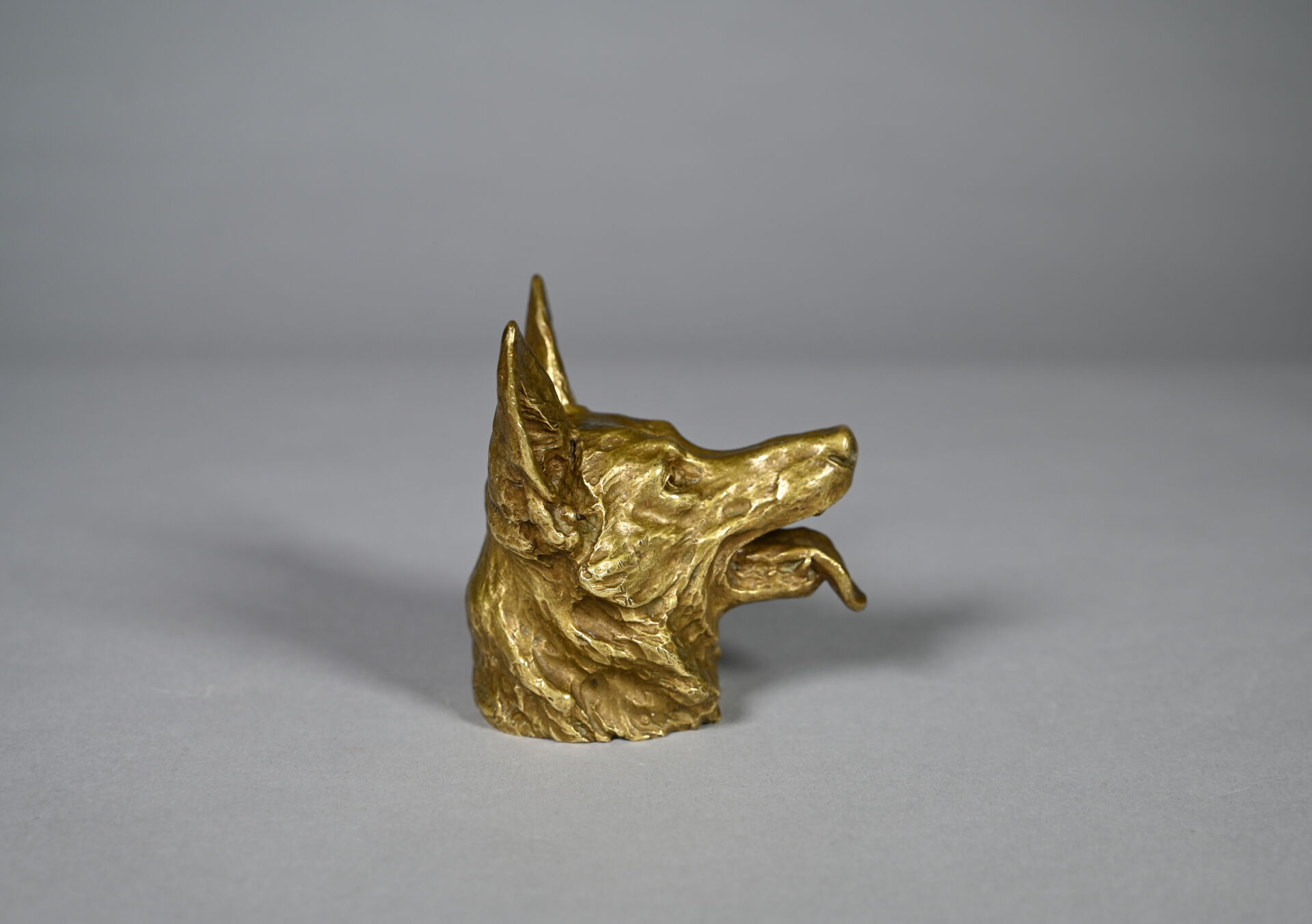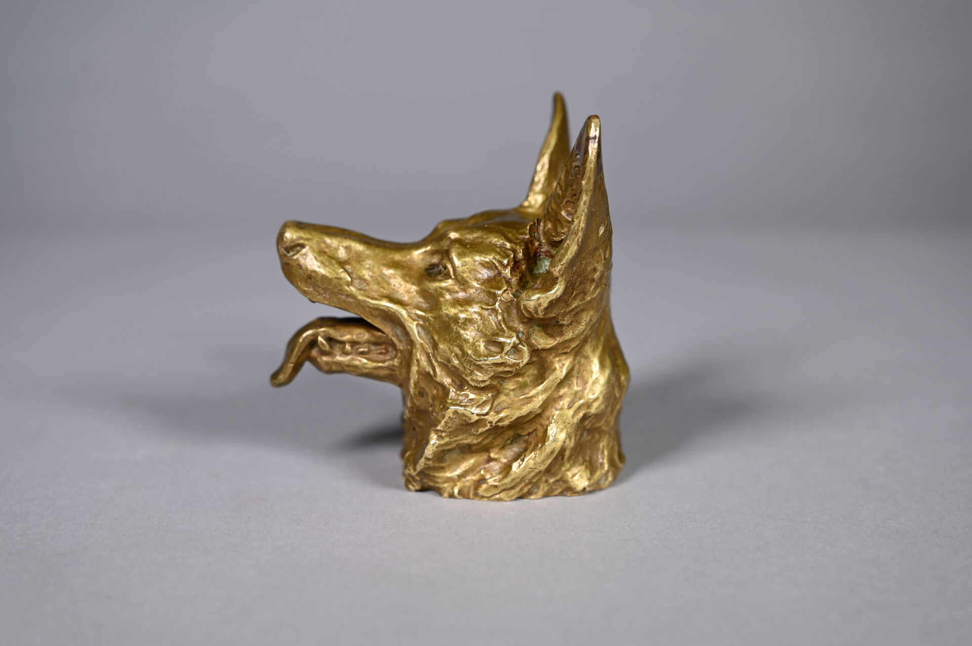 Emile BREGEON (XXe siècle). Mascotte en bronze figurant une tête de chien. Signée en bas au dos. Haut. : 11,5 cm.