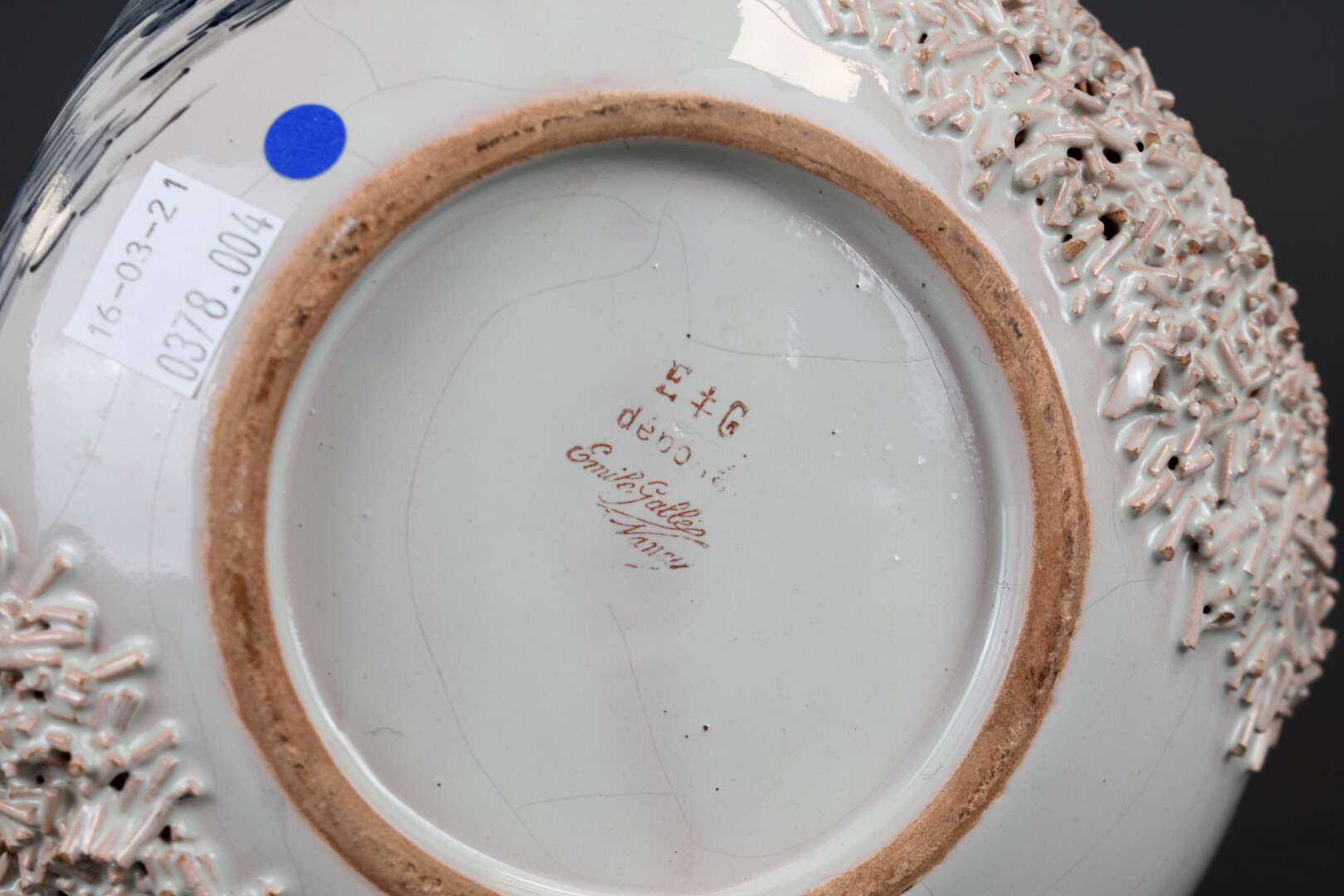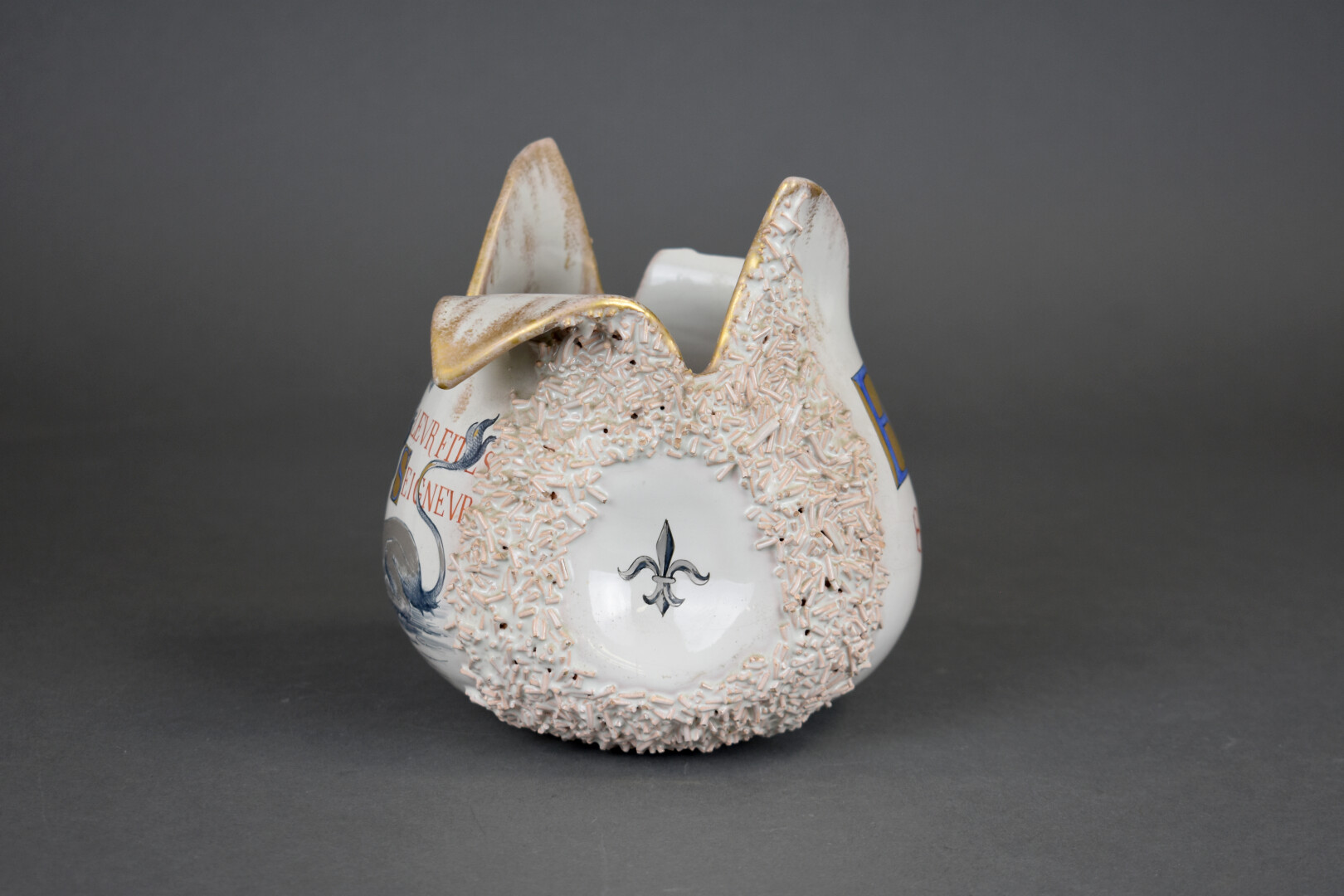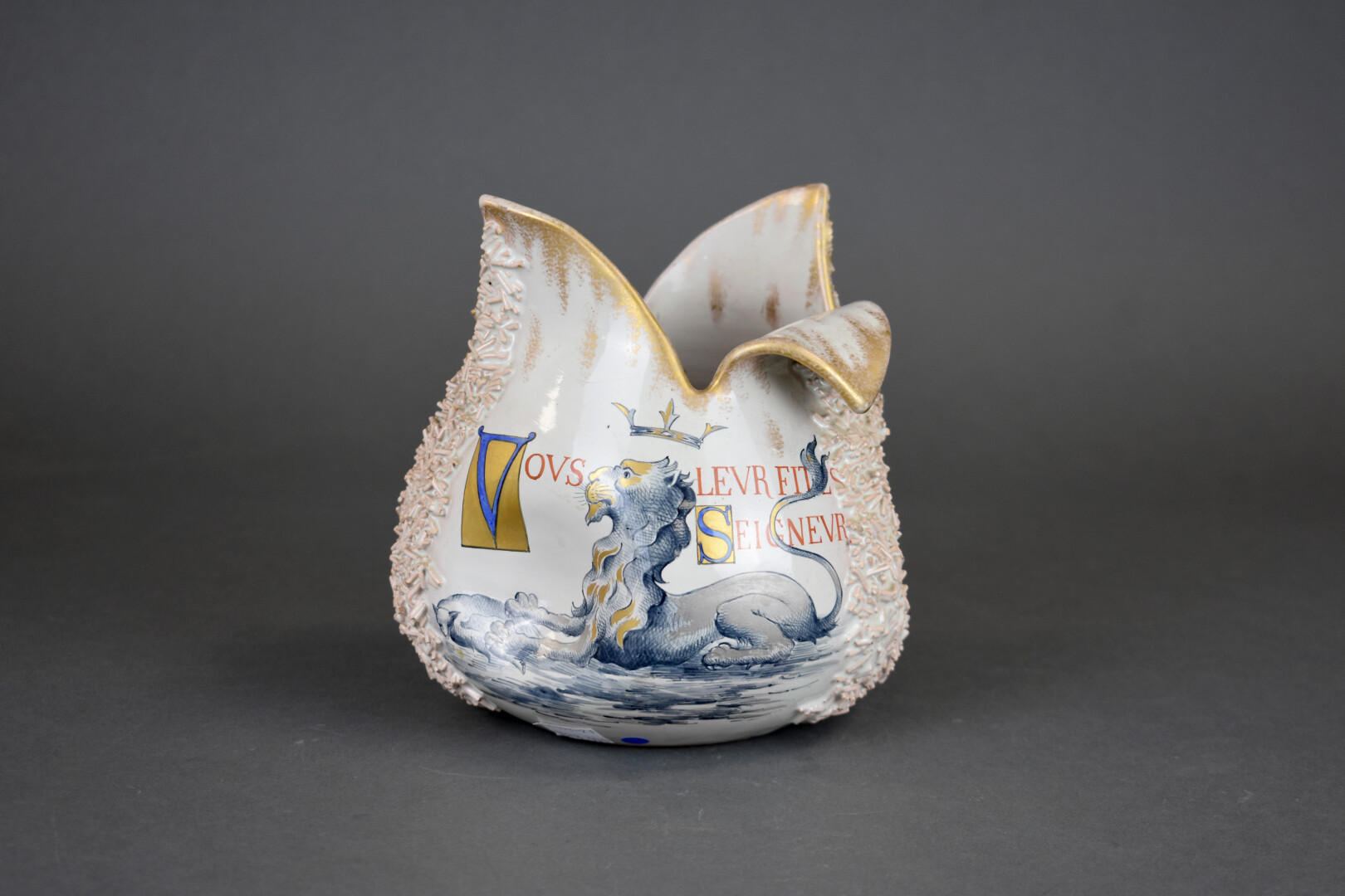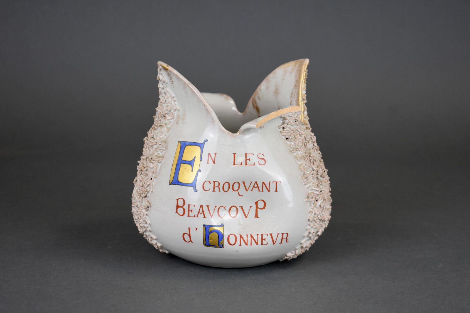 Émile GALLE (1846-1904). Coupe « Vous leur fites Seigneur, en les croquant, beaucoup d’honneur » (d’après Les animaux malades de la peste, Jean de la Fontaine). En faïence, parlante à décor émaillé en rouge, bleu et or sur fond crème. Un accident au col (manque un morceau). Signé sous la base. Haut. : 17 cm.