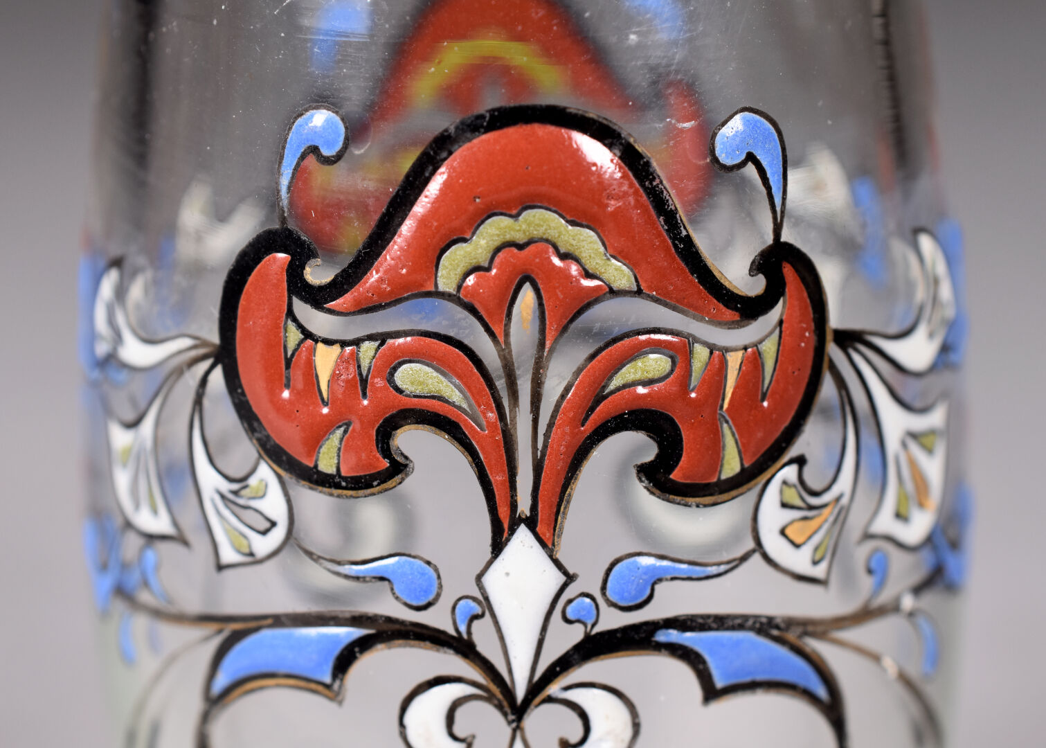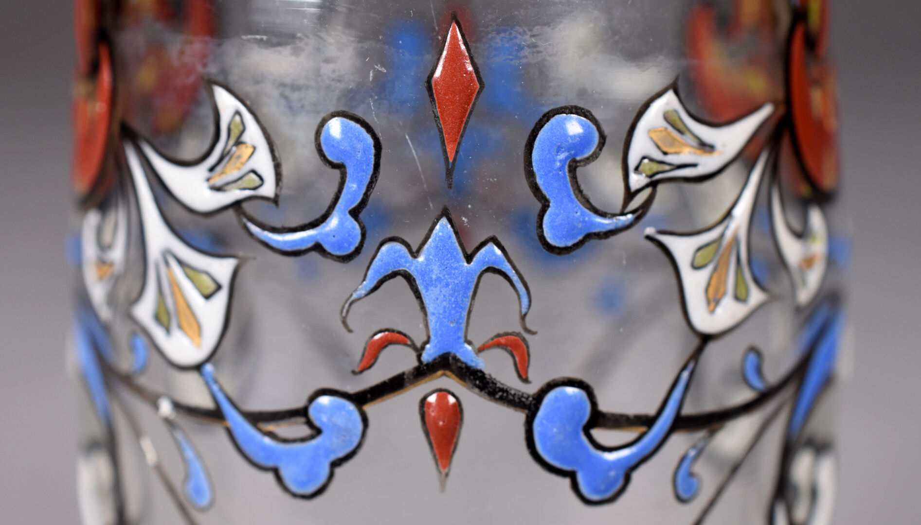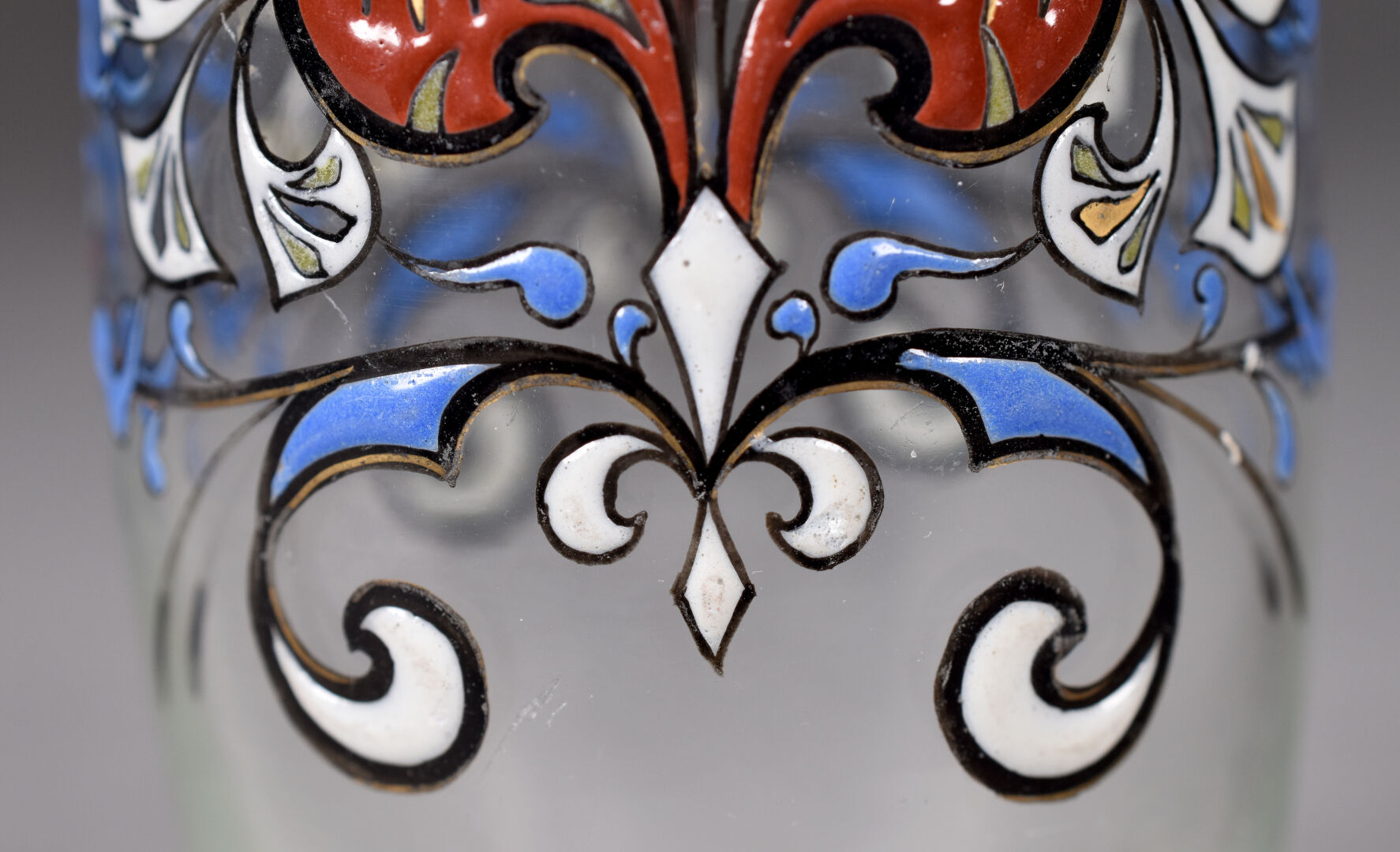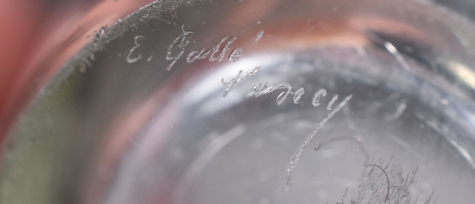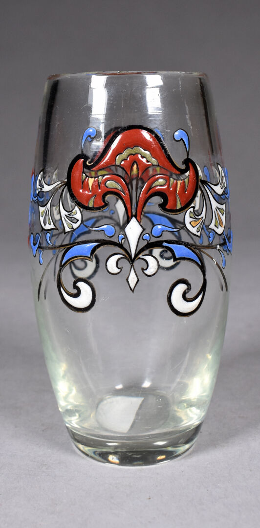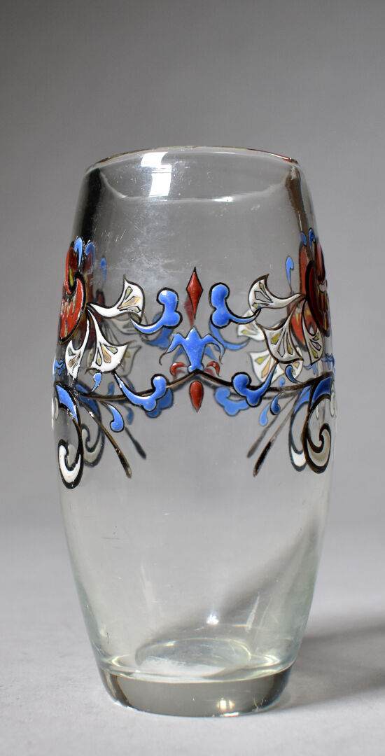 Émile GALLÉ (1846-1904). Vase fuseau en verre clair à décor émaillé (traces de frottements). Signature à la pointe « E. GALLÉ – Nancy ». Haut. : 12 cm.