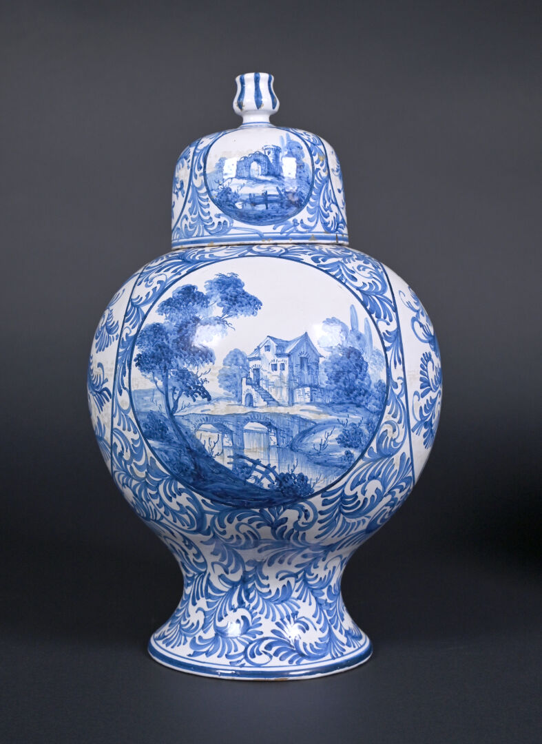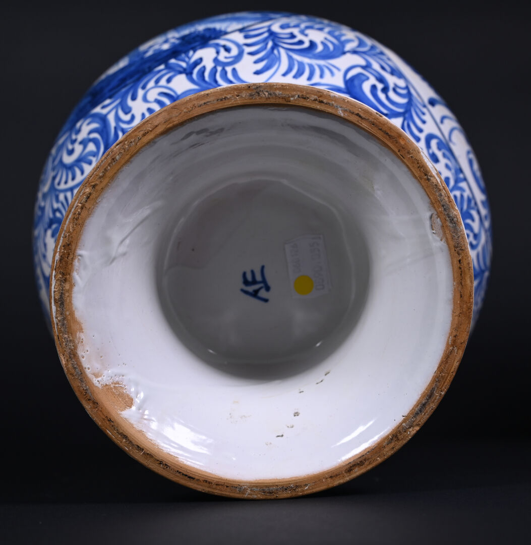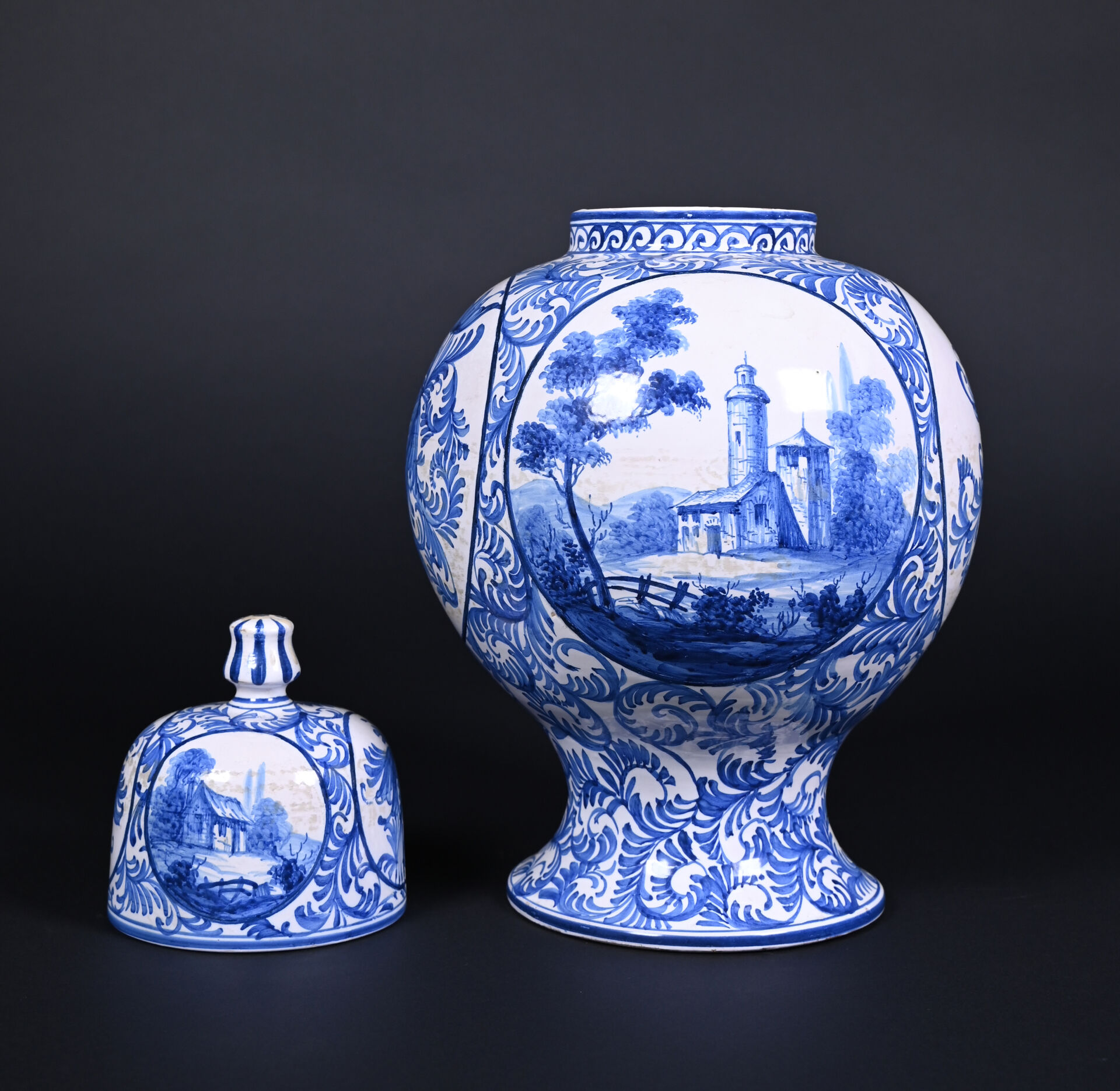 EMILE TEISSIER à Malicorne. Paire de potiches en faïence à décor bleu et blanc à motifs de fleurs , fermes et moulins (accidents recollés, restaurations, manques). Marquées au dessous. Haut. : 39 cm.