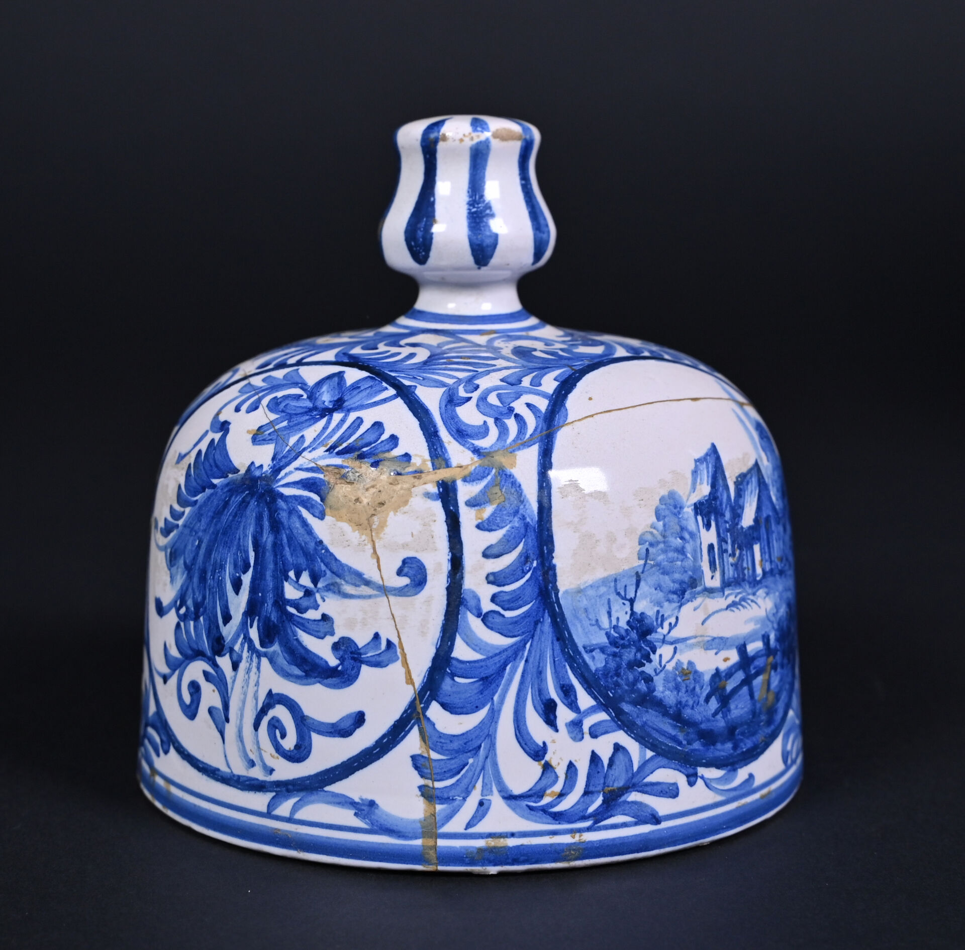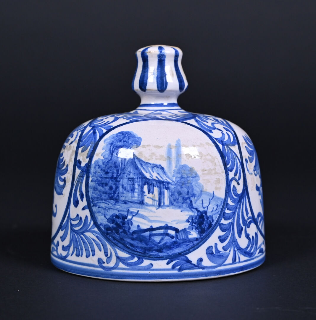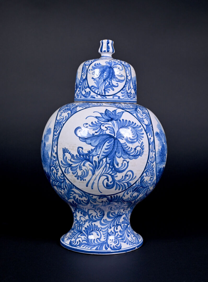 EMILE TEISSIER à Malicorne. Paire de potiches en faïence à décor bleu et blanc à motifs de fleurs , fermes et moulins (accidents recollés, restaurations, manques). Marquées au dessous. Haut. : 39 cm.