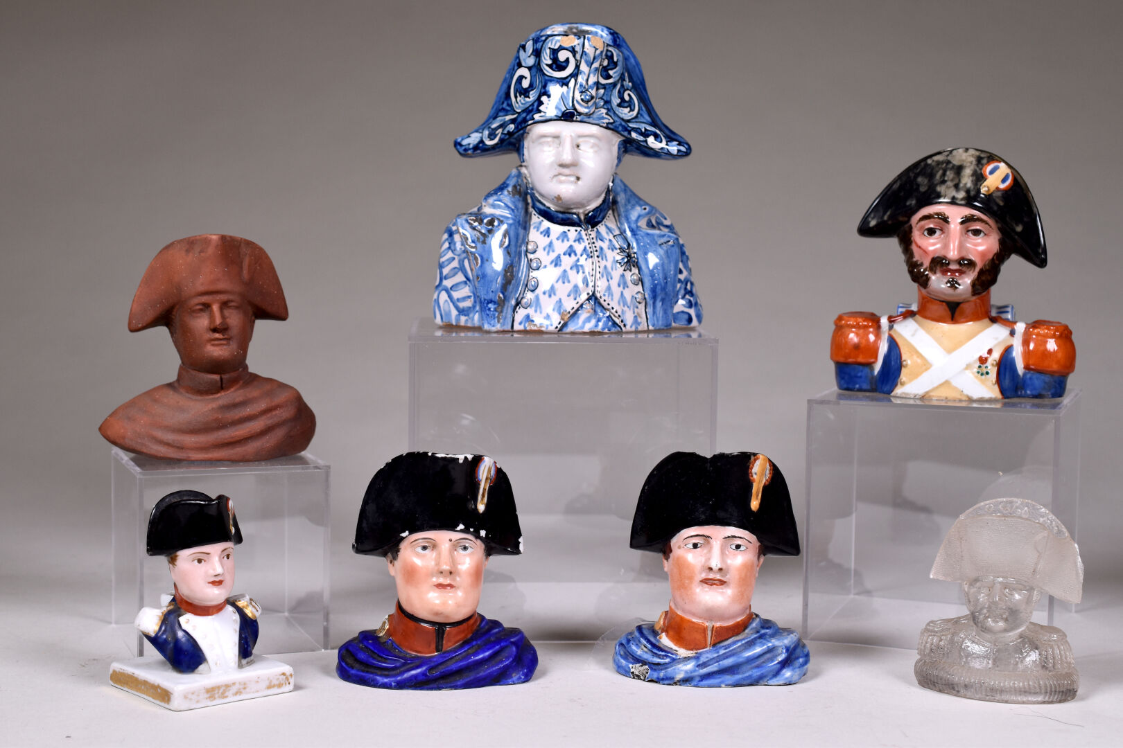 EMPIRE. Ensemble soit 10 encriers, porte-plumes en faïence, porcelaine, céramique, verre à l’effigie de l’Empreur Napoléon 1er. On joint un ensemble de menus objets dont des miniatures toujours sur le thème du 1er Empire.