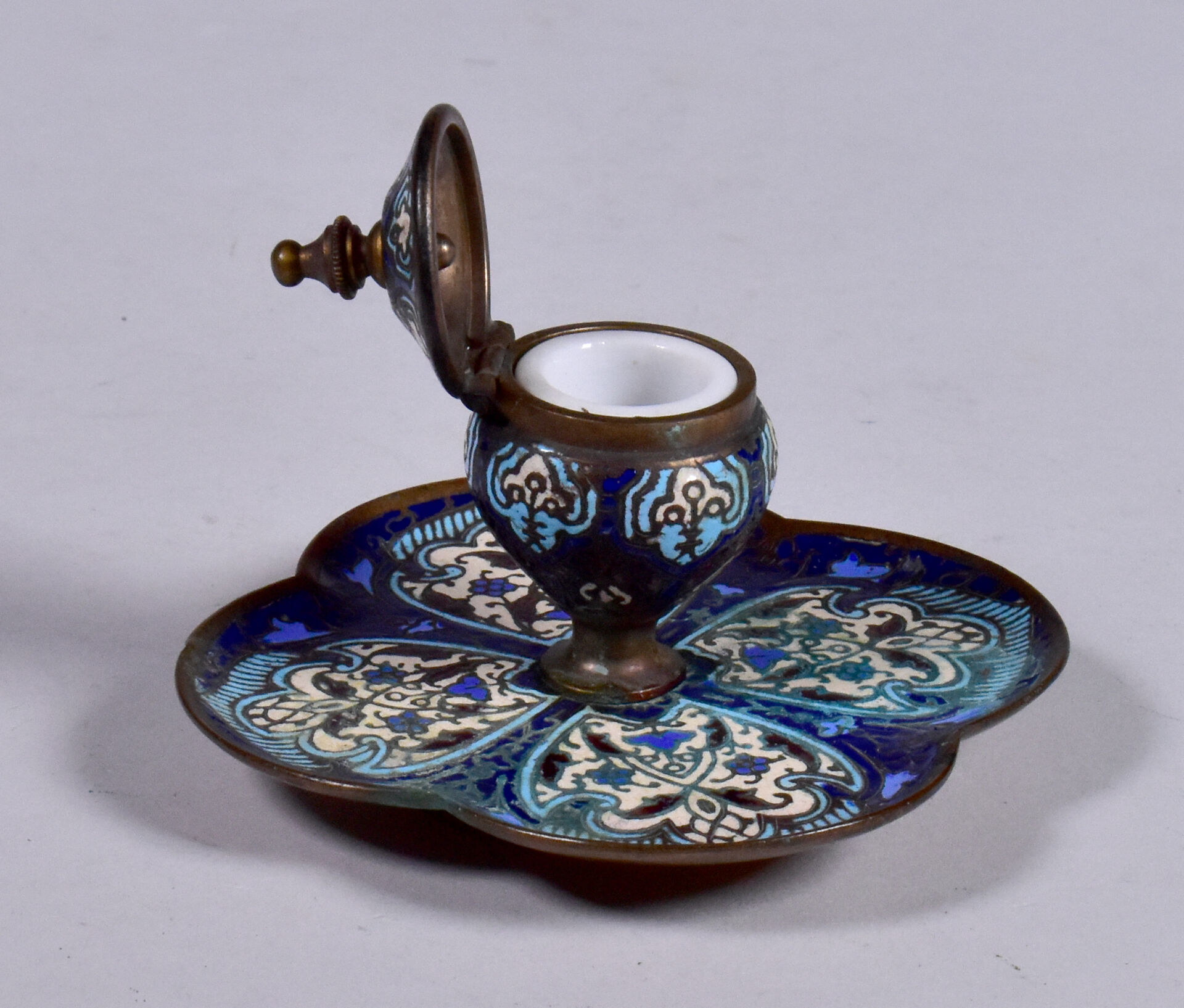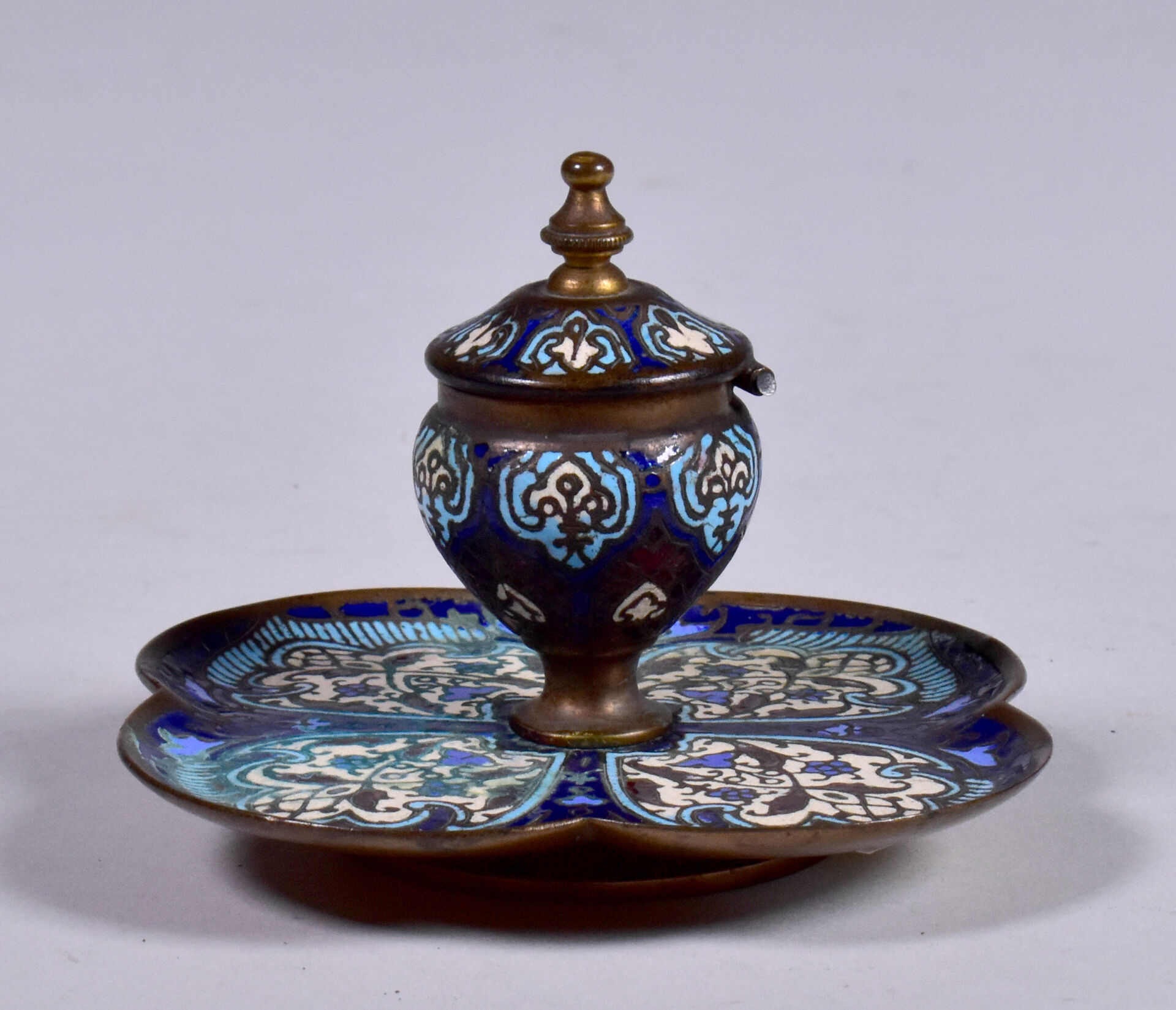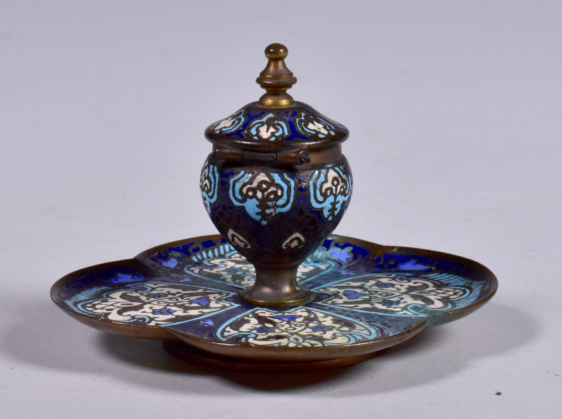 Encrier en bronze à décor polychrome en émaux cloisonnés dans les bleu et crème. Dans le goût de Théodore DECK. Haut. : 7 cm.