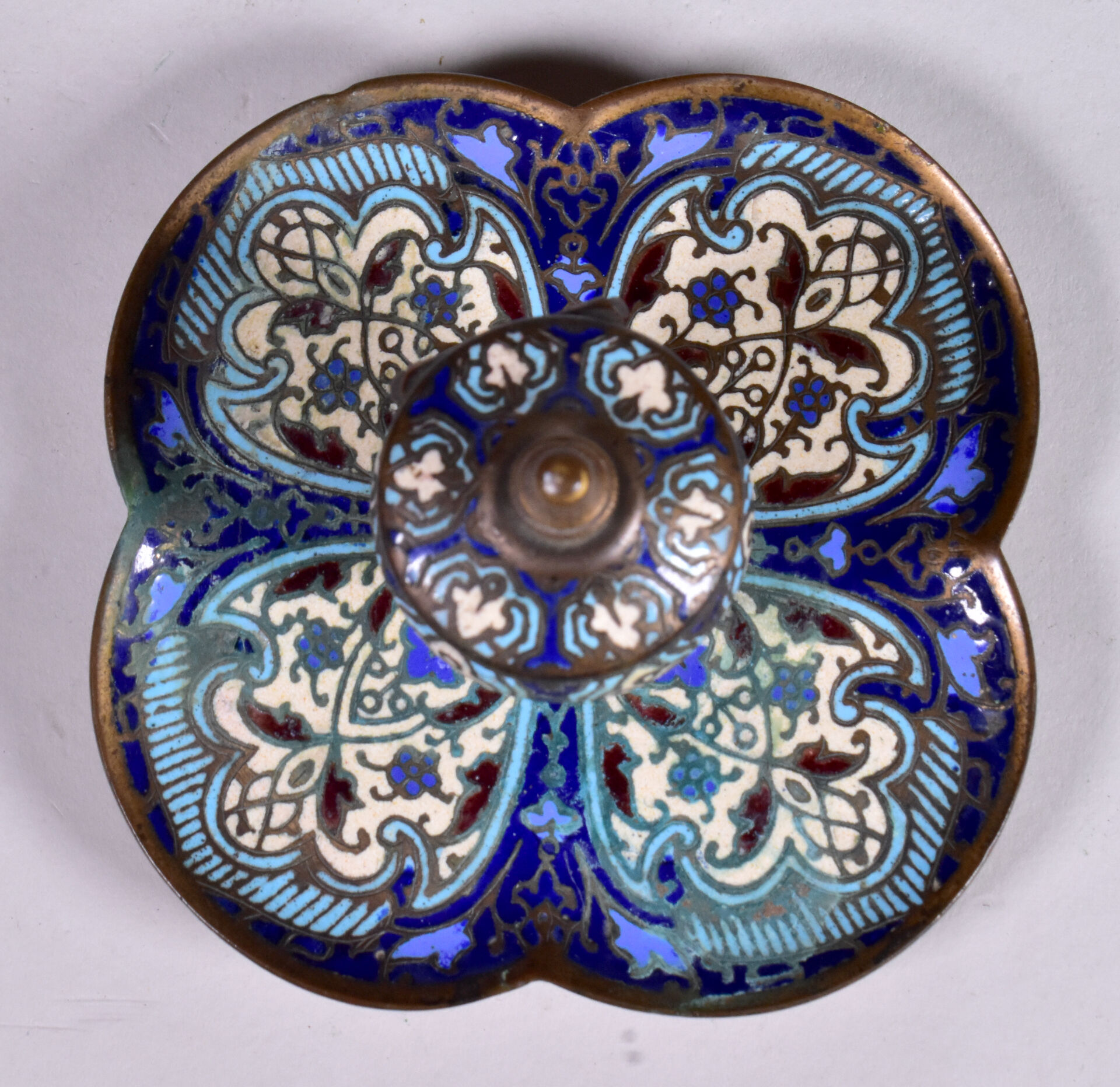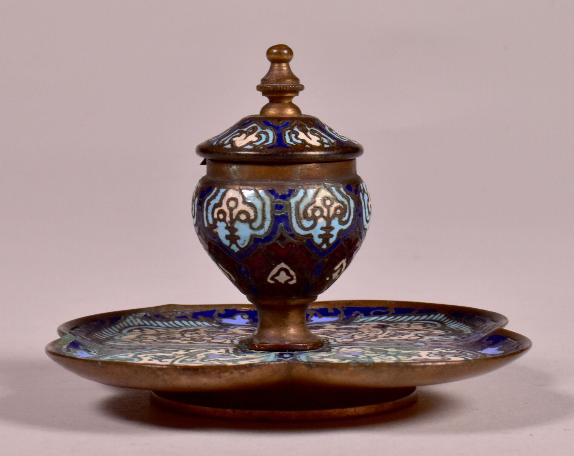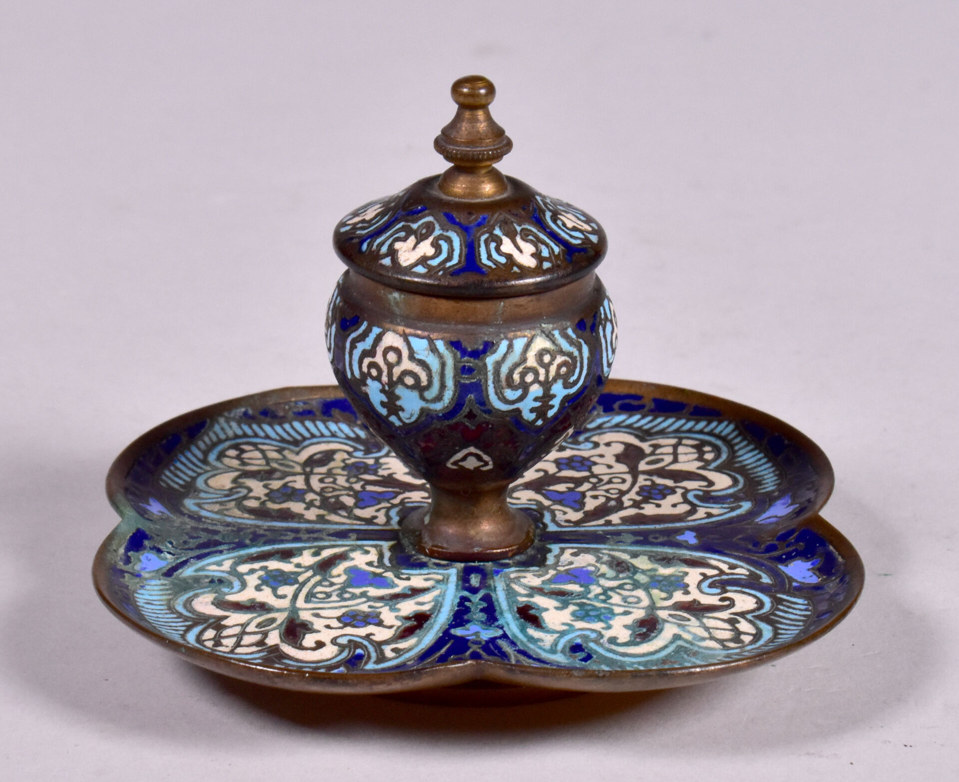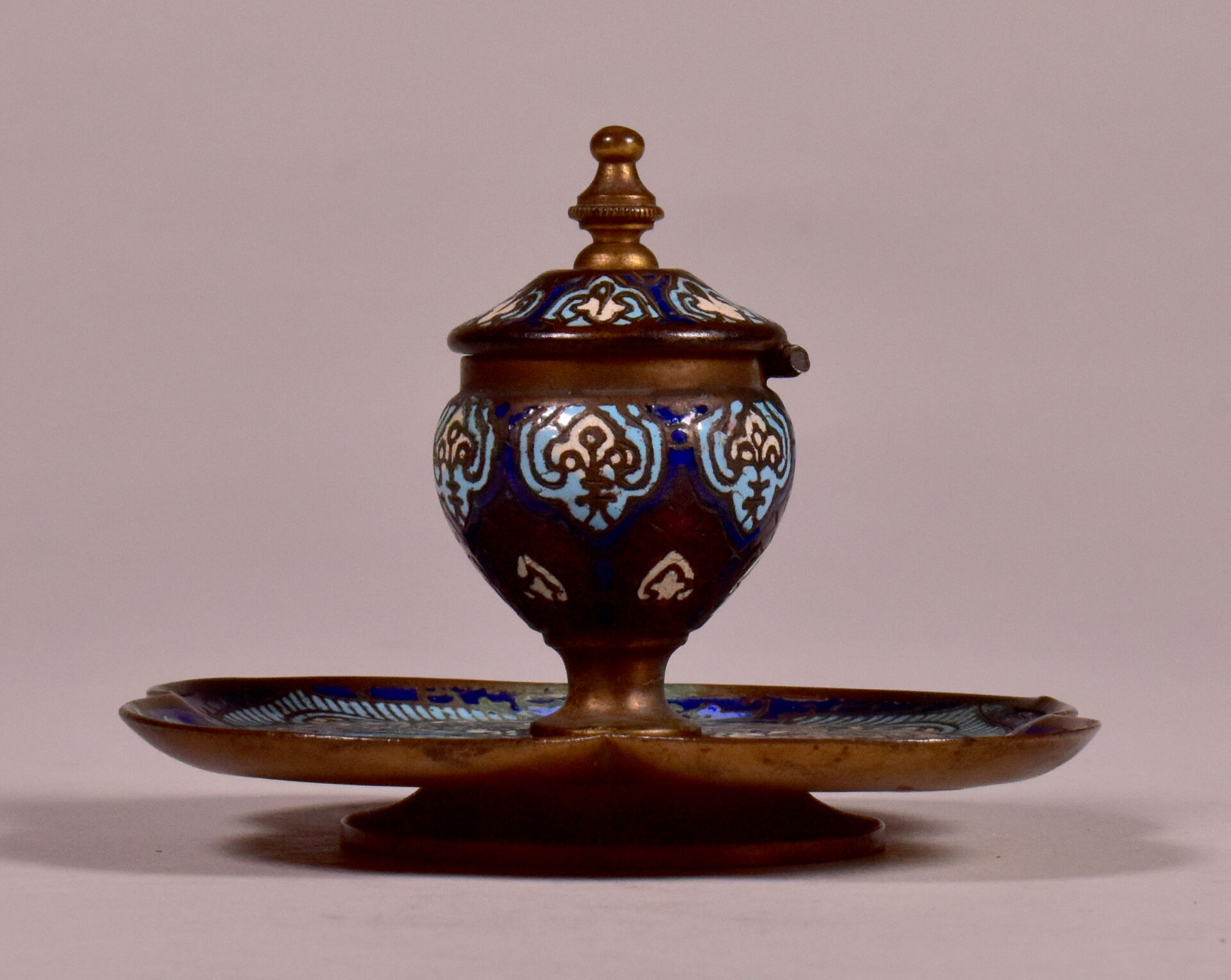 Encrier en bronze à décor polychrome en émaux cloisonnés dans les bleu et crème. Dans le goût de Théodore DECK. Haut. : 7 cm.