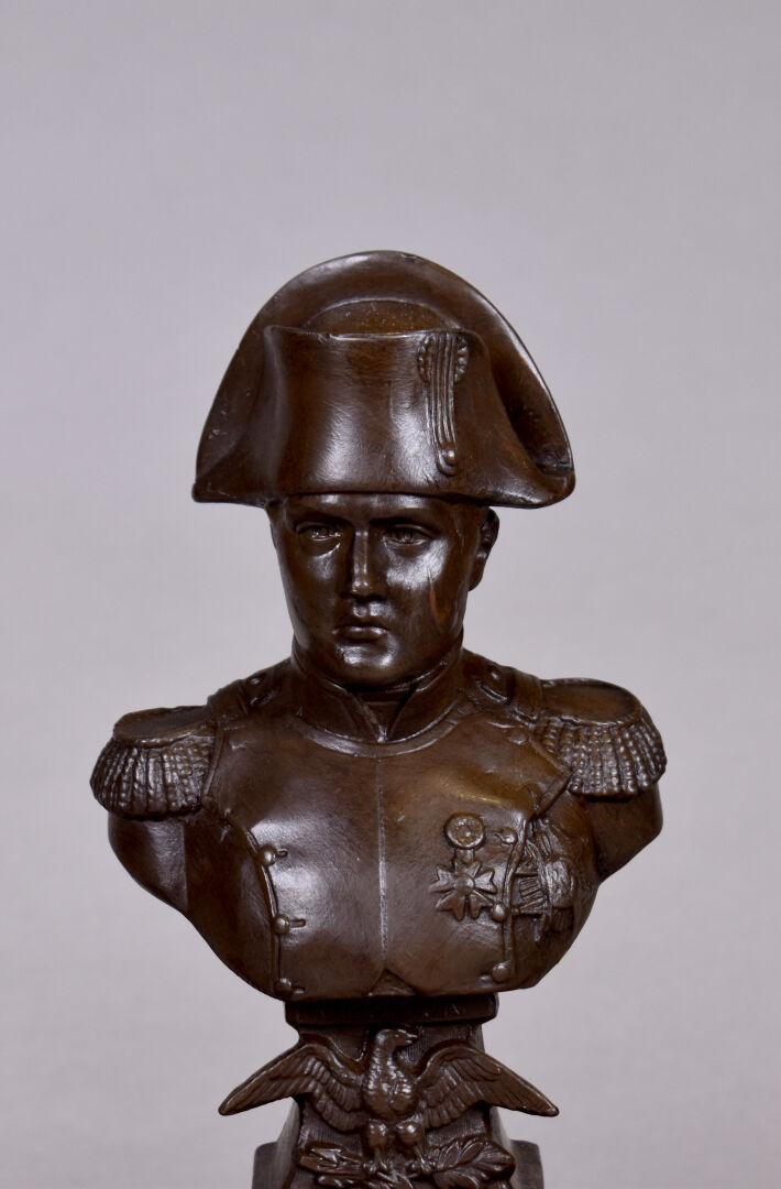 Encrier en régule patiné brun à décor d’un buste de Napoléon, acanthes et rocailles. Haut. : 23,5 cm.