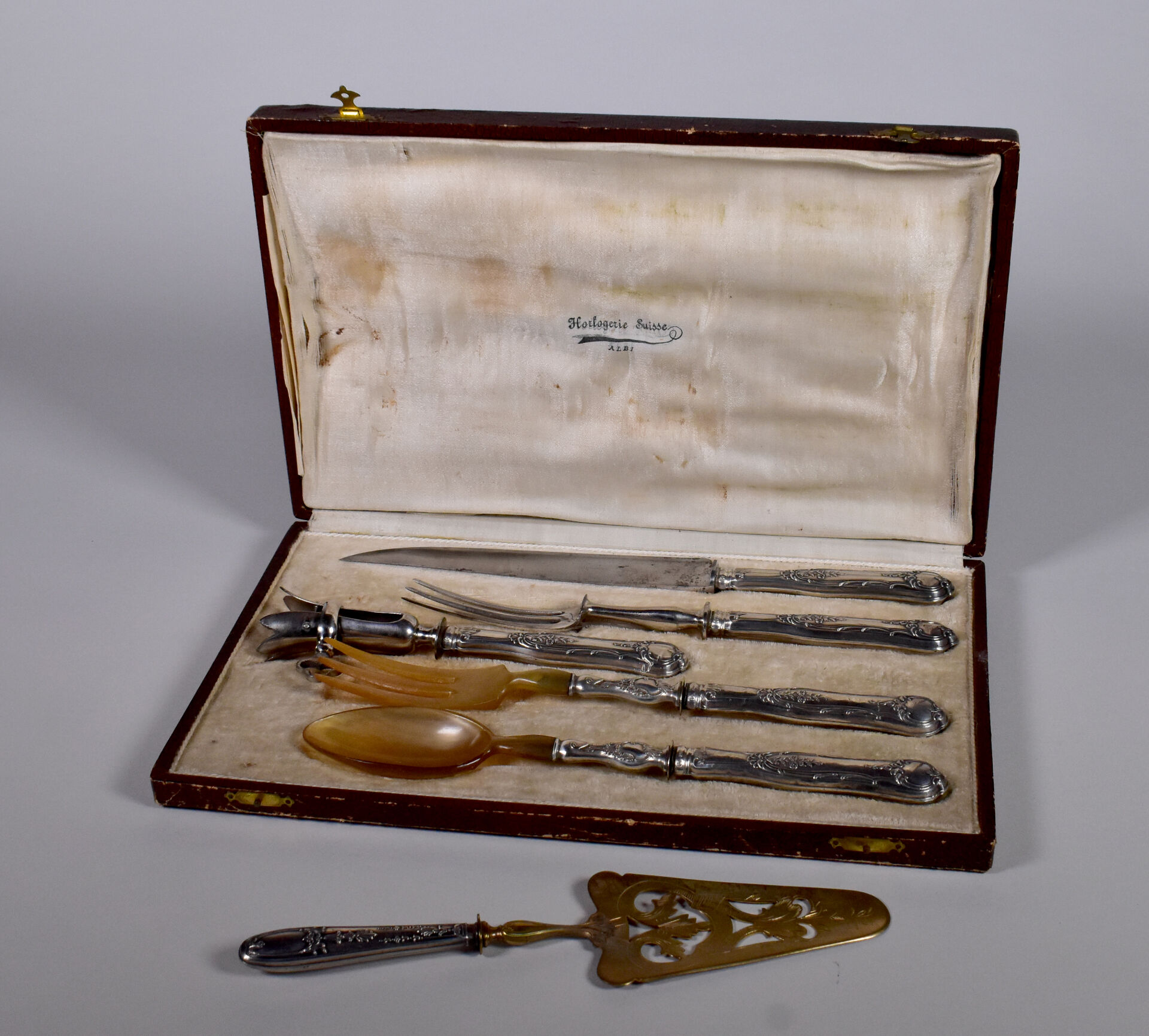 Ensemble à manches en argent fourré 800/1000e soit une paire de couverts à salade, un manche à gigot, et une paire de couverts de service à viande. On joint une pelle à tarte à manche en argent fourré 800/1000e. Un coffret. Poids brut total. : 518 g.