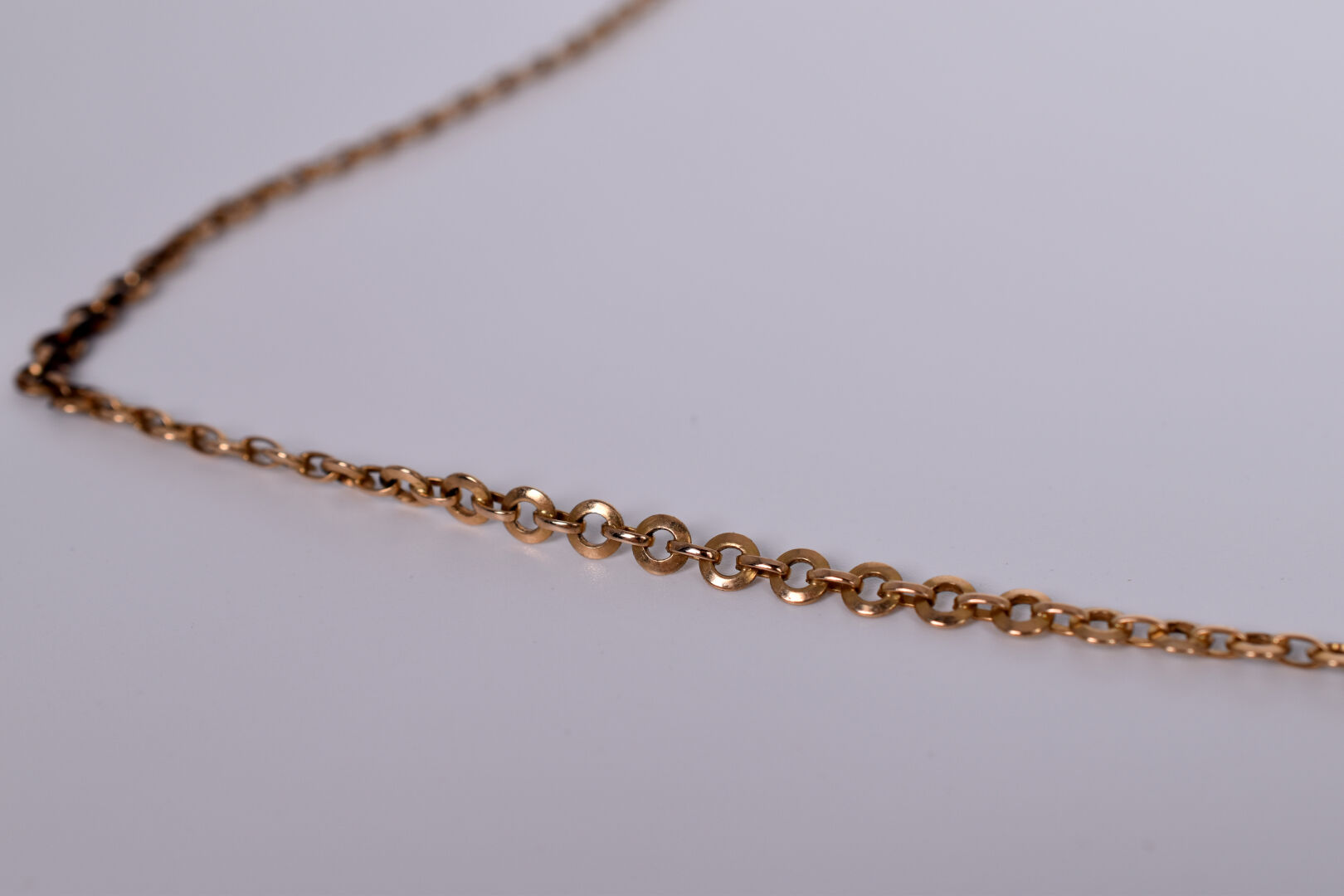 Ensemble composé d’une broche monogrammée SR et une chaîne en or jaune à maille ronde 18K 750/1000e. Long. chaine : 30,5 cm (fermée). Poids : 22,37g.