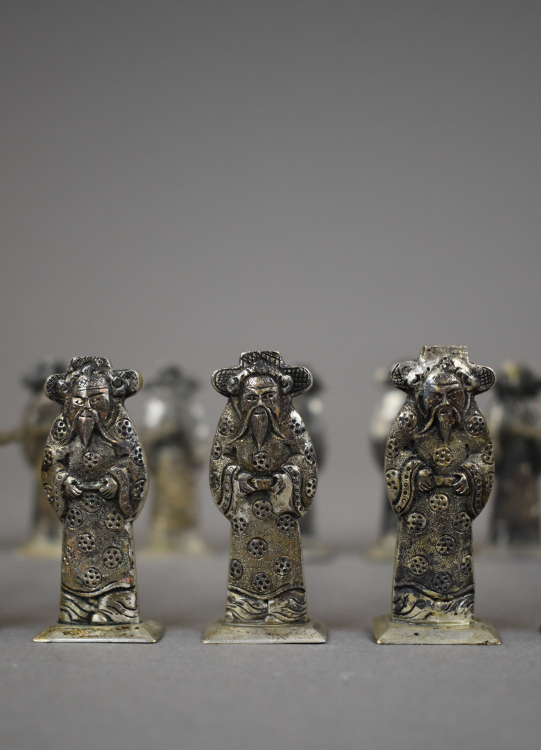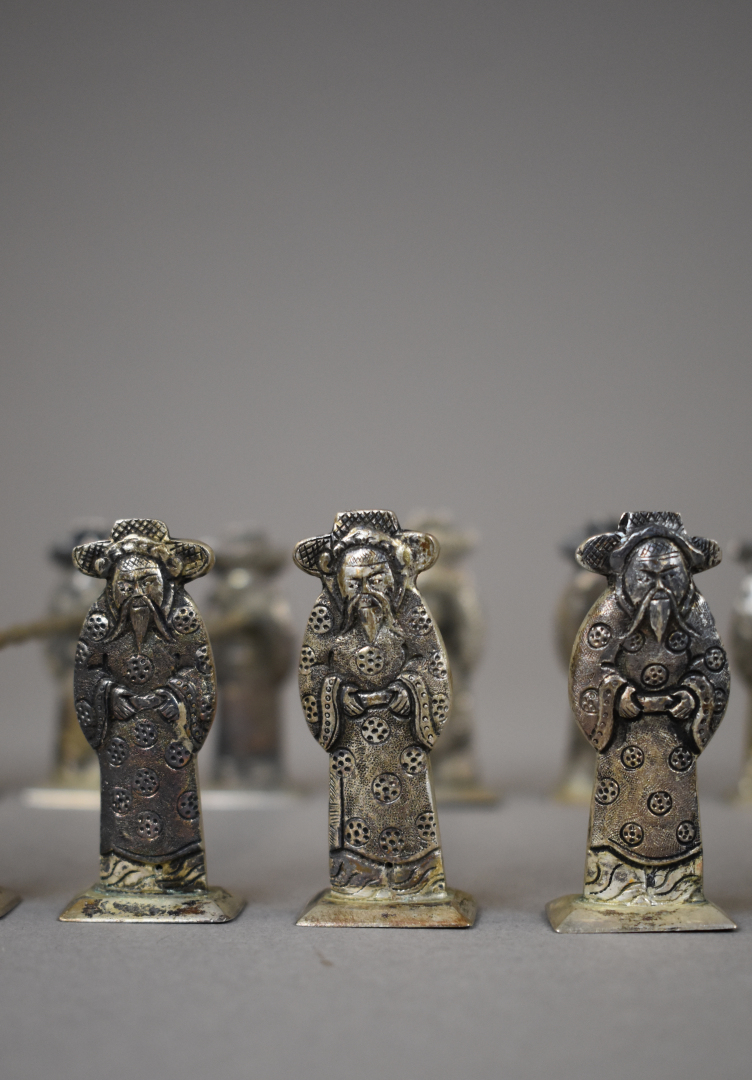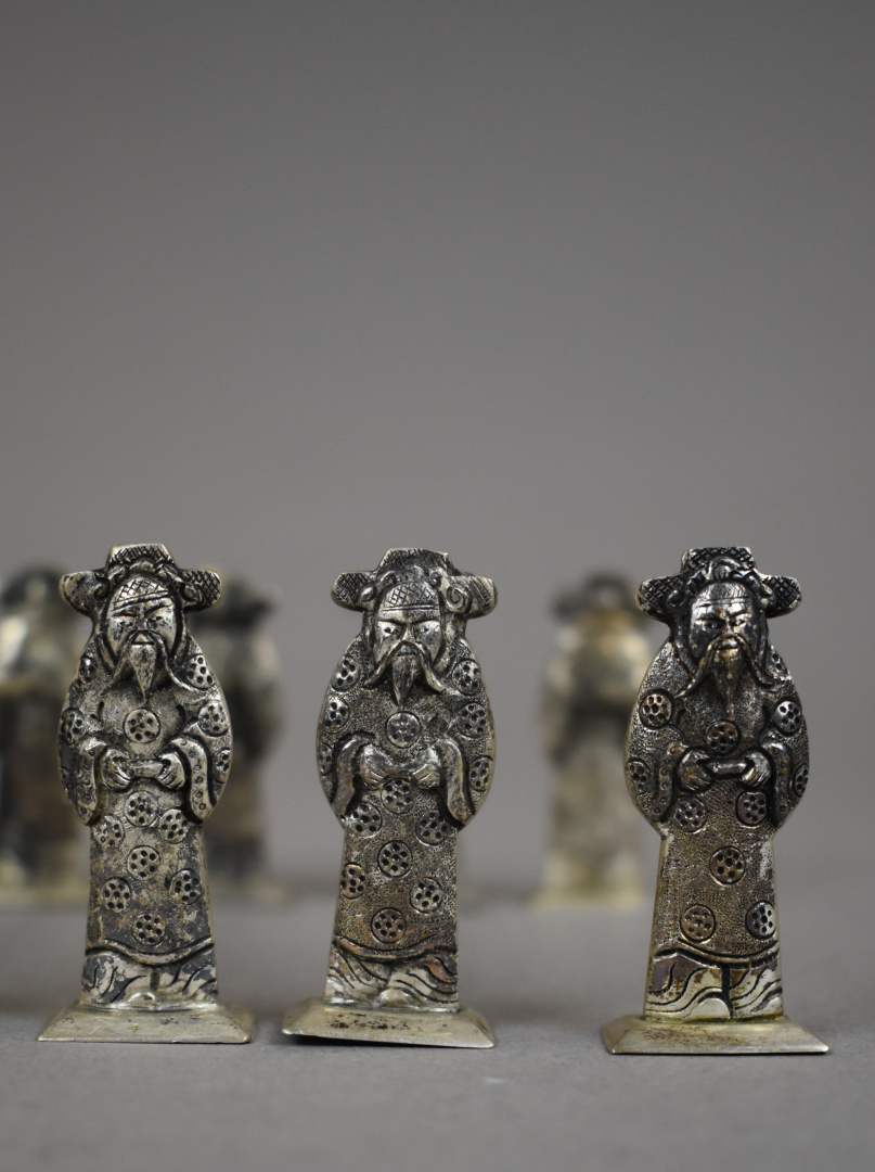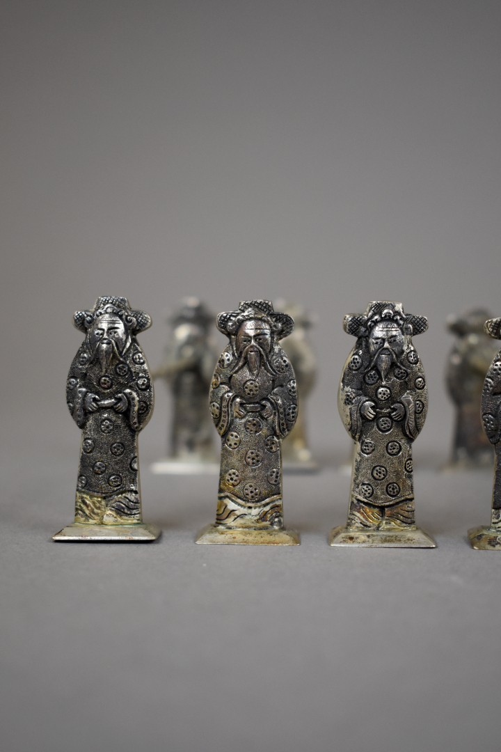 Ensemble comprenant douze repose-baguettes en argent 850/1000e (haut des personnages : 4,8 cm), une coupelle de cendrier en argent 850/1000e. poids total: 293g. On joint deux flacons à bouchons en métal argenté dont un signé GALLIA et un coffret en métal argenté dans le goût perse.