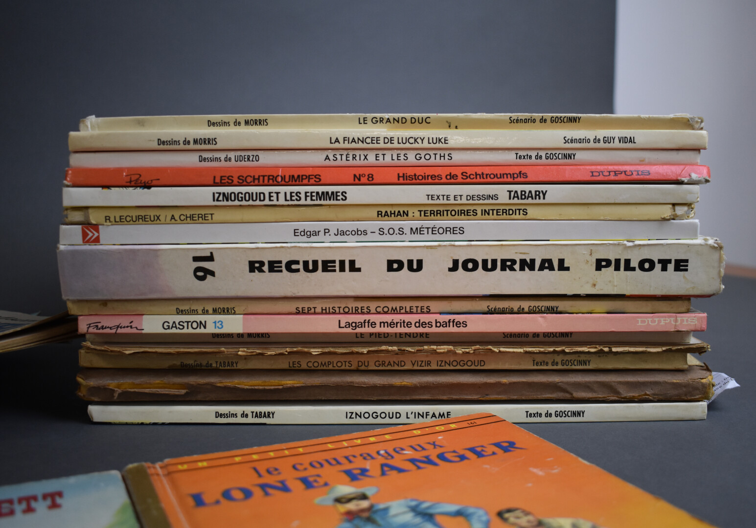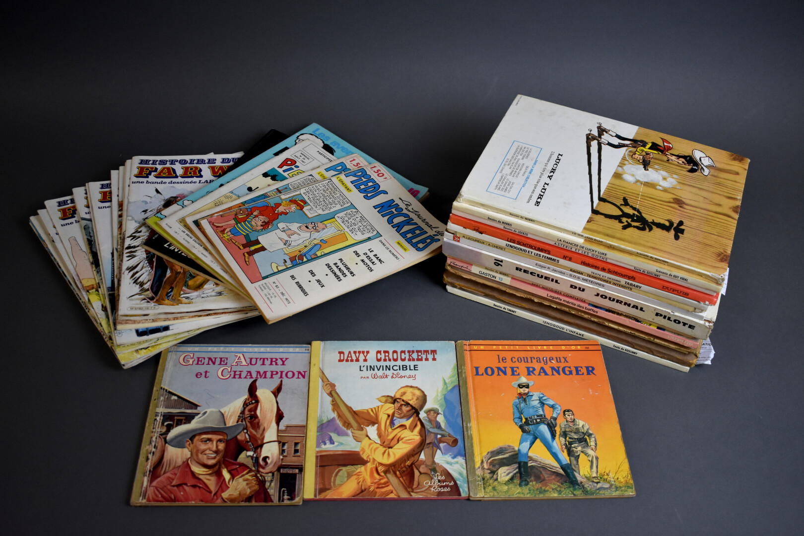 Ensemble d’albums et bandes dessinées dont « Le Journal des Pieds Nickelés », « Gaston Lagaffe mérite des baffes », « Blake et Mortimer S.O.S METEORES », « Histoire du Far West bande dessinée Larousse », « Les aventures de Tintin au cinéma », « Pilote 16 » , Un poster Lucky Luke et divers. Un carton.