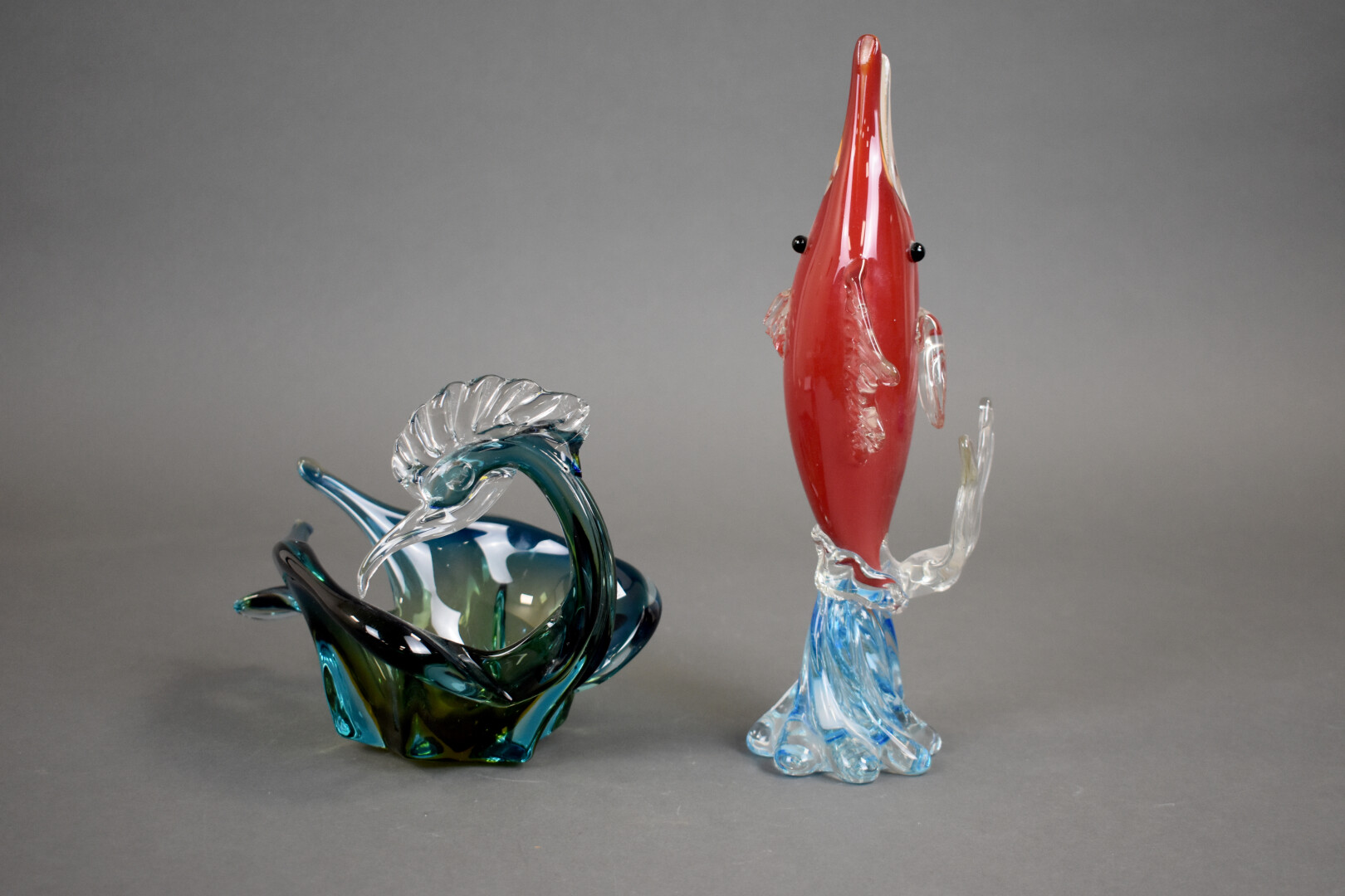 Ensemble dans le goût de Murano en verre et cristal soit un espadon sortant des flots et un oiseau (éclat). Haut. poisson : 30 cm.