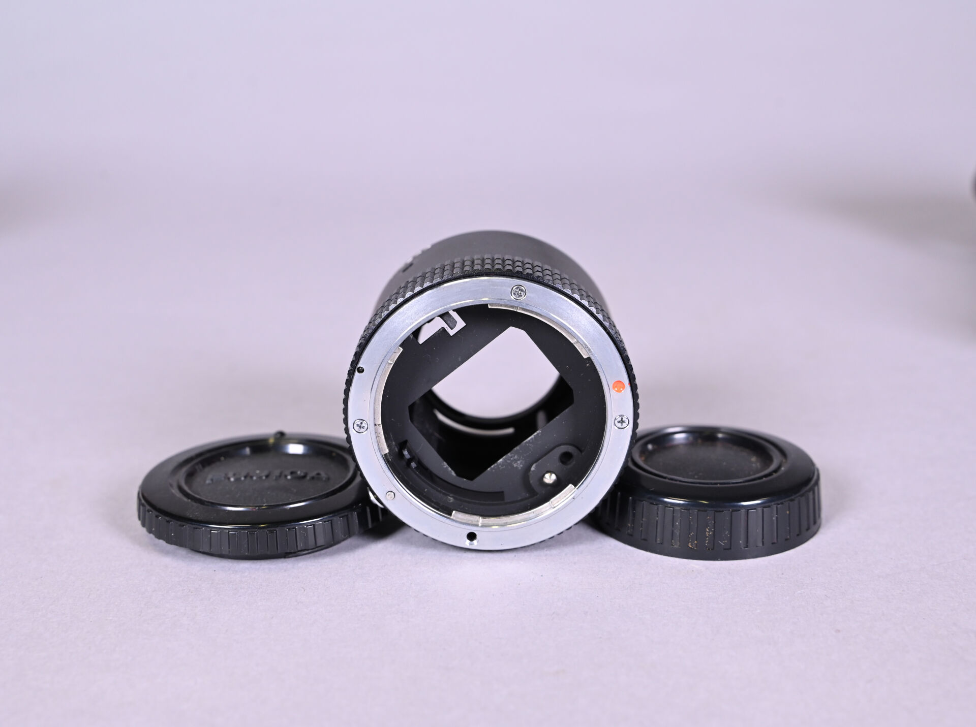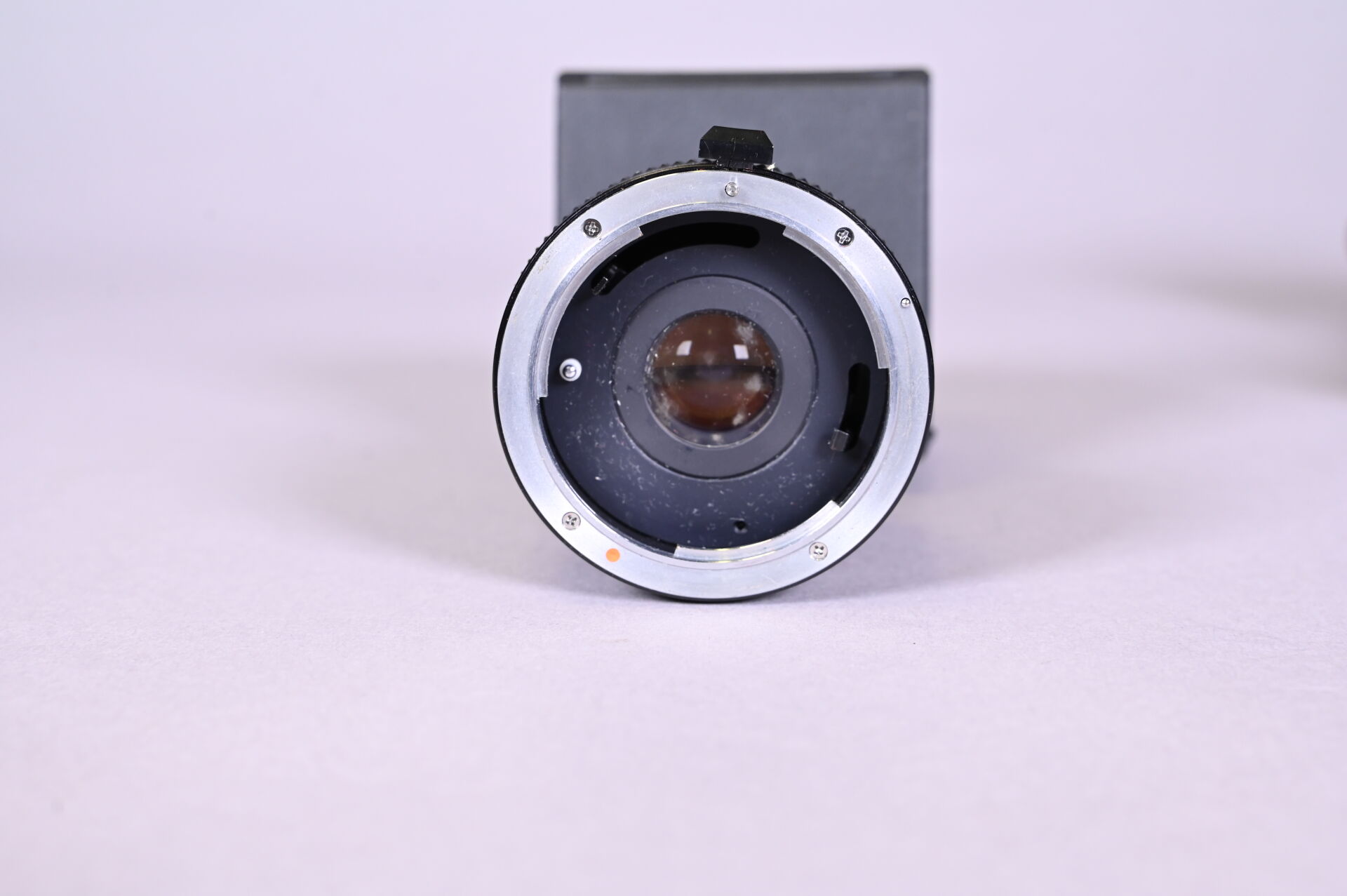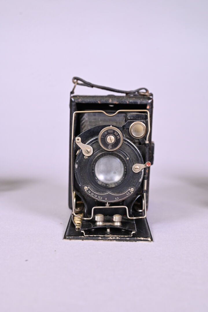 Ensemble d’appareils photos argentiques et à soufflet et accessoires dont MINOLTA SRT101B et FUJICA AX-3, flash etc. Une caisse.