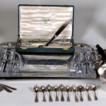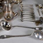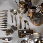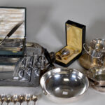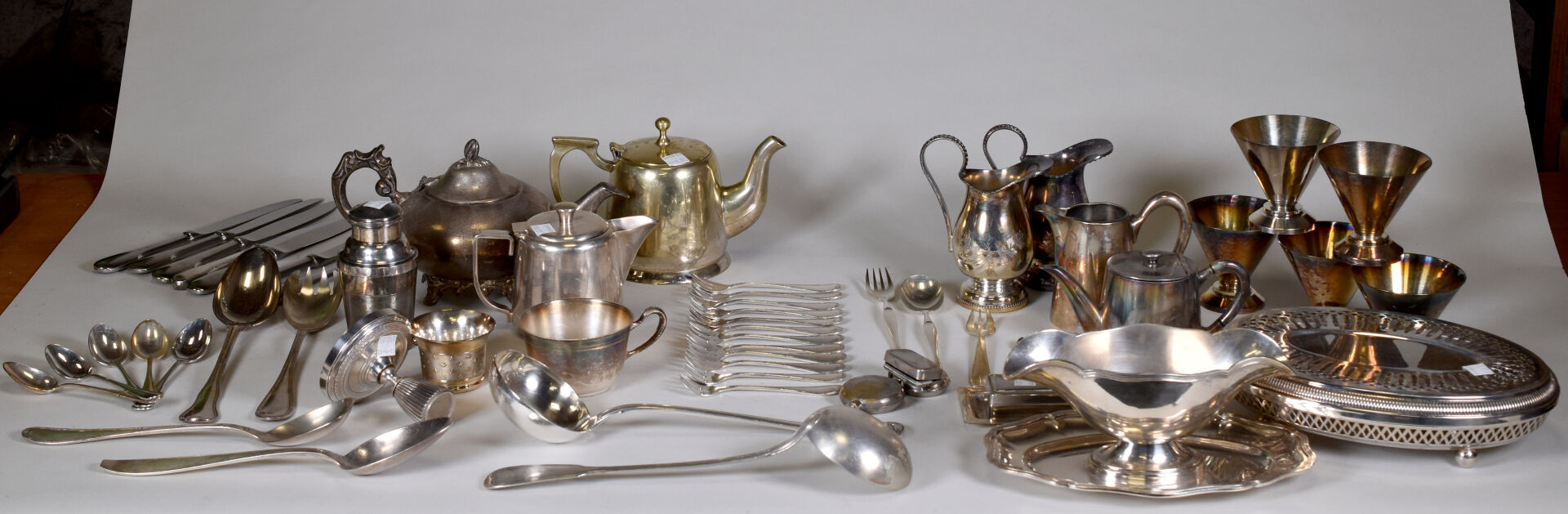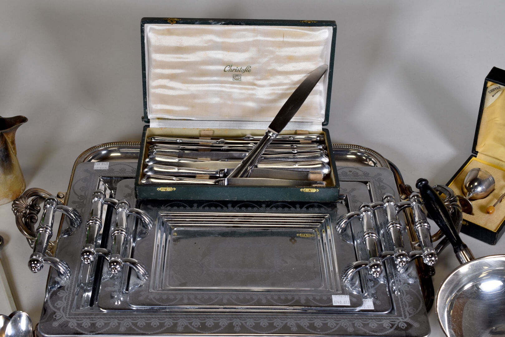 Ensemble d’argenterie en métal argenté dont Christofle, plats, plateaux, chauffe-plat, chocolatière, verseuses, shaker et divers. Trois caisses.