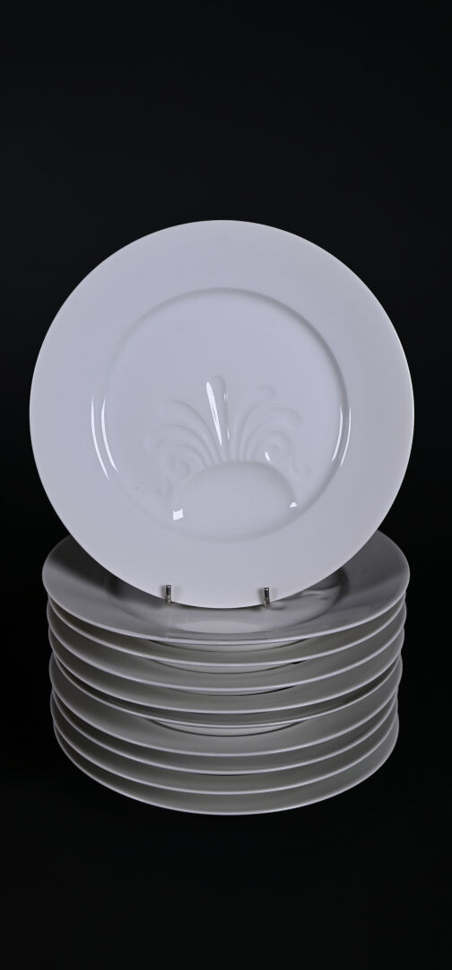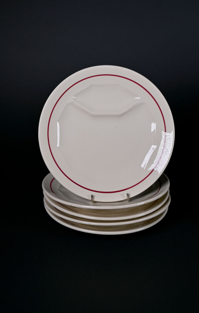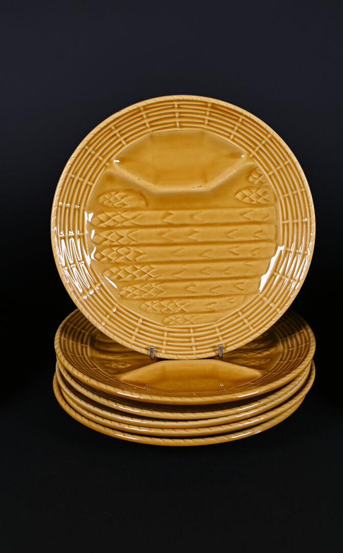 Ensemble d’assiettes à asperges soit 10 en porcelaine blanche, 6 en barbotine jaune et 5 en faïence à liseré rouge (quelques égrenures. Limoges et Sarreguemines.