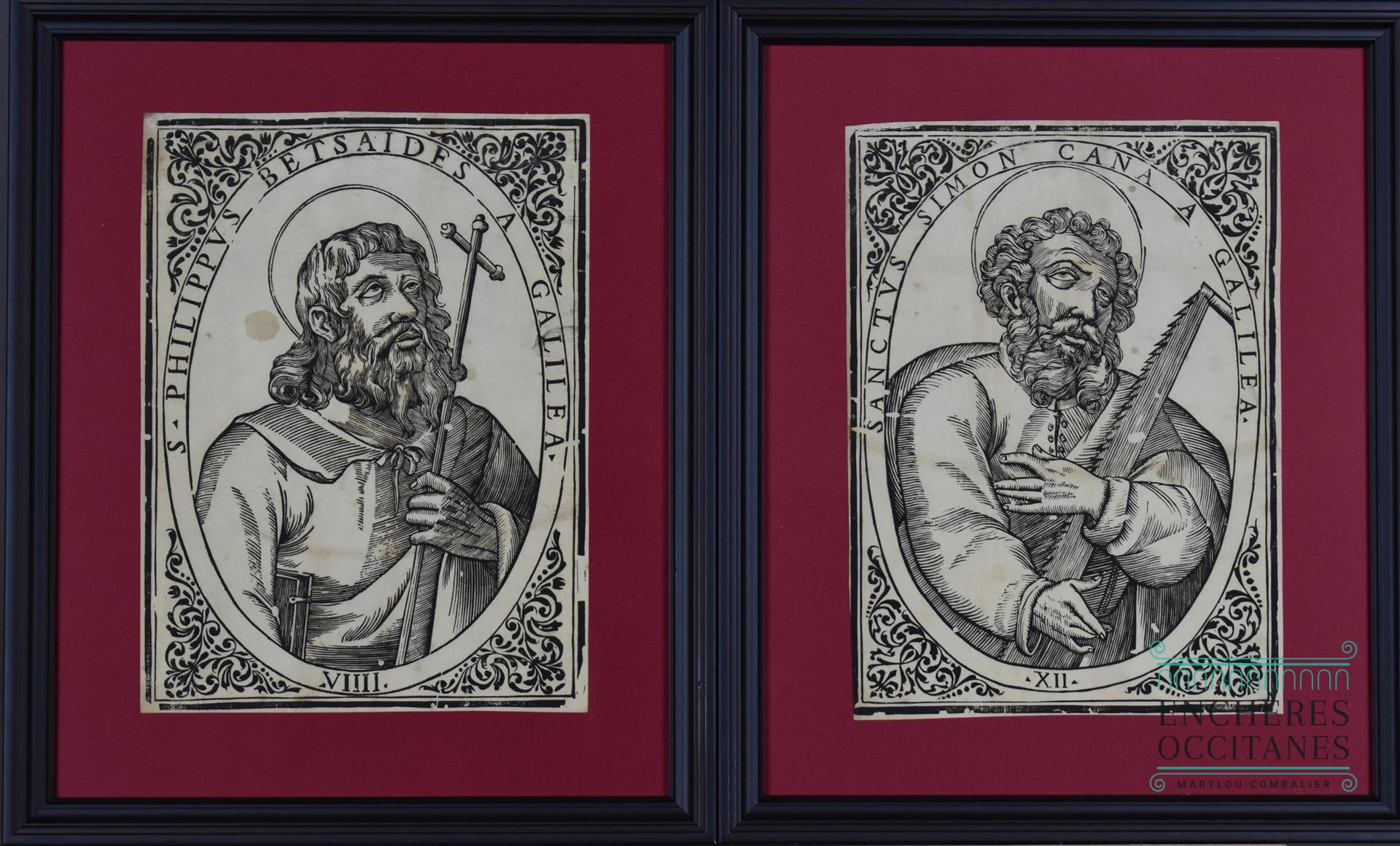 Ensemble de 11 gravures sur bois reprenant des modèles des XVIe, XVIIe et XVIIIe siècle représentant des saints, scènes religieuses et un Hercule luttant contre le lion de Némée (papier légèrement jauni et gondolé par endroit). Dimensions moyennes: 25 x 18 cm (à vue).