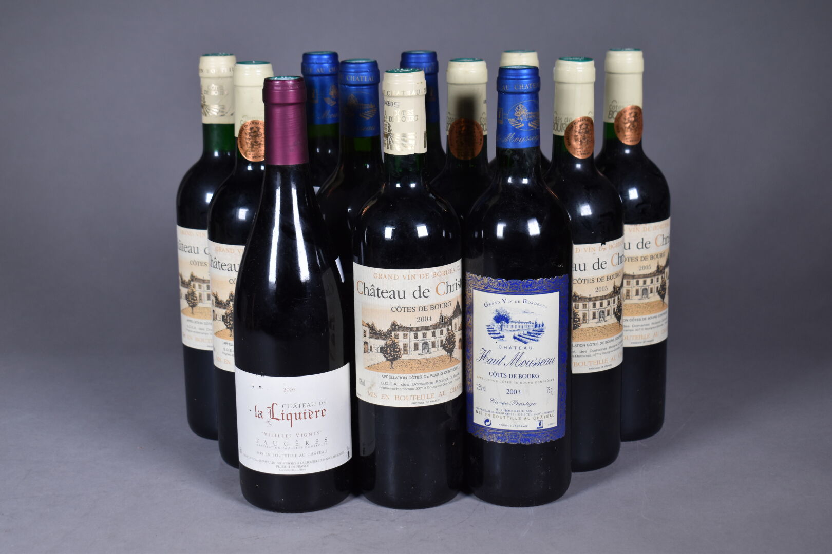 Ensemble de 12 bouteilles composé de CHÂTEAU DE CHRISTOLY, Côte de Bourg, 2004 (2 bouteilles), CHÂTEAU DE CHRISTOLY, Côte de Bourg, 2005 (5 bouteilles), CHÂTEAU HAUT MOUSSEAU, Côte de Bourg, Cuvée Prestige (4 bouteilles). On joint 1 bouteille de CHÂTEAU LA LIQUIERE, Vieille vigne Faugères 2007.