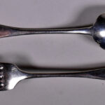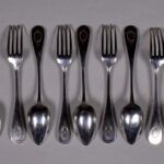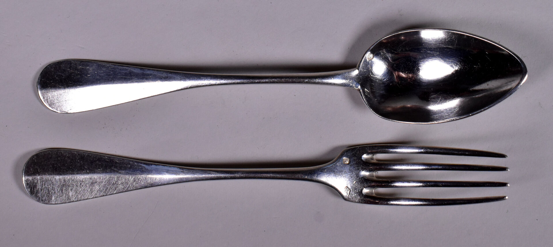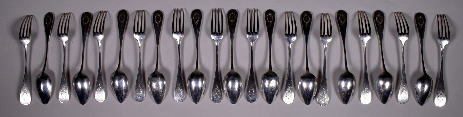 Ensemble de 12 fourchettes et 11 cuillères à entremets en argent 925/1000e modèle uniplat, chiffré dans un médaillon. Poids total. : 1098 g.