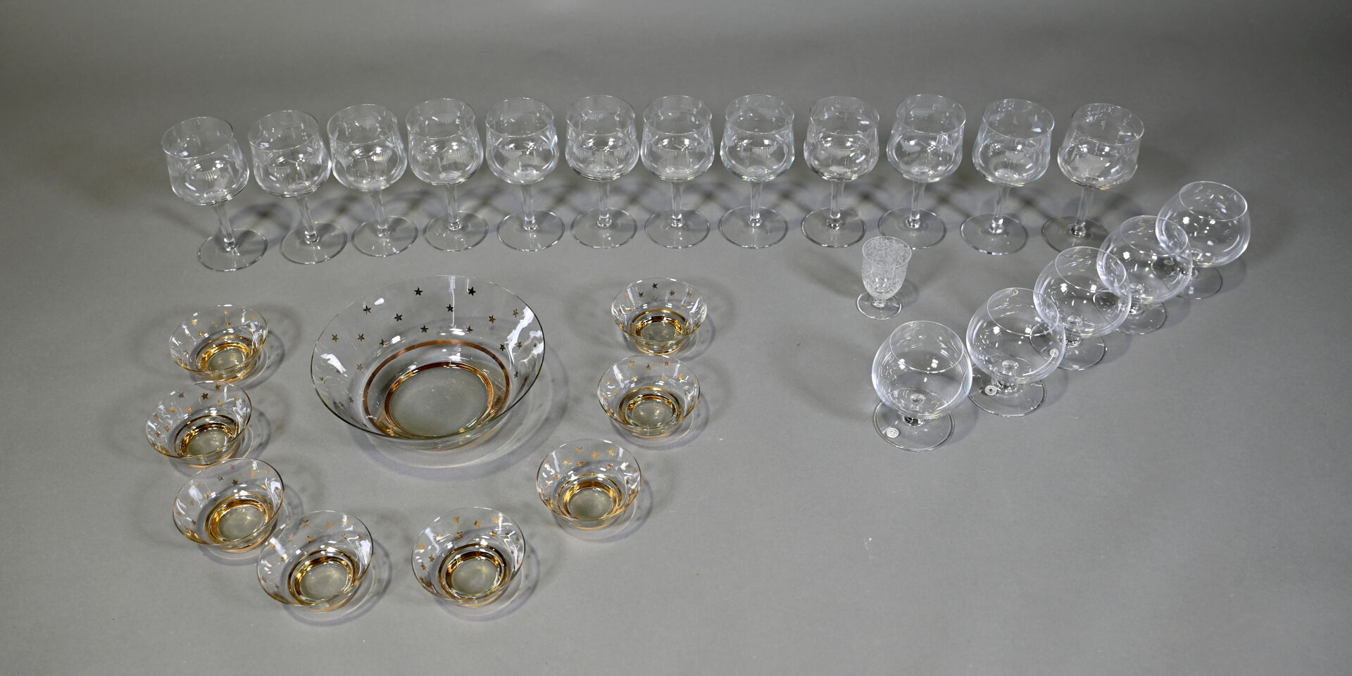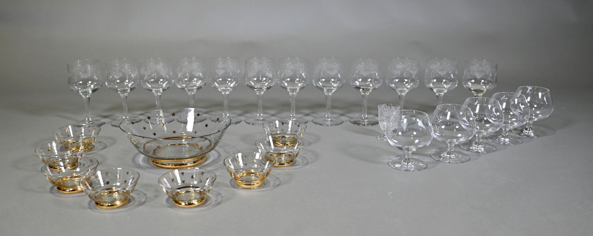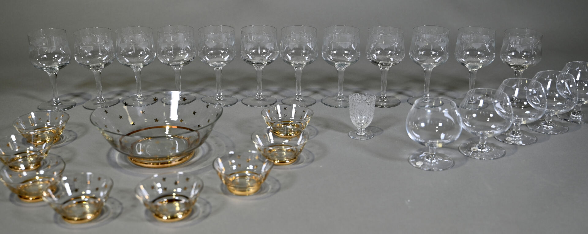 Ensemble de 12 verres à pied à décor gravé, 5 verres à cognac ?, un verre à porto et un service à fruits en verre à décor d’un semi d’étoiles or.