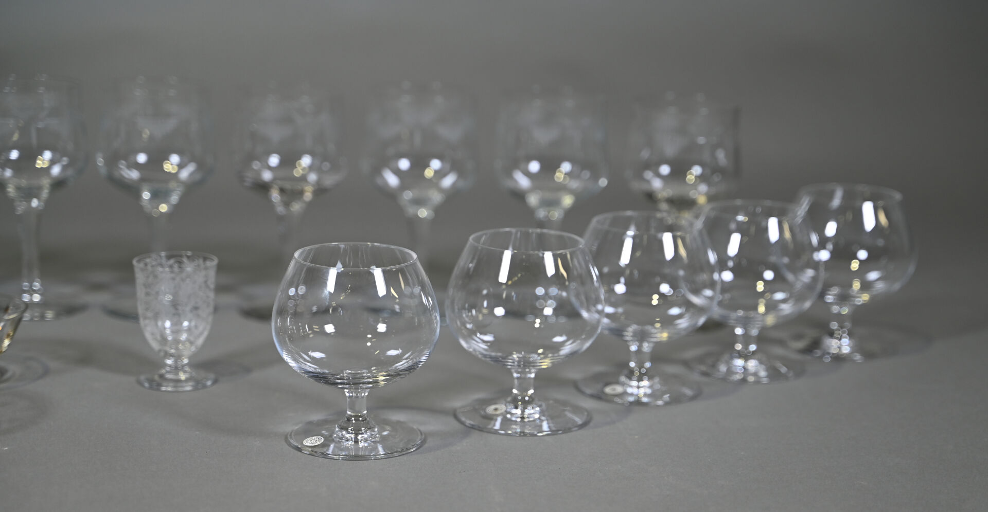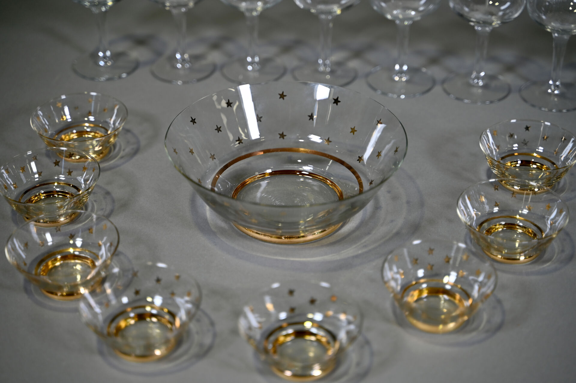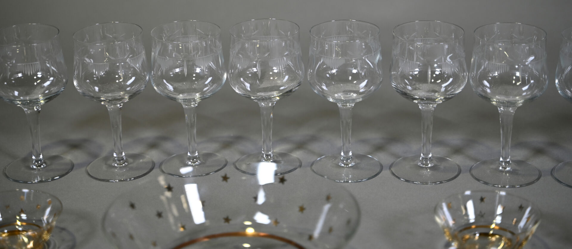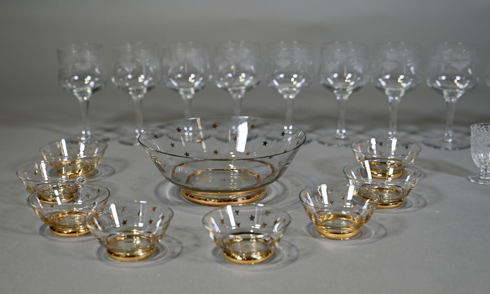 Ensemble de 12 verres à pied à décor gravé, 5 verres à cognac ?, un verre à porto et un service à fruits en verre à décor d’un semi d’étoiles or.