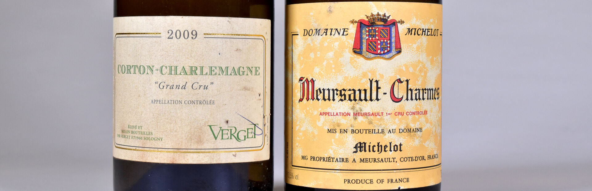 – 1 bouteille, Corton-Charlemagne Grand Cru, Verget, 2009. Étiquette légèrement sale et avec quelques petites marques.