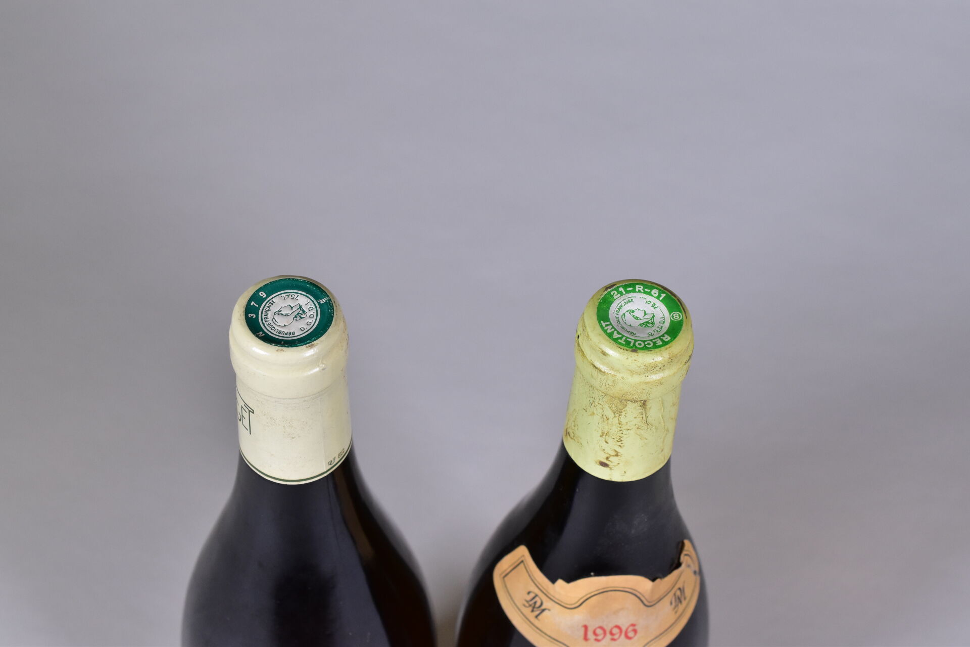 Ensemble de 2 bouteilles composé de : – 1 bouteille, Corton-Charlemagne Grand Cru, Verget, 2009. Étiquette légèrement sale et avec quelques petites marques. – 1 bouteille, Meursault 1er Cru « Charmes », Domaine Michelot, 1996. Capsule légèrement sale. Collerette légèrement fanée et abimée. Quelques petites traces sur l’étiquette.