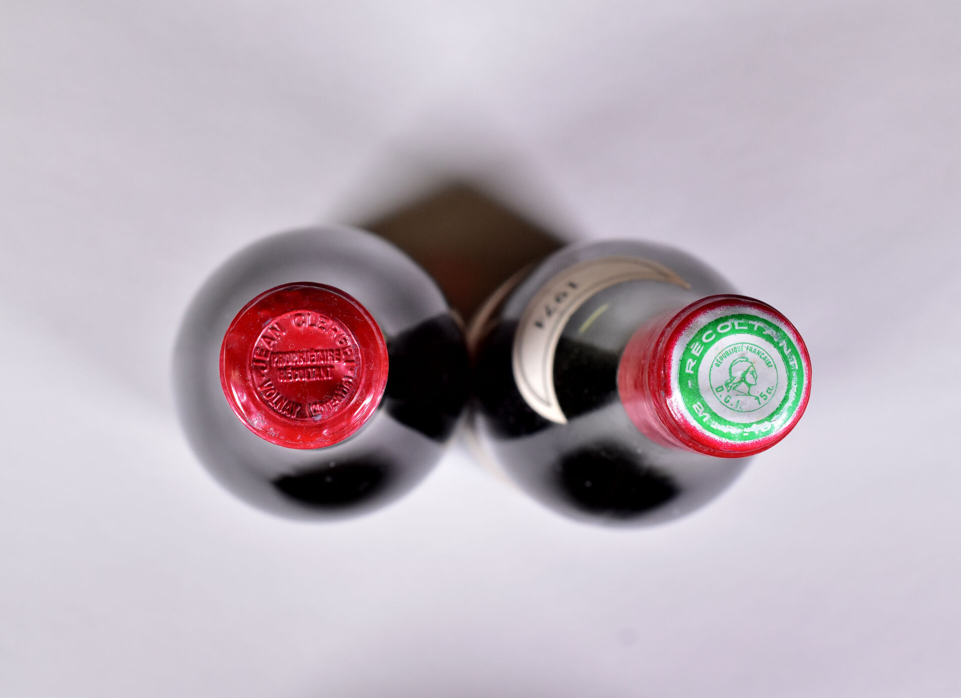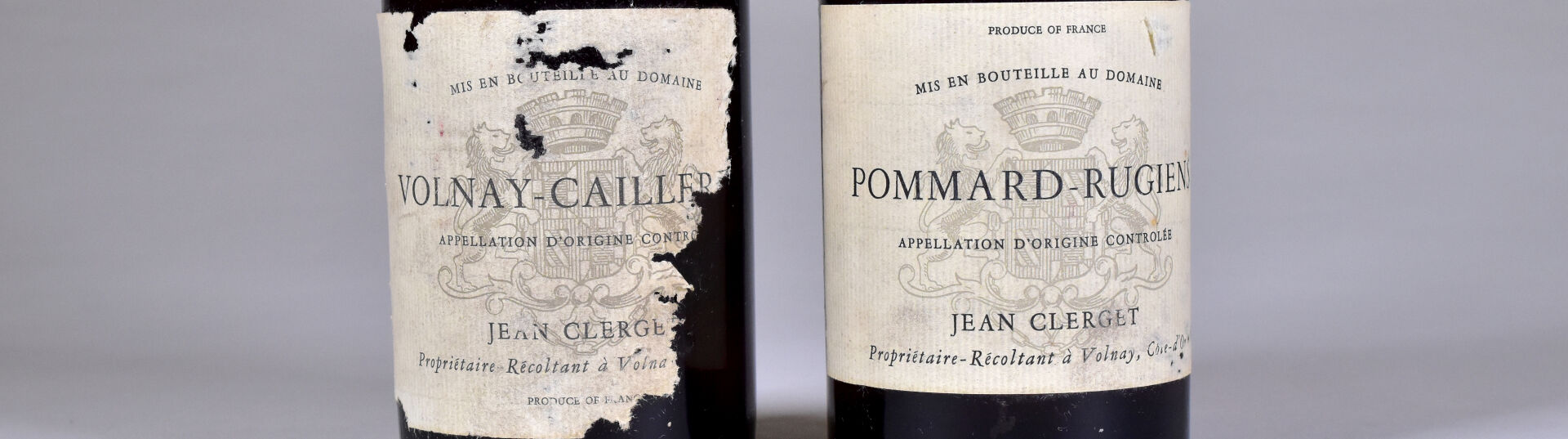 – 1 bouteille, Volnay-Caillerets, Jean Clerget. Collerette absente. 3,5 cm. Étiquette partiellement dégradée.