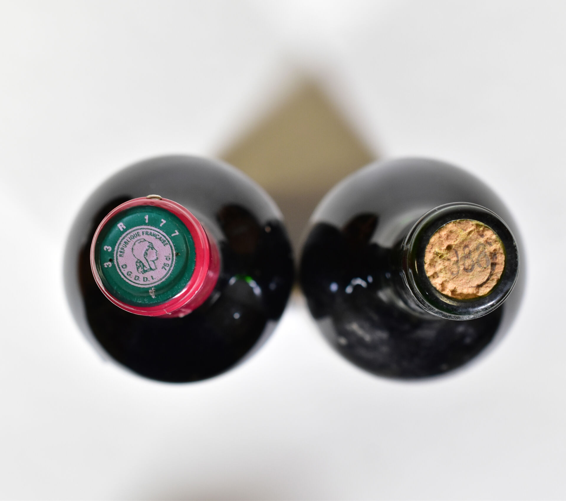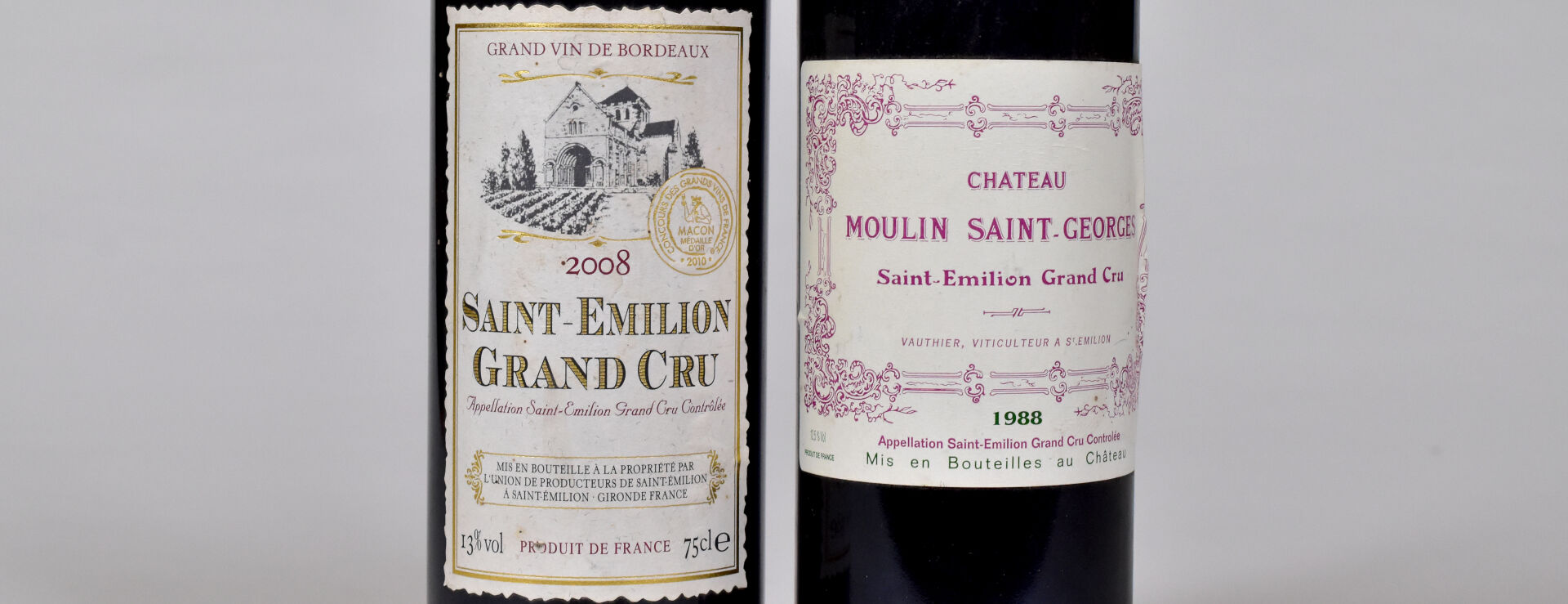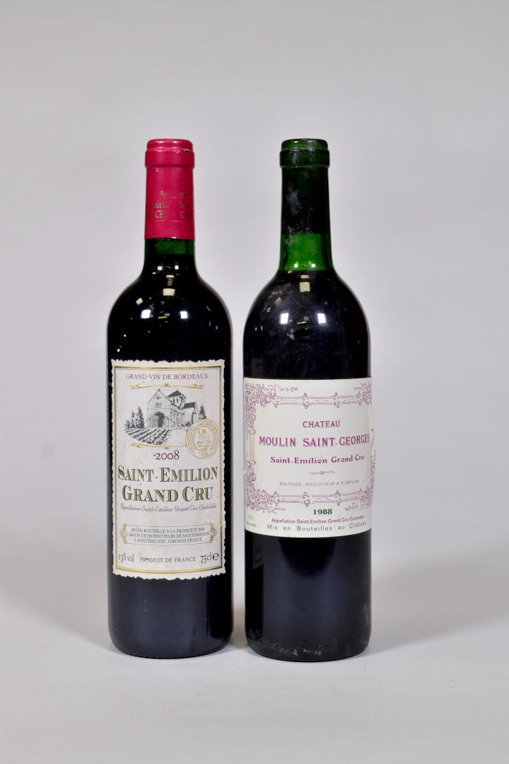 Ensemble de 2 bouteilles composé de : – 1 bouteille, Saint-Emilion Grand Cru, Union de Producteurs de Saint-Emilion, 2008. Étiquette légèrement fanée. – 1 bouteille, Saint-Emilion Grand Cru, Château Moulin Saint-Georges, 1988. BG (-). Absence de la capsule. Étiquette avec des plis.