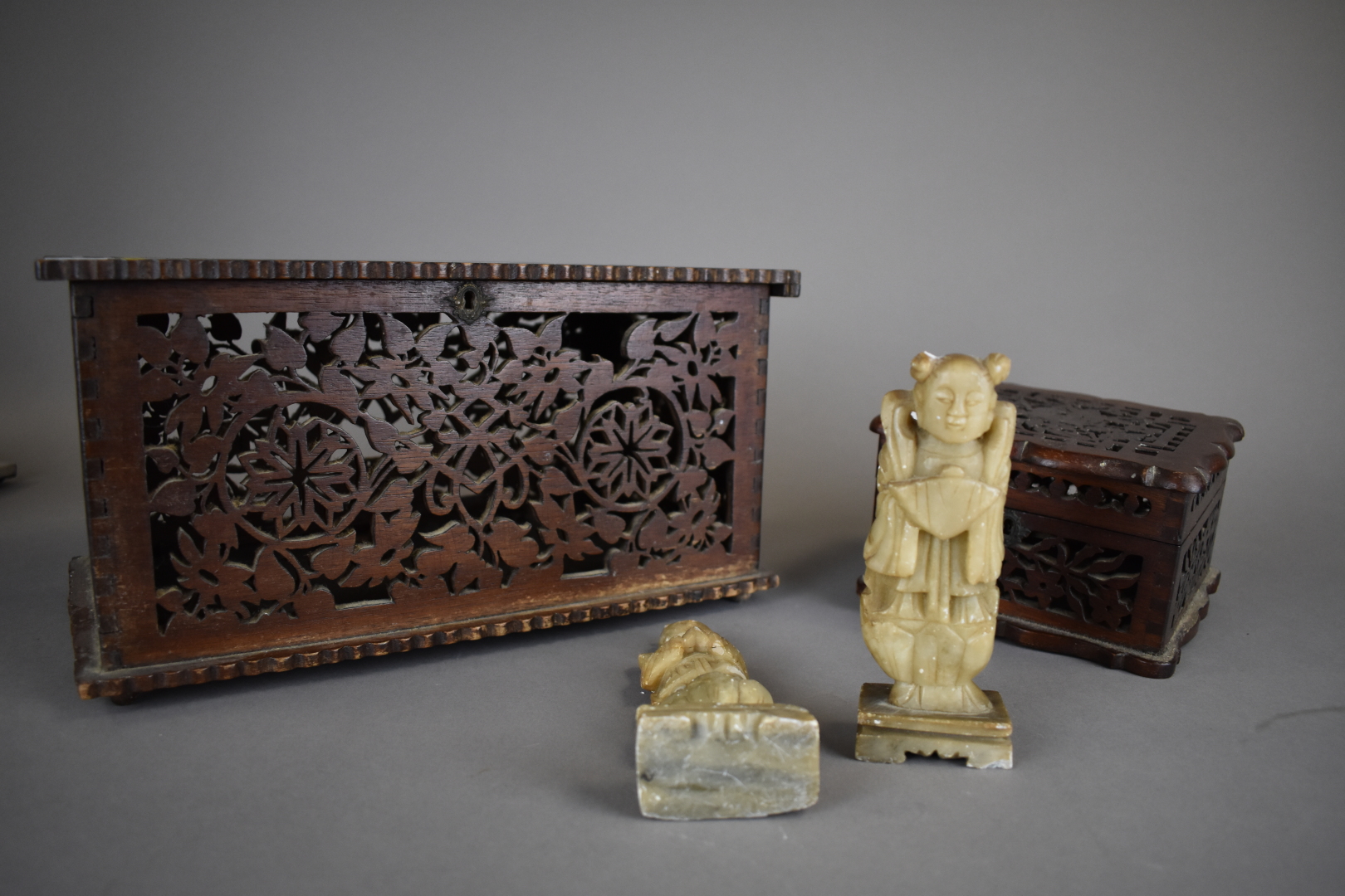 Ensemble de 2 coffret en bois ajouré à décor de fleurs. Asie du Sud-Est. XXe siècle. On joint 2 sculptures en stéatite. Chine XXe, l’une accidentée.