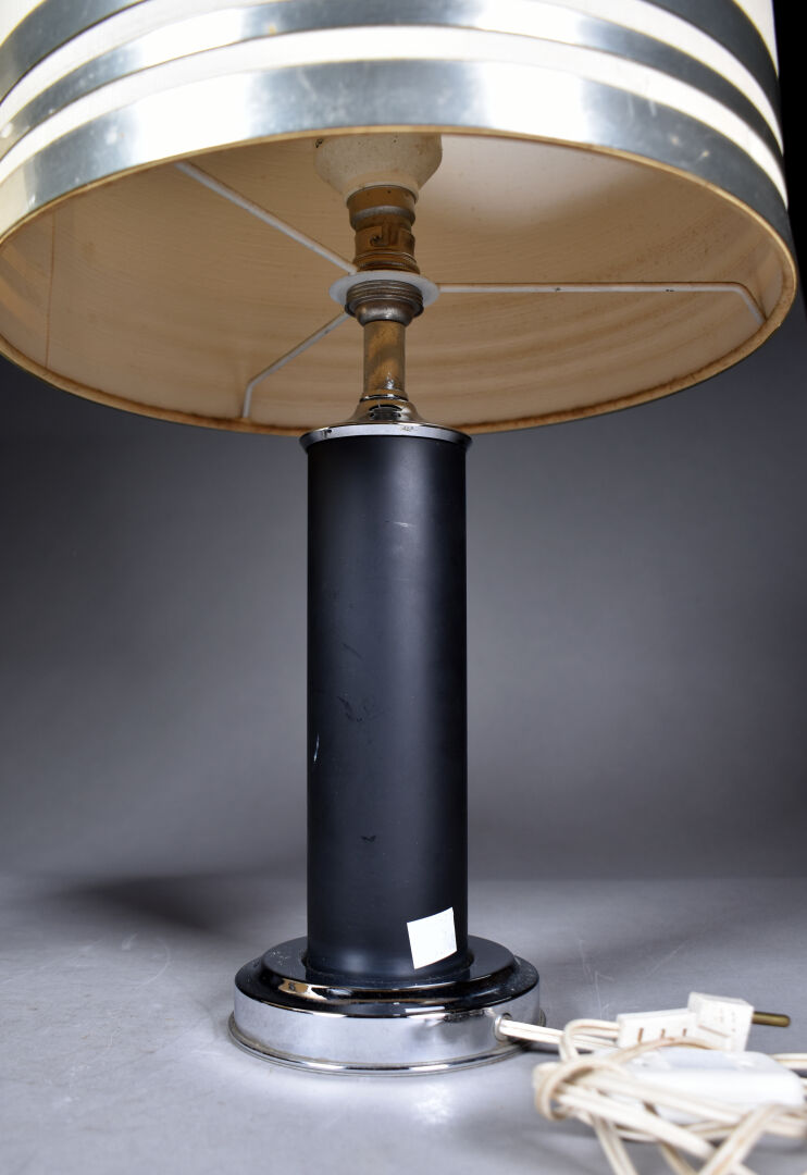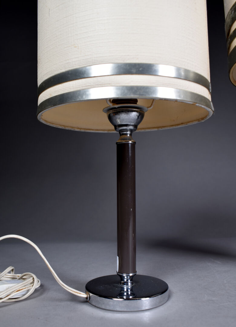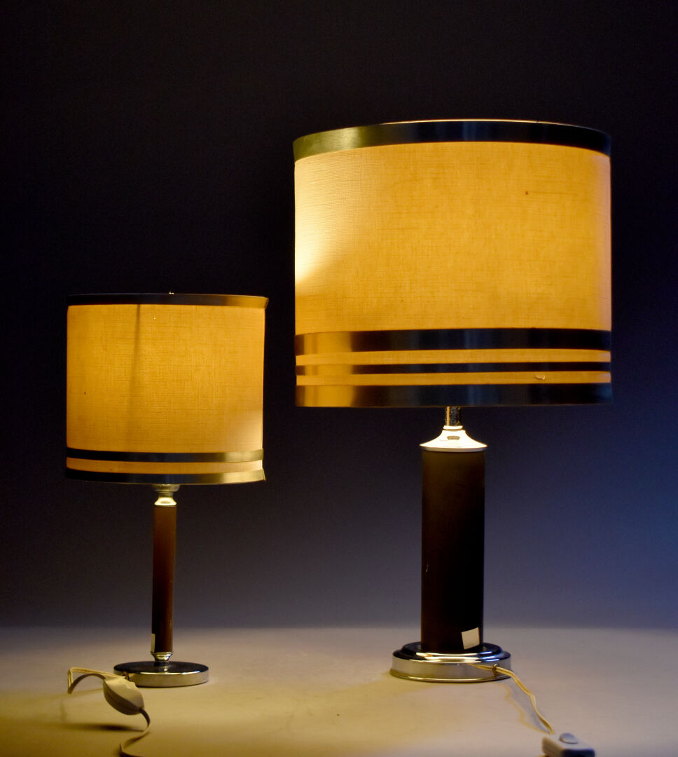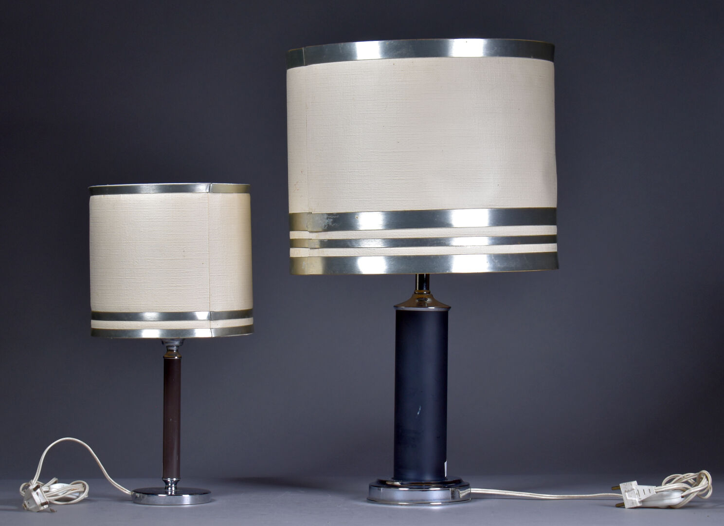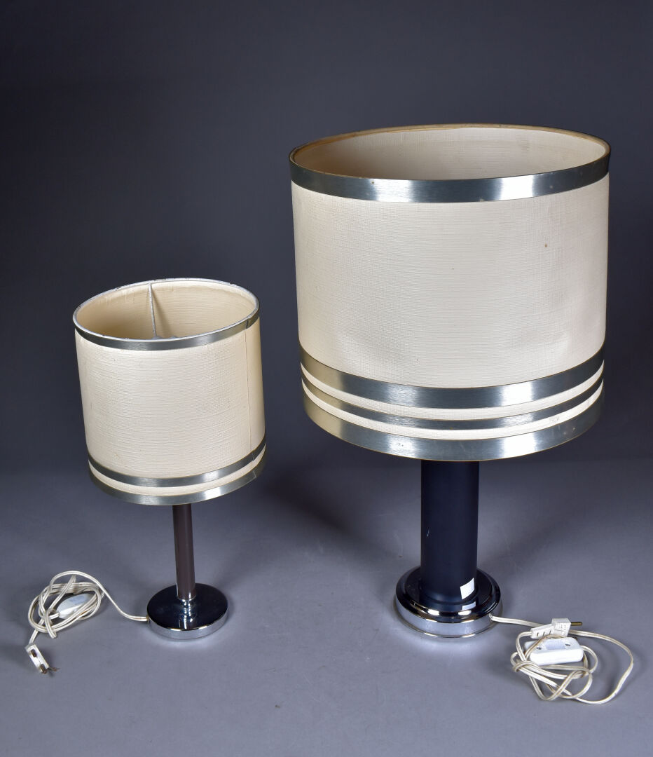 Ensemble de 2 lampes à fût en métal peint, la base du piétement chromée. Vers 1970. Hauts. : 51 cm – 37 cm.