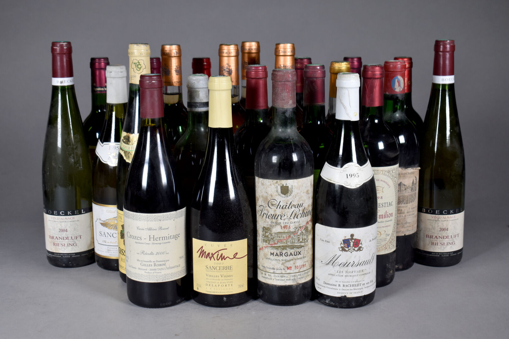 Ensemble de 24 bouteilles comprenant 1 bouteille CHÂTEAU LA GRAVETTE, Premières Côtes de Bordeaux, 2003 , 1 bouteille FONT DESTIAC, Saint-Emilion, 1998, 1 bouteille CHÂTEAU D’ARCHANBEAU, Bordeaux Grave, 1998, 1 CHÂTEAU LE LESCOT, Médoc, 1996, 1 CHÂTEAU PEYRAT, Bordeaux Sec, 1979 (niveau bas), 1 bouteille CHÂTEAU PRIEURE LICHINE, Grand Cru Classé, Margaux, 1974, 1 bouteille B. BACHELET ET FILS, Meursault « Les Narvaux », 1995, 1 bouteille CHÂTEAU LE BOURDIEU, Haut-Médoc, 1973, 1 bouteille CHÂTEAU VOIGNY, Sauternes, 2000, 4 bouteilles CHÂTEAU BEAUMET, Côte de Provence, Cuvée Diamant, 2013, 1 bouteille CUVEE MAXIME, Sancerre, par Vincent et Jean-Yves Delaporte, 2007, 1 bouteille CHÂTEAU LACOMBE CADIOT, Bordeaux Supérieur 1999, 1 bouteille CHÂTEAU DE PARDAILLAN, Bordeaux Supérieur, 2000, 1 bouteille CHÂTEAU LE CROCK, Saint-Etstèphe, Cru Bourgeois,1999, 1 bouteille CHÂTEAU REYNON, Premières Côtes de Bordeaux, 1998, 1bouteille SANCERRE PATRICK DEZAT, 1995, 1 bouteille CHÂTEAU LA GRAVETTE, Premières Côtes de Bordeaux 2003, 1 bouteille CROZES HERMITAGE, Cuvée Albéric Bouvet, Récolte 2000 par Gilles Robin, 2 bouteilles BOECKEL BRANDLUFT RIESLING, Alsace, 2004 et 1 bouteille W. GISSELBRECHT, Riesling.