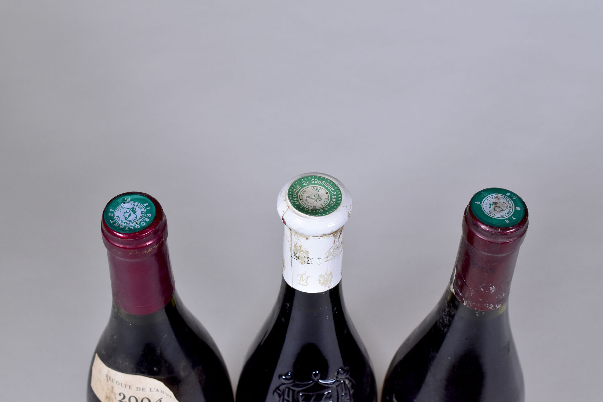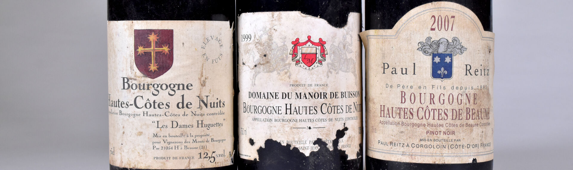 Ensemble de 3 bouteilles composé de : – 1 bouteille, Bourgogne-Hautes Côtes de Nuits, Domaine du Manoir de Buisson, 1999. Étiquette sale et dégradée. – 1 bouteille, Bourgogne-Hautes Côtes de Nuits, « Les Dames Huguettes », Vignerons des Monts de Bourgogne, 2004. Collerette et étiquette sales. La collerette est partiellement décolée. – 1 bouteille, Bourgogne-Hautes Côtes de Beaune, Paul Reitz, 2007. Étiquette sale.