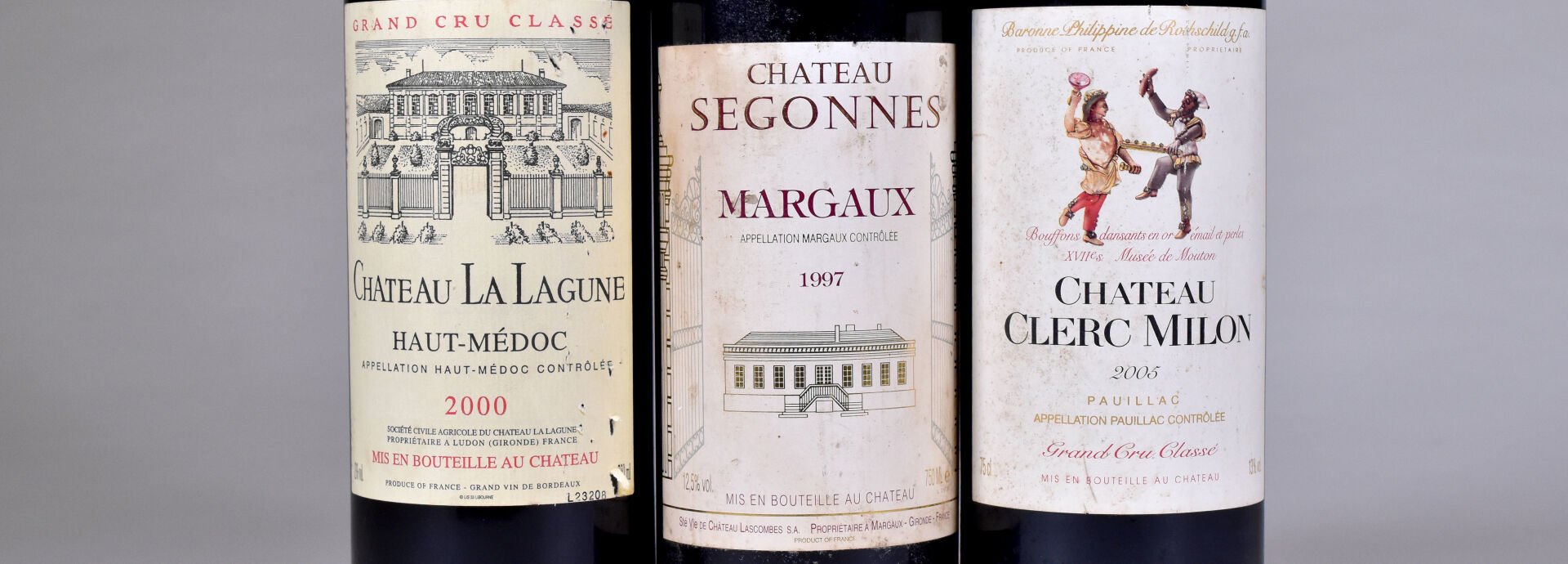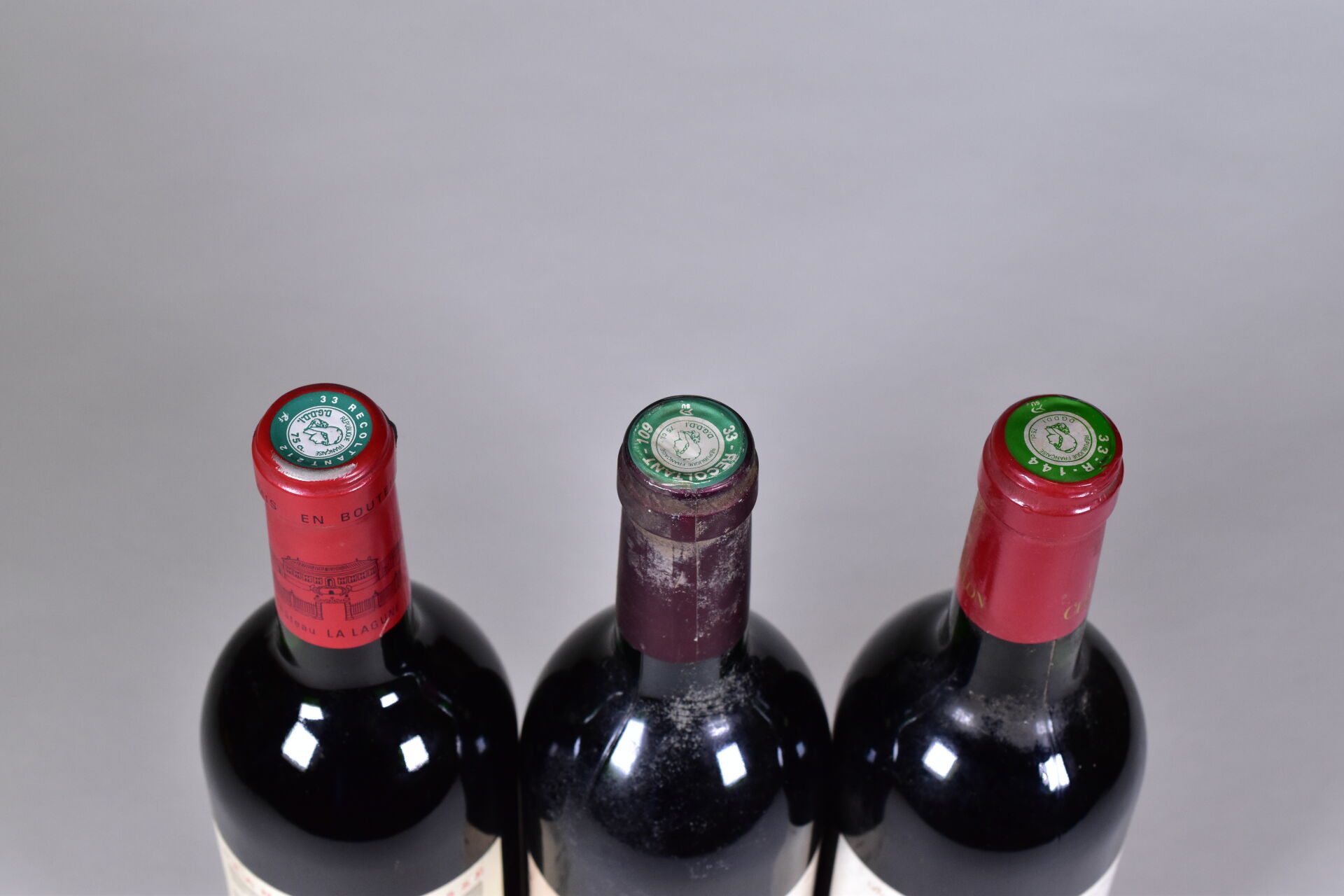 Ensemble de 3 bouteilles composé de : – 1 bouteille, Pauillac, Clerc Milon, 5ème Grand Cru classé, 2005. Étiquette légèrement sale. – 1 bouteille, Haut-Médoc, Château La Lagune, 3ème Grand Cru Classé, 2000. BG+. Étiquette avec quelques petites marques. – 1 bouteille, Margaux, Château Segonnes, 1997. BG+. Capsule et étiquette sales.