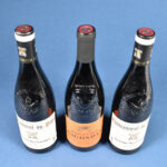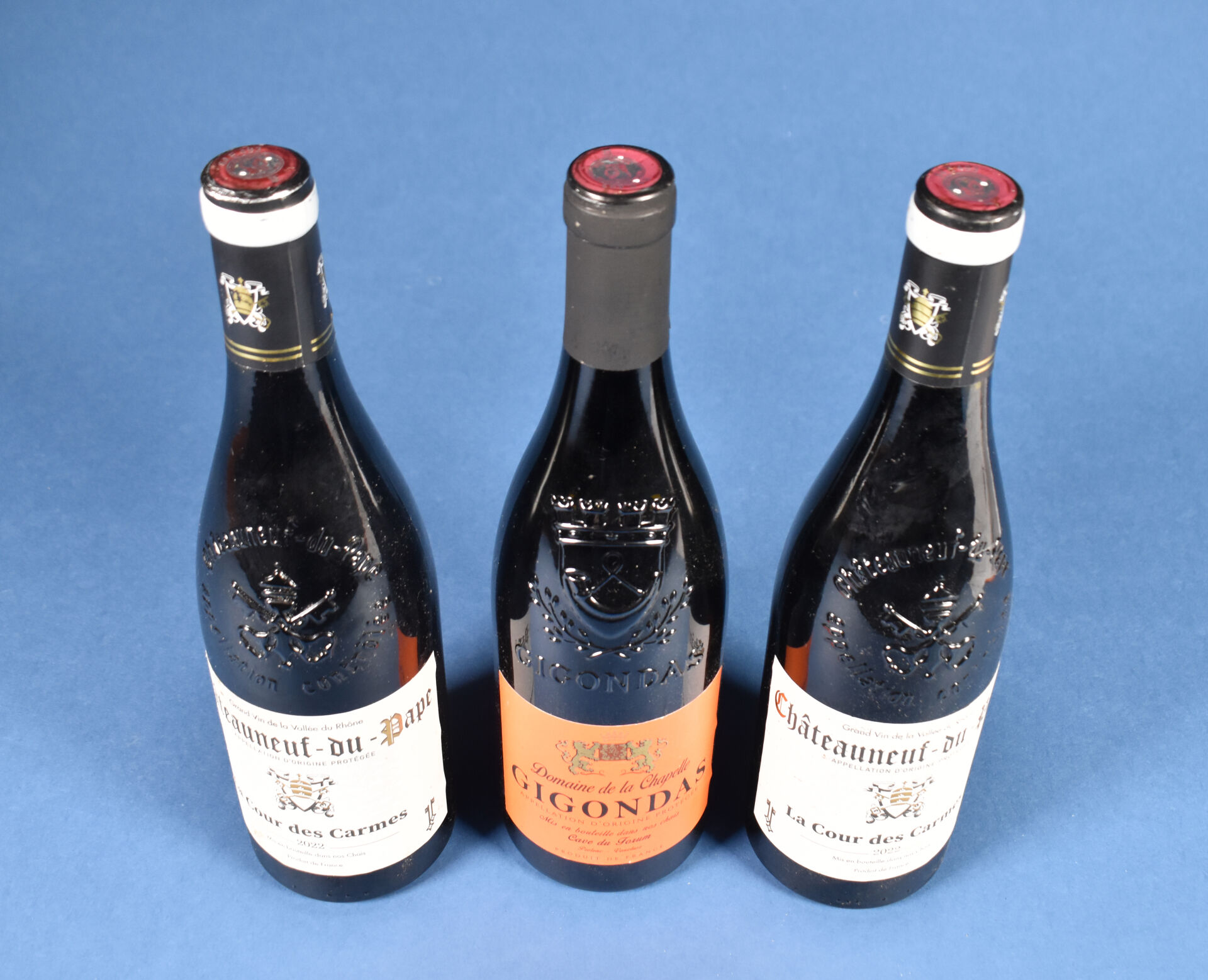 Ensemble de 3 bouteilles de RHÔNE composé de : 2 bouteilles, Châteauneuf-du-Pape, La Cour des Carmes, 2022. Quelques petites traces sur l’étiquette. 1 bouteille, Gigondas, Domaine de la Chapelle, 2022.