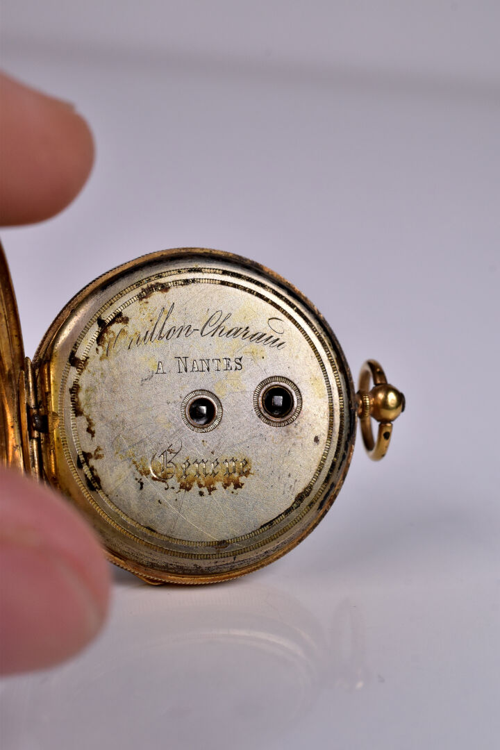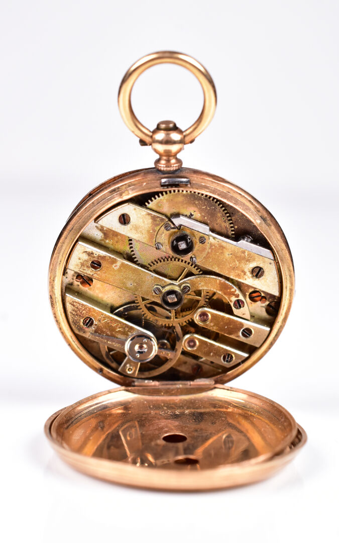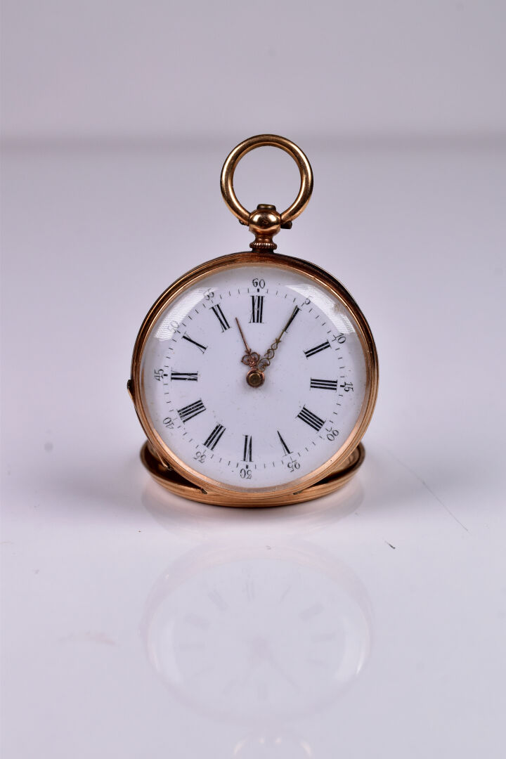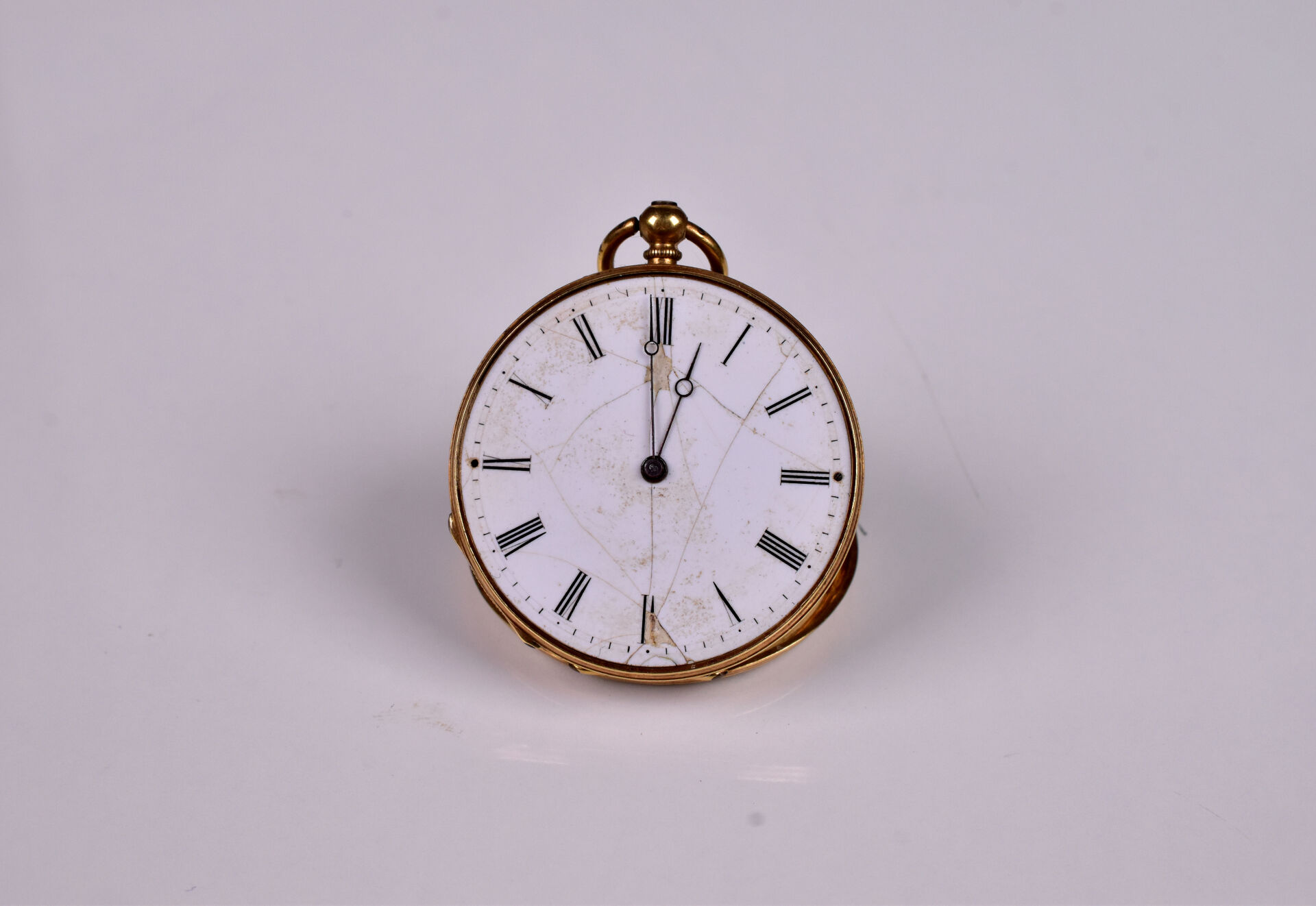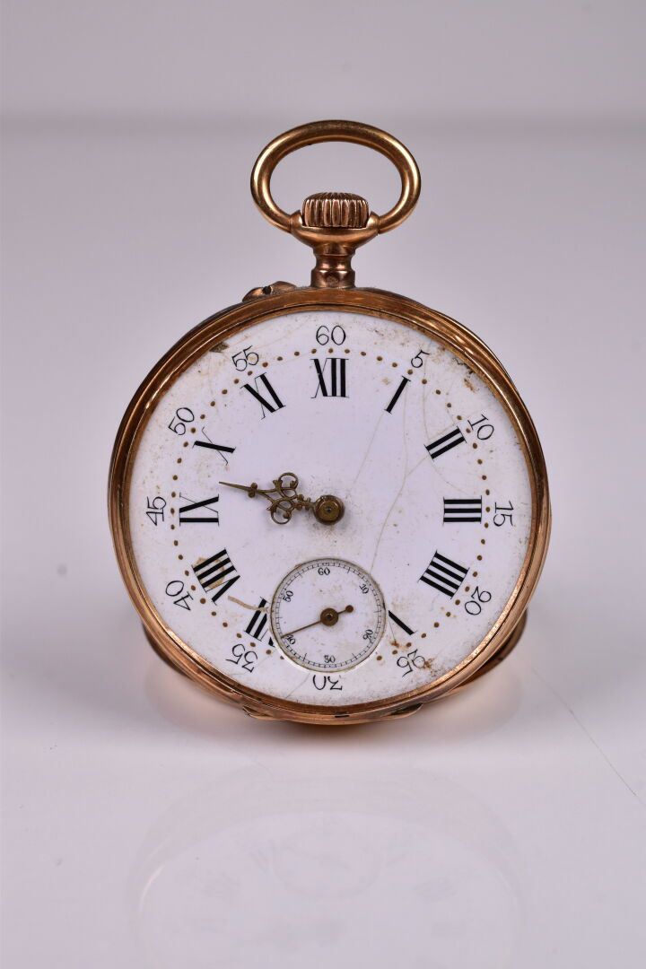 Ensemble de 3 montre à gousset et montres de cols en or 18K 750/1000e (un cache-poussière en métal, accidents, manques). Poids brut total. : 104,6 g. On joint une broche ronde en or 18K 750/1000e et perles (manque) et une clé de montre formant broche en or 18K. Poids des deux : 8,4 g.