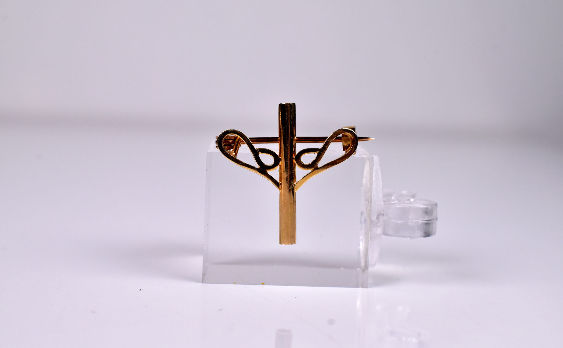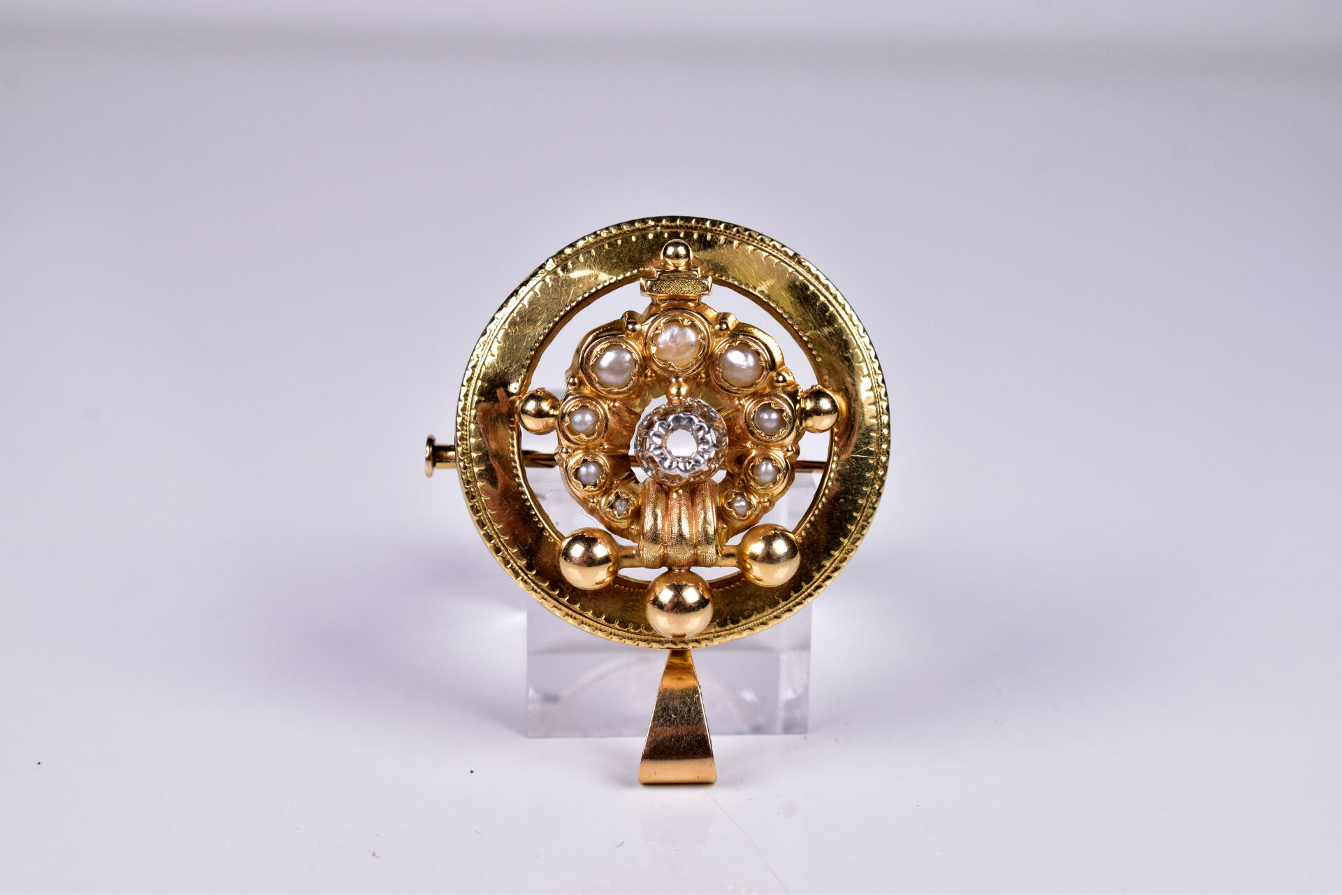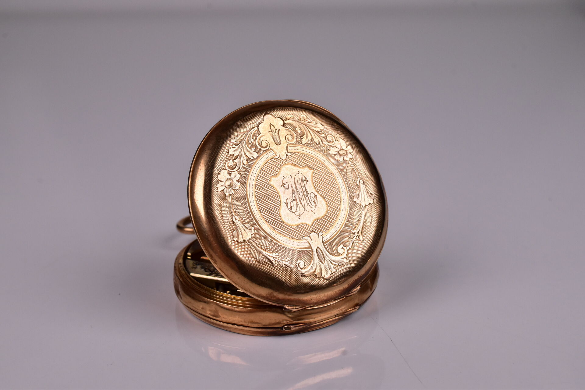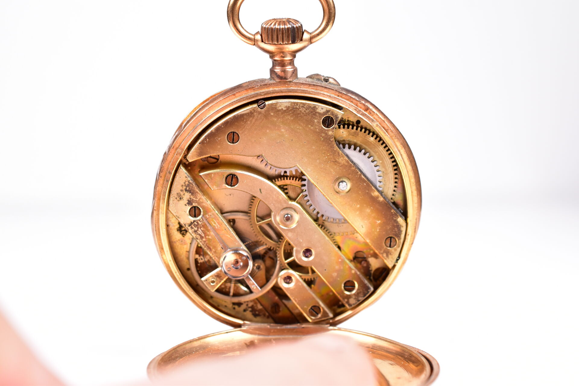 Ensemble de 3 montre à gousset et montres de cols en or 18K 750/1000e (un cache-poussière en métal, accidents, manques). Poids brut total. : 104,6 g. On joint une broche ronde en or 18K 750/1000e et perles (manque) et une clé de montre formant broche en or 18K. Poids des deux : 8,4 g.