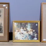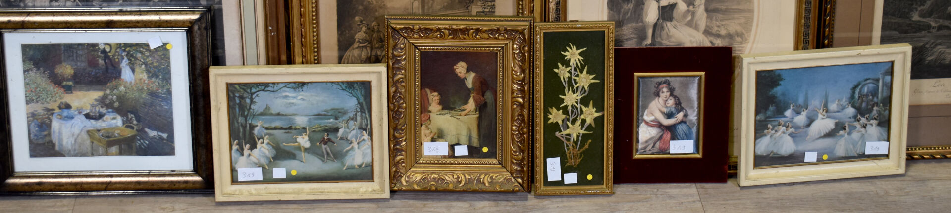 Ensemble de 32 pièces encadrées, principalement des reproductions et des gravures du XIXe siècle (certains cadres accidentés, taches, usures, restaurations).