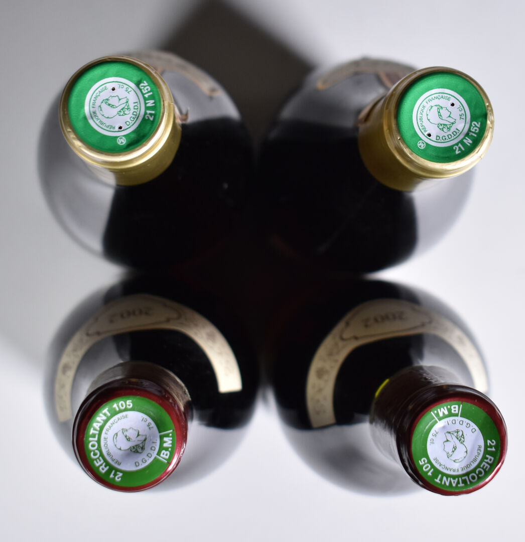 Ensemble de 4 bouteilles composé de : – 2 bouteilles, Pommard, Morin père et fils, 2001. Les étiquettes présentent une petite déchirure dans leur partie inférieure. Une étiquette est également tachée. – 2 bouteilles, Pommard, Charles Bidot-Balsemin, 2002. Quelques légères traces sur les étiquettes.
