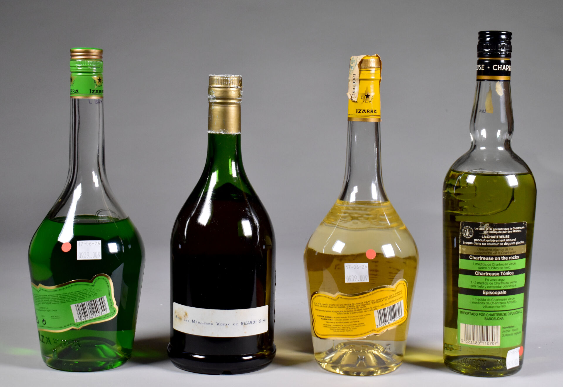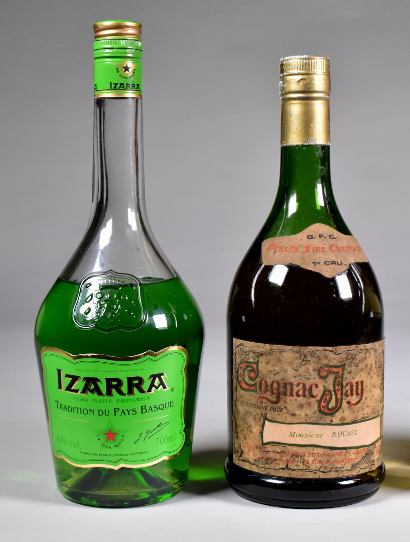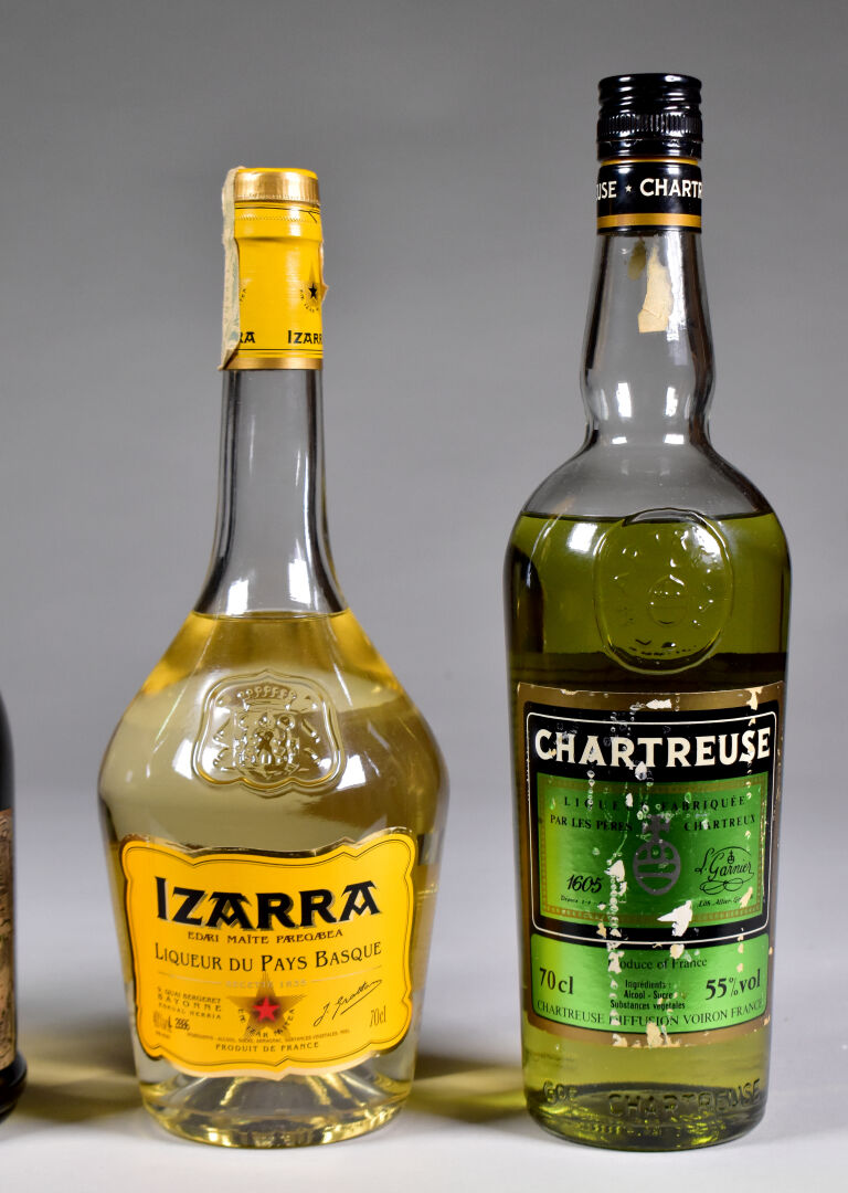 Ensemble de 4 bouteilles de SPIRITUEUX composé de : 1 bouteille, Chartreuse Verte, Voiron, période 1992-2006. Niveau à 8,5cm. Etiquette abimée avec des traces de frottement et de nombreux manques. 1 bouteille, Cognac Grande Fine Champagne 1er Cru, Jay. Domaine du Tilloux. Niveau à 5,5 cm. Capsule légèrement dégradée. Collerette et étiquette sales, fanées et avec des traces d’humidité. 1 bouteille, Izarra Jaune, Liqueur du Pays Basque. Niveau à 7 cm. 1 bouteille, Izarra Verte, Tradition du Pays Basque. Niveau à 10,5 cm.
