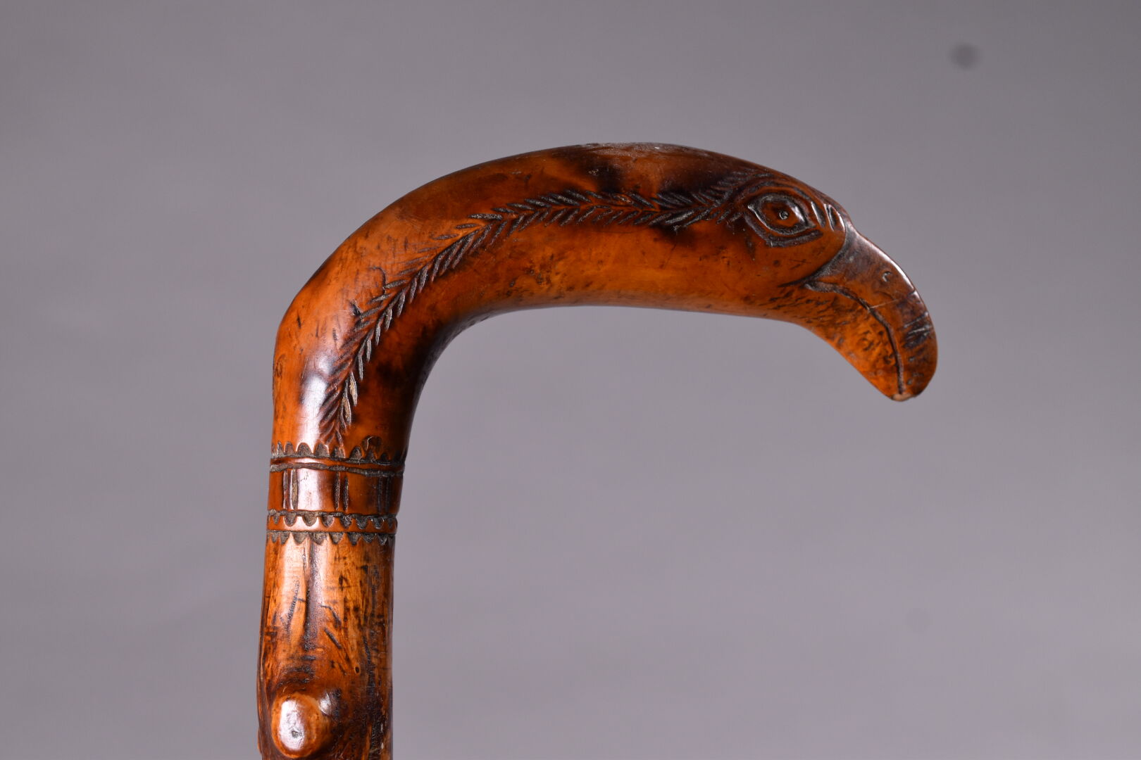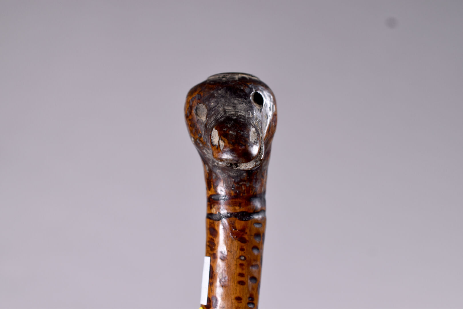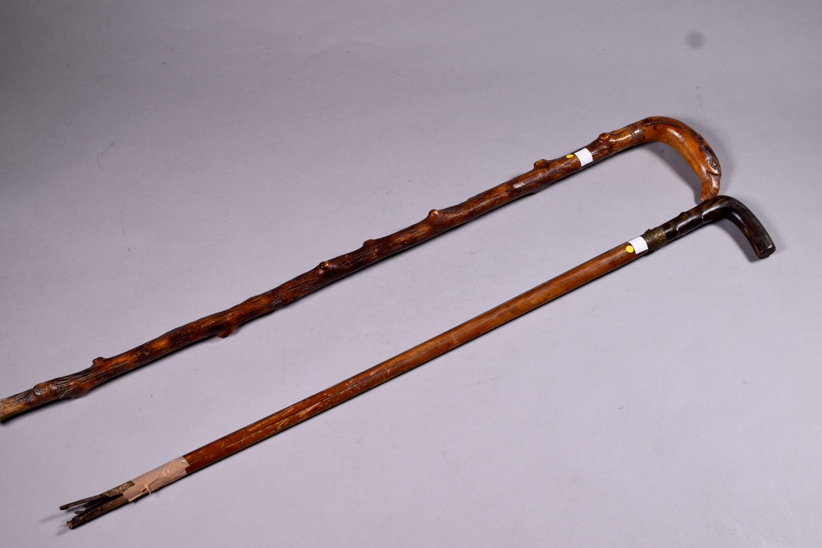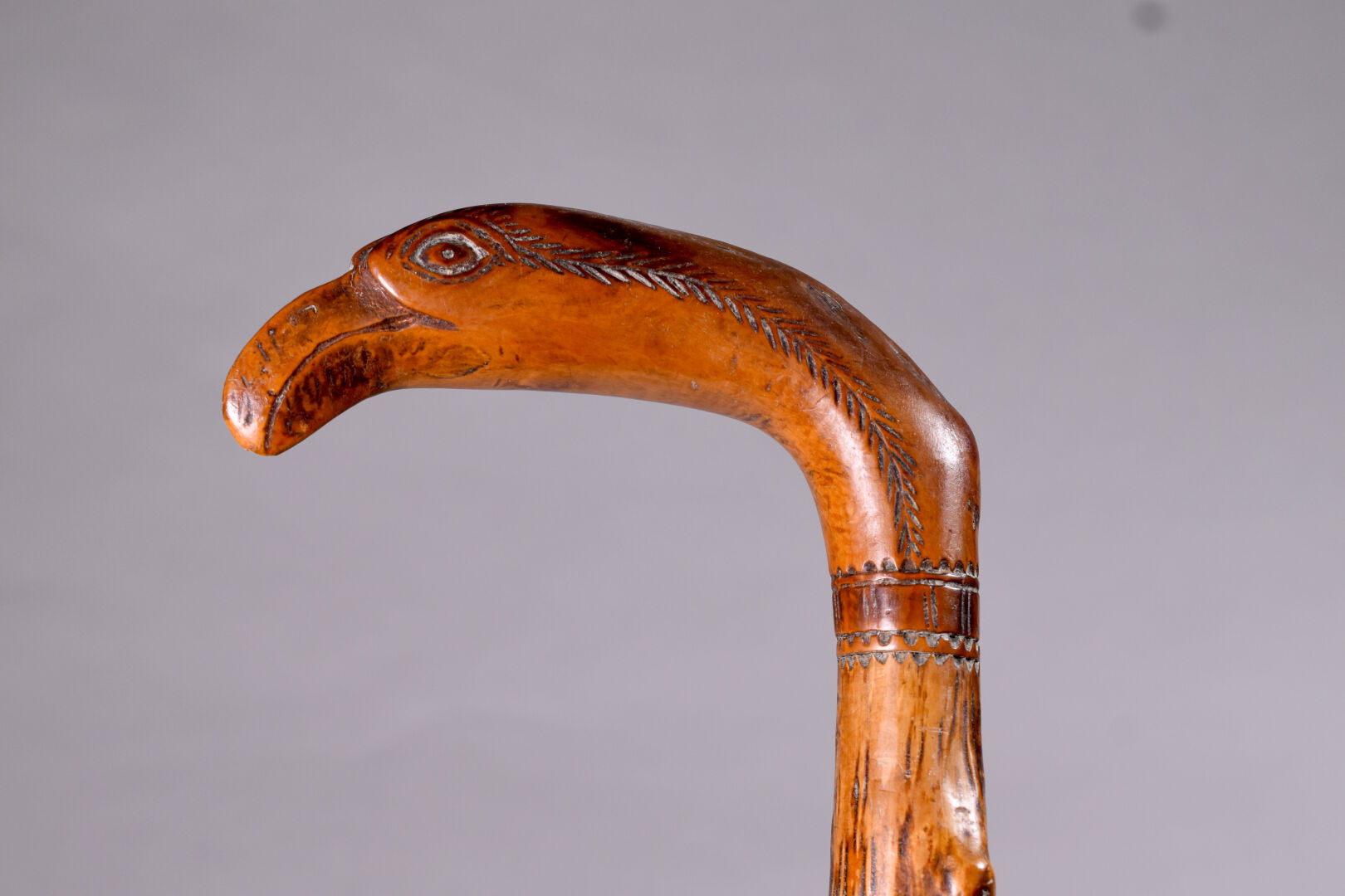 Ensemble de 4 cannes soit une canne épée (fendue, accident), une à pommeau de cuivre, une canne poignard et une à pommeau sculpté d’une tête d’oiseau (usures).