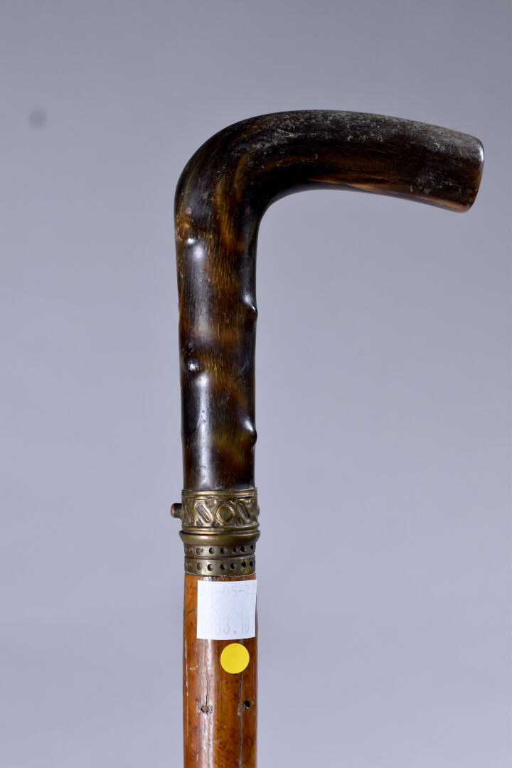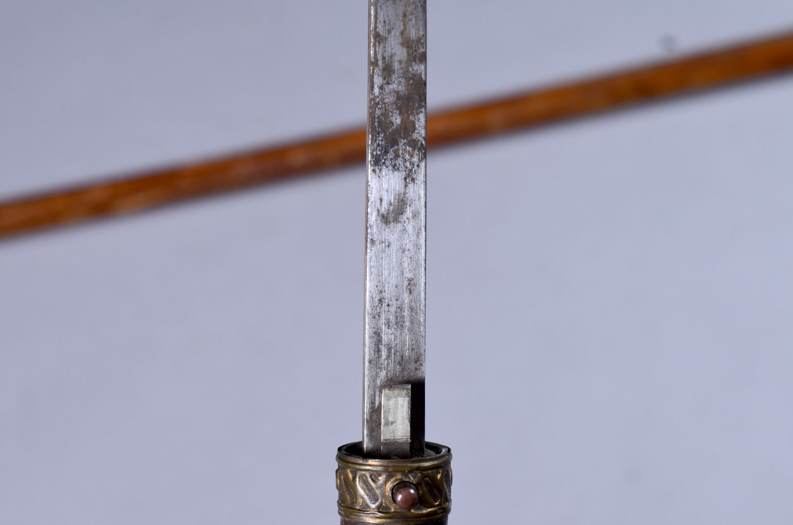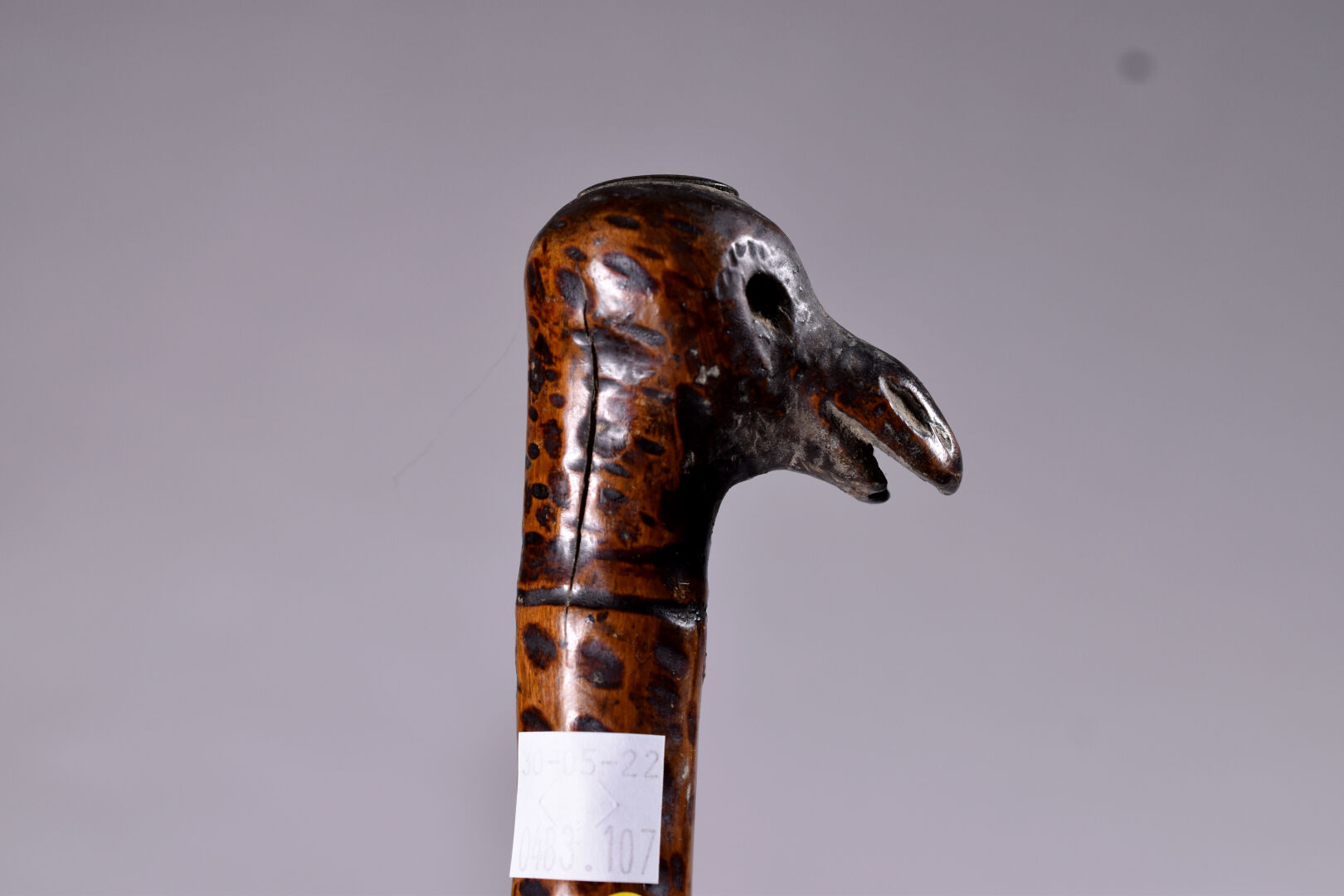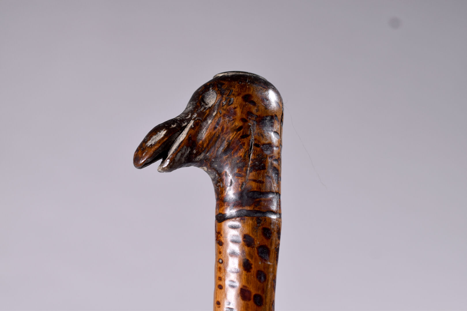 Ensemble de 4 cannes soit une canne épée (fendue, accident), une à pommeau de cuivre, une canne poignard et une à pommeau sculpté d’une tête d’oiseau (usures).