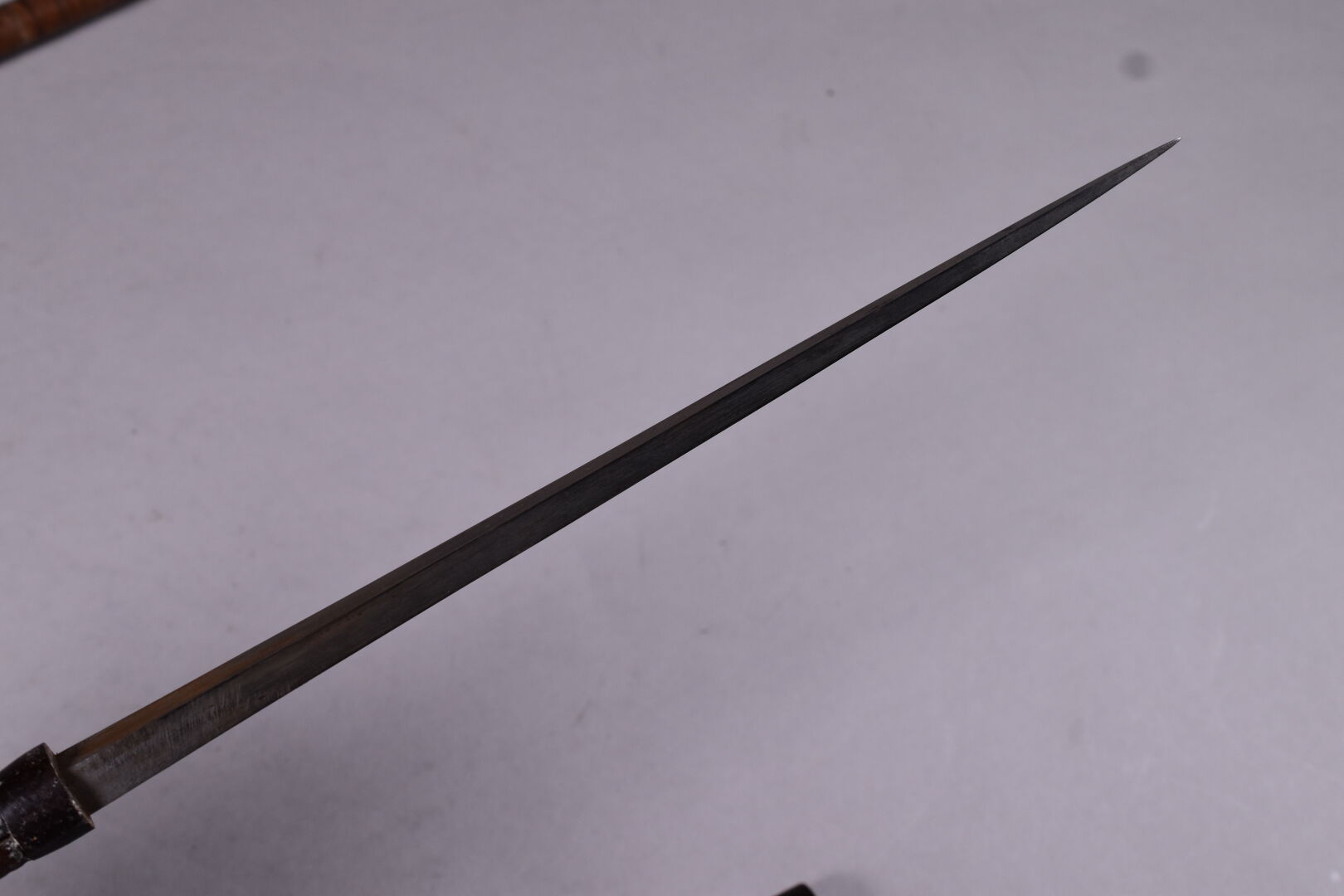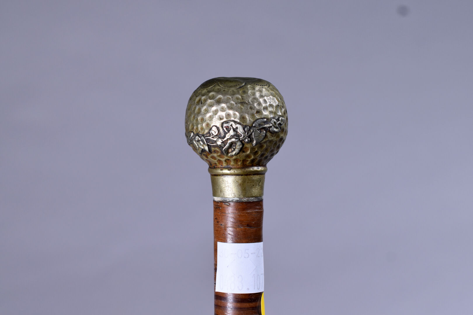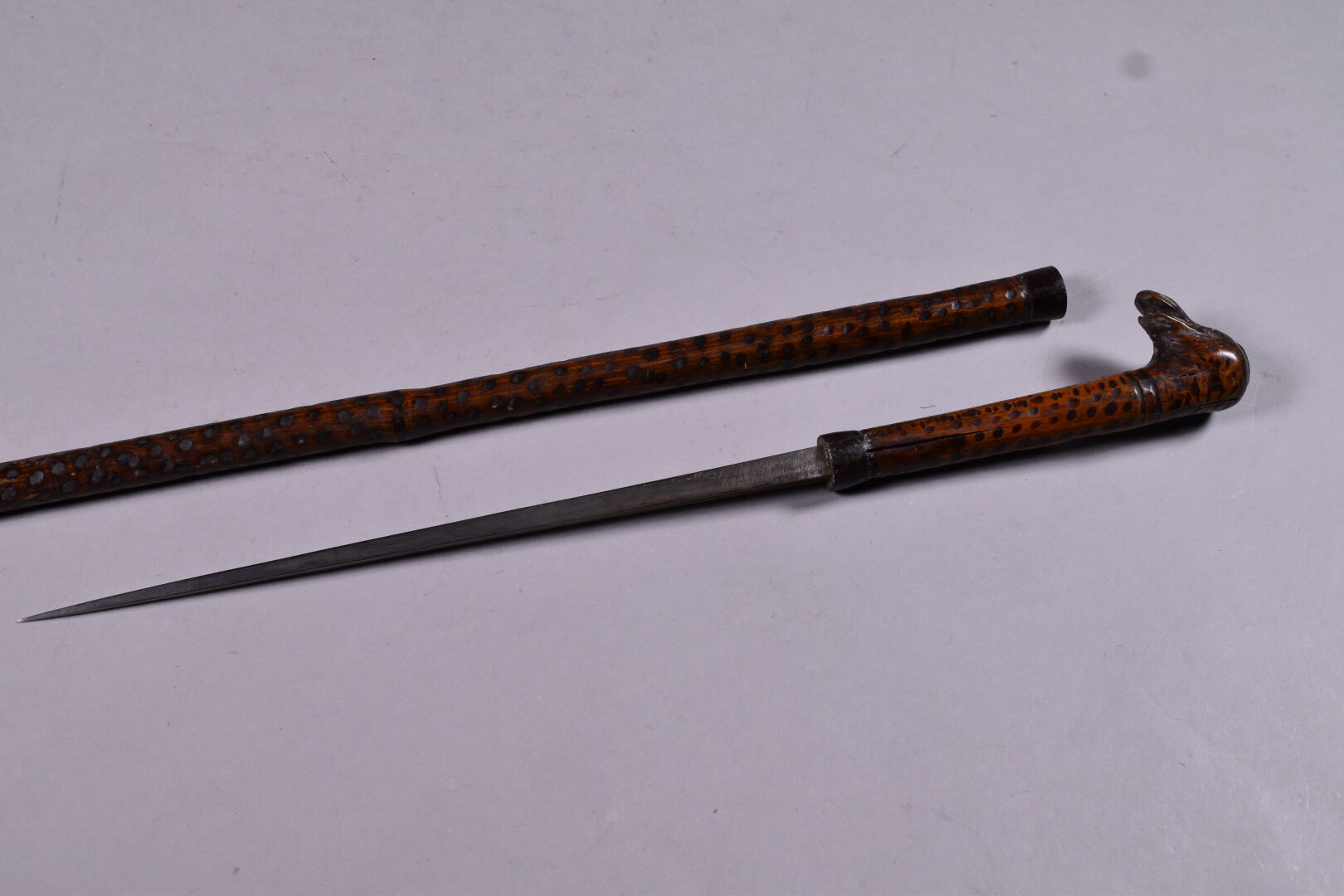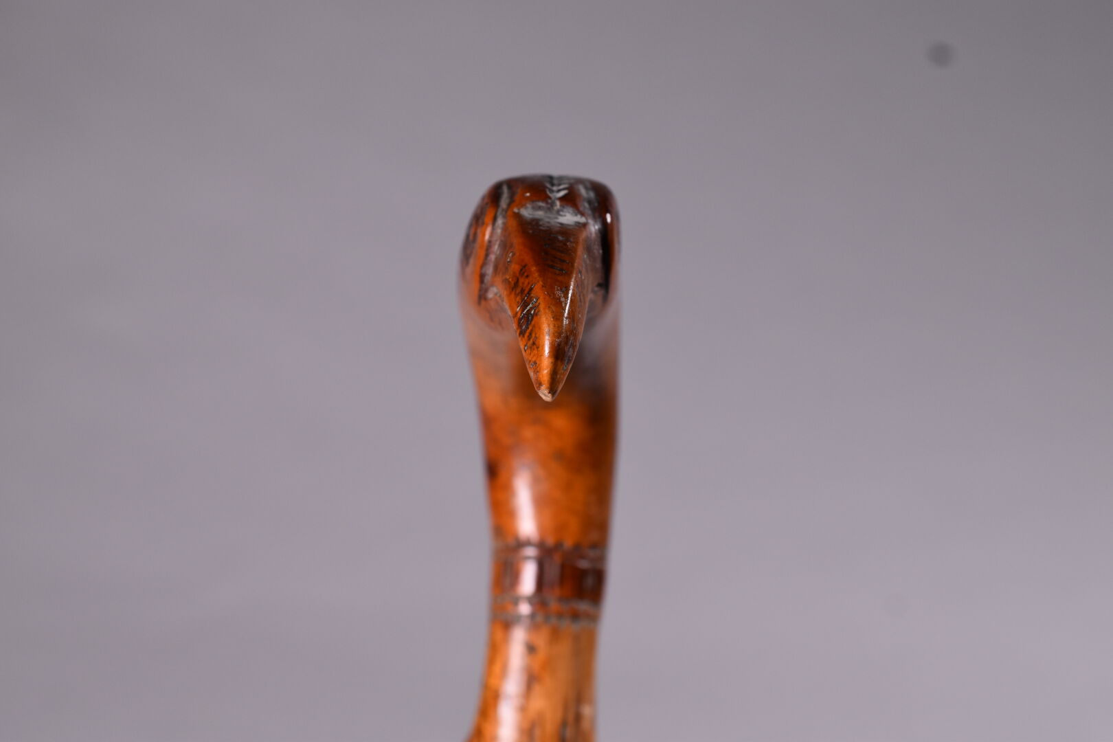 Ensemble de 4 cannes soit une canne épée (fendue, accident), une à pommeau de cuivre, une canne poignard et une à pommeau sculpté d’une tête d’oiseau (usures).