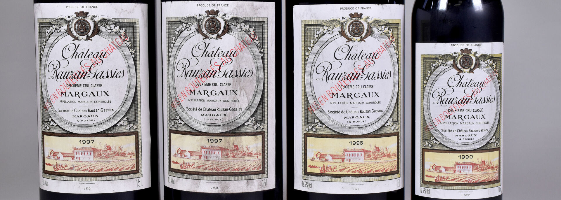 Ensemble de 4 flacons composé de : – 1 magnum, Margaux, Château Rauzan-Gassies, 2ème Grand Cru Classé, 1996. Quelques traces sur l’étiquette. – 2 magnums, Margaux, Château Rauzan-Gassies, 2ème Grand Cru Classé, 1997. Capsules légèrement sales et abimées en bas de jupe. Étiquettes légèrement sales à sales. – 1 bouteille, Margaux, Château Rauzan-Gassies, 2ème Grand Cru Classé, 1990. 1 BG. Quelques traces sur l’étiquette.