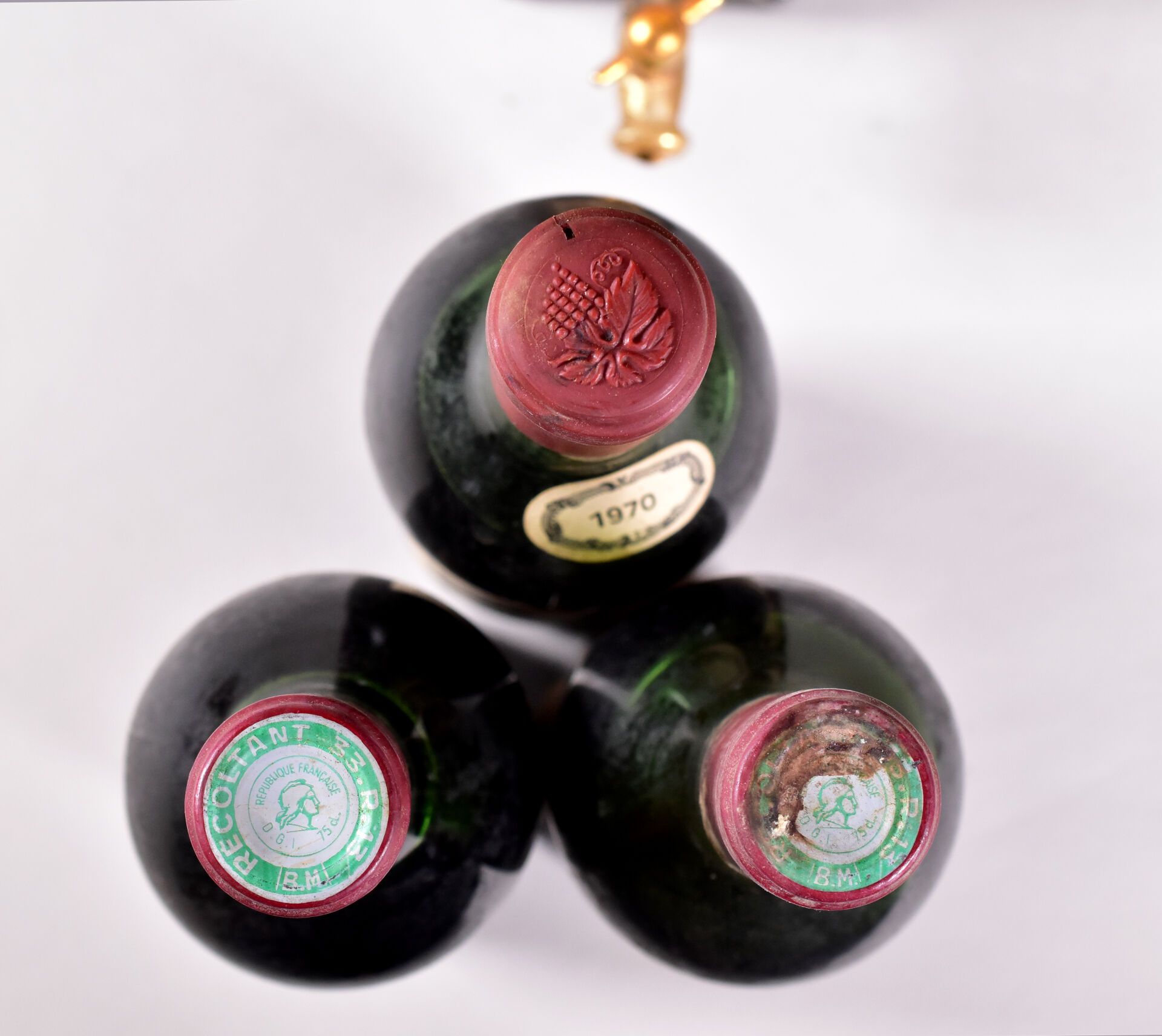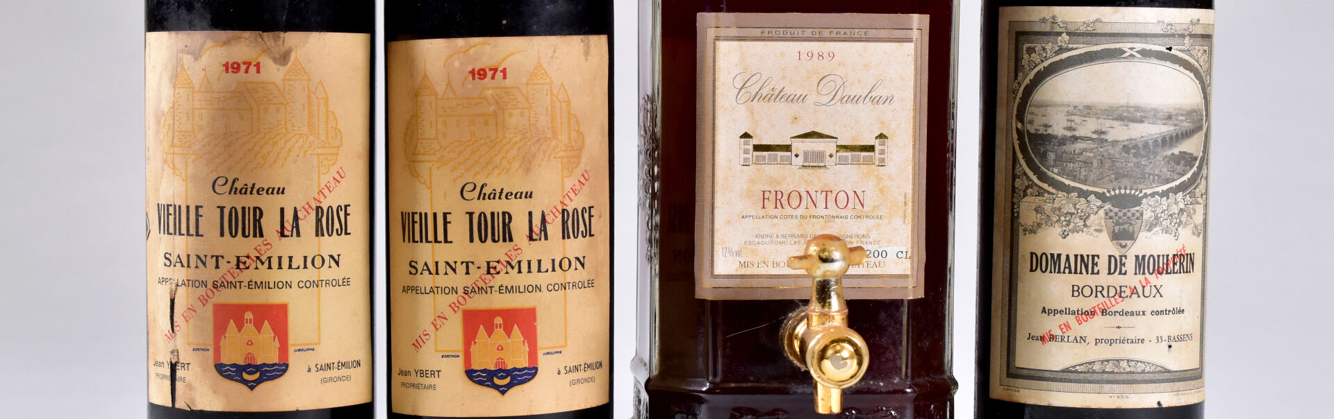 Ensemble de 4 flacons composé de : – 2 bouteilles, Saint-Emilion, Château Vieille Tour La Rose, 1971. Bouchons légèrement engagés. 1 HE et 1 ME. Une capsule sale. Étiquettes légèrement fanées, dont une est également tachée et griffée. – 1 bouteille, Bordeaux, Domaine du Moulerin, 1970. ME (+). Étiquette grisée, avec trois petites déchirures. – 1 flacon (2L), Fronton (rosé ?), Château Dauban, 1989. Quelques légères traces sur l’étiquette.