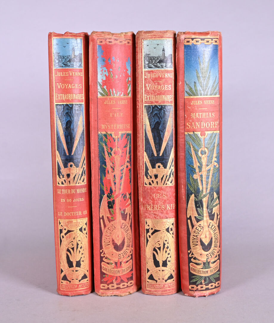 Ensemble de 4 livres reliés JULES VERNE – Voyages extraordinaires, l’île mystérieuse, Mathias Sandorf, le tour du monde en 80 jours, les frères kip. Collection HETZEL (usures d’usage).