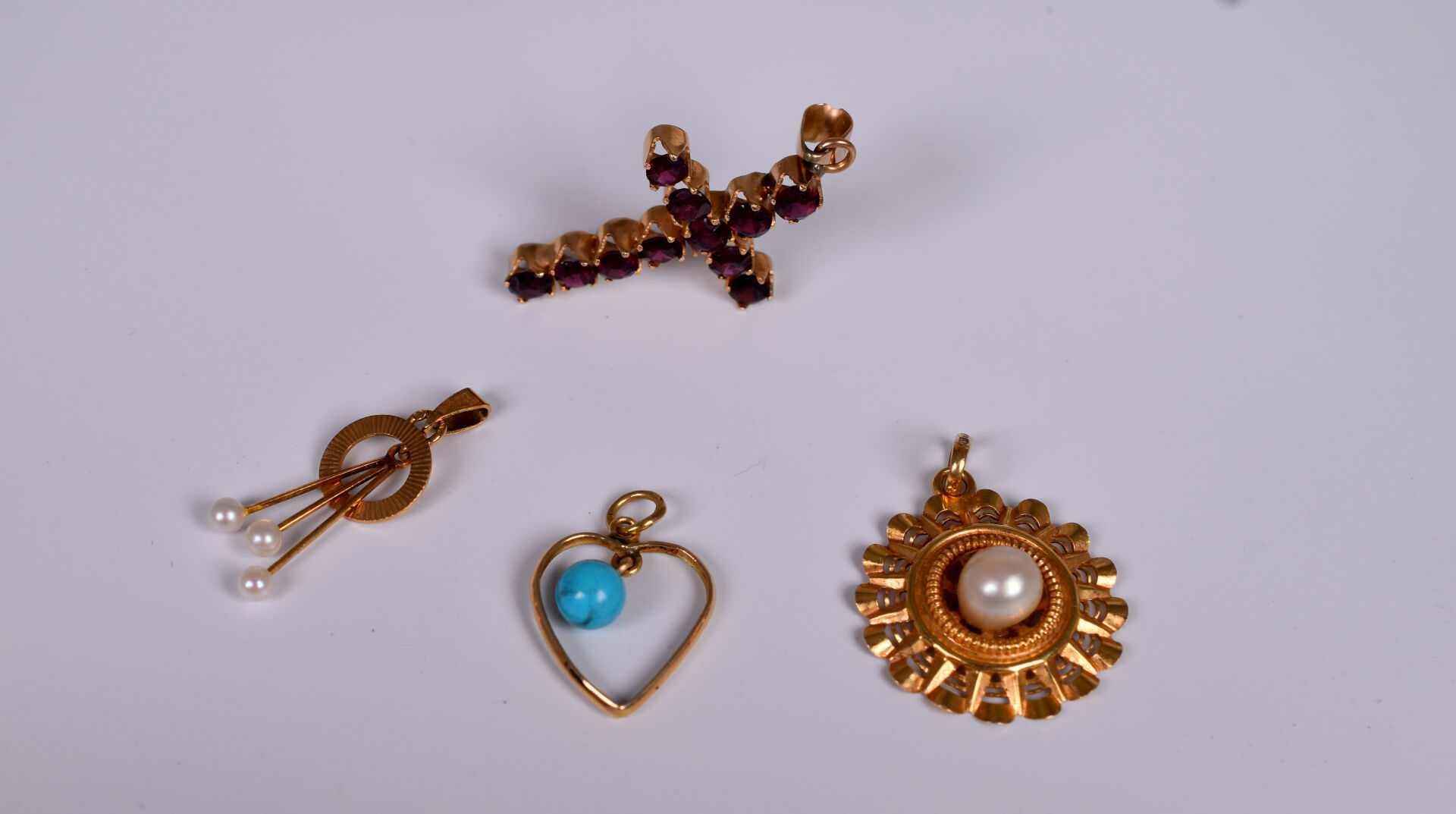 Ensemble de 4 pendentifs dont une croix et un coeur en or 18K 750/1000e, perle de culture, pierres rouges et bleues. Poids brut total : 8,4 g.