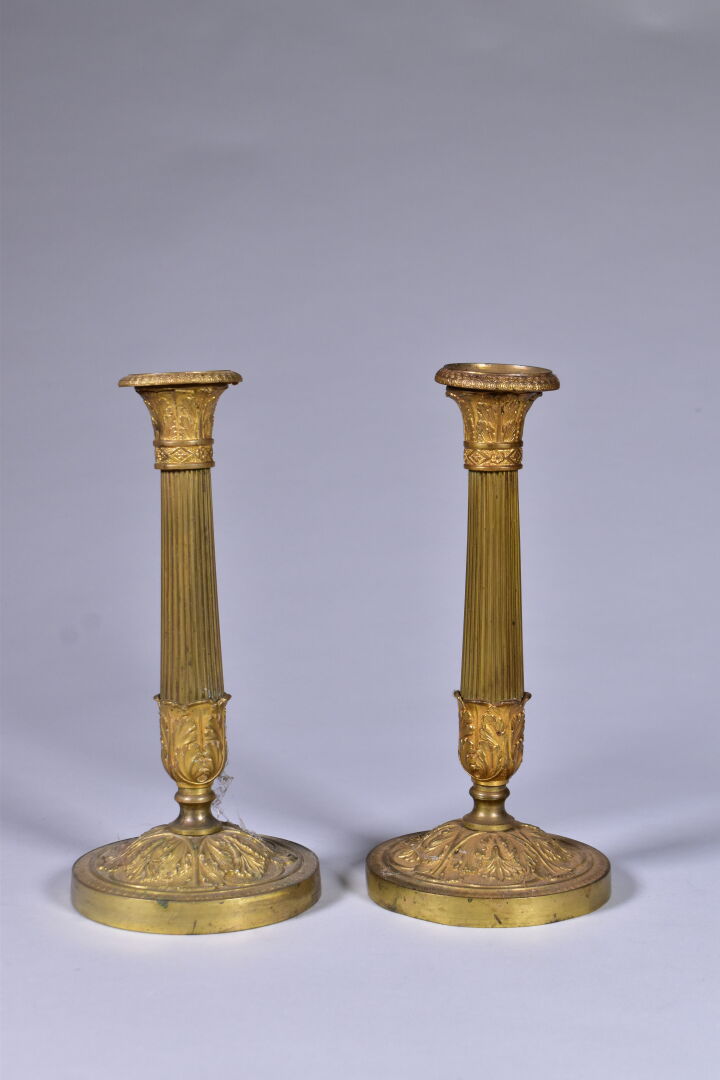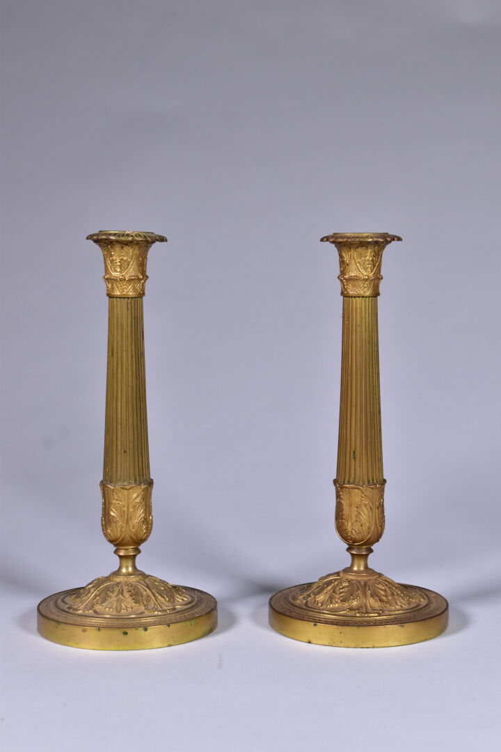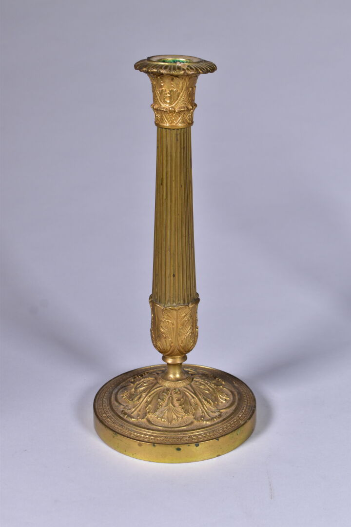 Ensemble de 5 bougeoirs en cuivre, laiton et bronze dont deux paires (un dé-soudé, soudé à l’origine). Celui en bronze tripode terminé par des griffes à décor de couronnes de fruits. Fin du XIXe siècle. Haut. : 33 cm pour celui en bronze.
