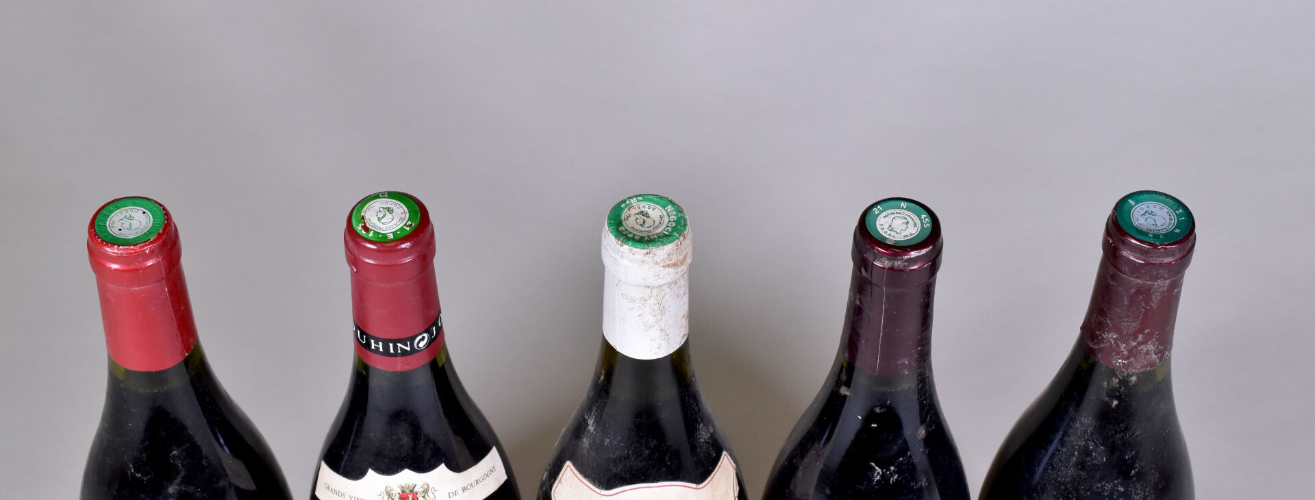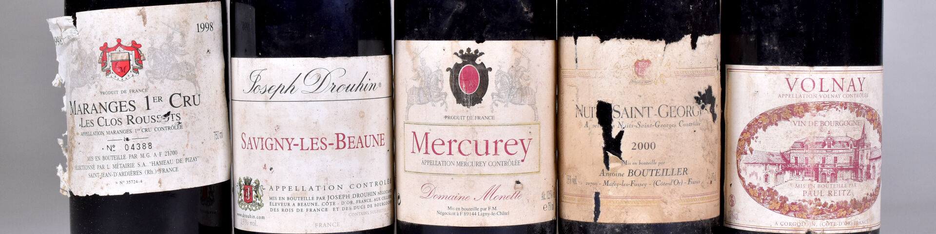 Ensemble de 5 bouteilles composé de : – 1 bouteille, Nuits-Saint-Georges, Antoine Bouteiller, 2000. Étiquette sale et dégradée. – 1 bouteille, Savigny-les-Beaune, Joseph Drouhin, 2005. Étiquette légèrement sale et avec des traces d’humidité. – 1 bouteille, Volnay, Paul Reitz, 2002. Capsule et étiquette sales. – 1 bouteille, Maranges 1er Cru « Les Clos Roussots », L. Métairie, 1998. Étiquette sale et dégradée. – 1 bouteille, Mercurey, Domaine Monette, 1994. Capsule, collerette et étiquette sales.