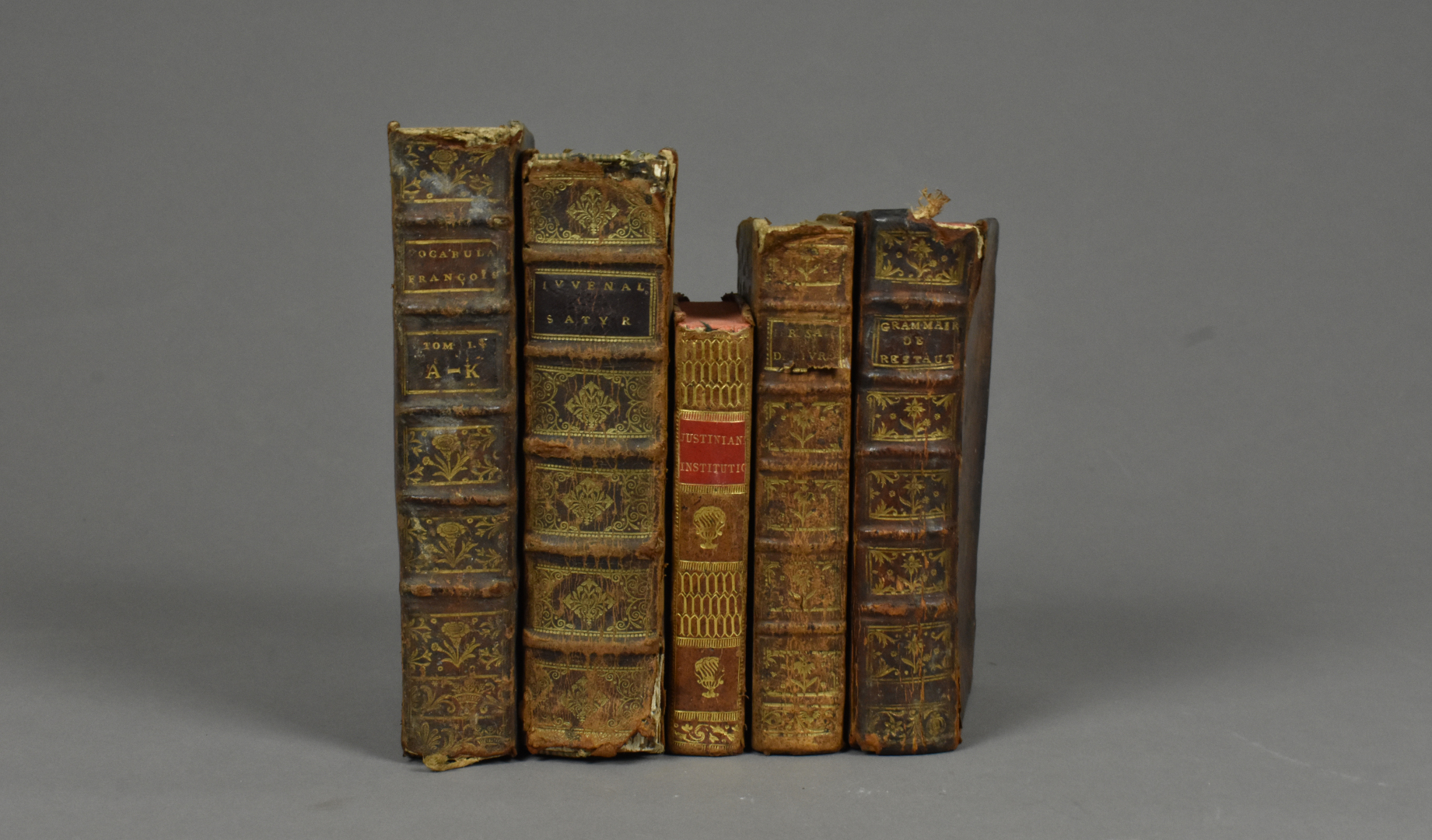 Ensemble de 5 ouvrages soit RESTAUT M., Principes généraux et raisonnés de la grammaire françoise. Lyon – chez Les Frères Perisse. 1782. 1 vol in-12 – LE TASSE, Jérusalem délivrée. Amsterdam, par la Compagnie. 1 vol in-12. JUSTINIANI.D. Institutiones. Paris, An XIII – 1805. 1 vol in-12. JUNII.D. Juvenalis & Auli Persii flacci Satyrae cum veteris scholiastae & variorum commentariis. Editio nova. Amstelaedami 1684. 1vol. Vocabulaire François ou Abrégé du Dictionnaire de l’Académie Françoise. Paris, Regnard 1771. 1 vol in-8 Tome 1 A-K.